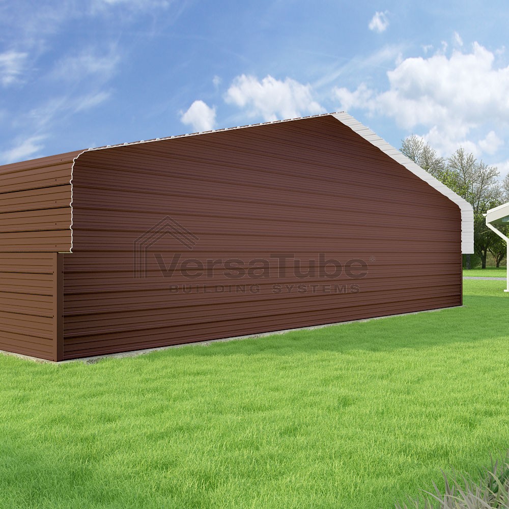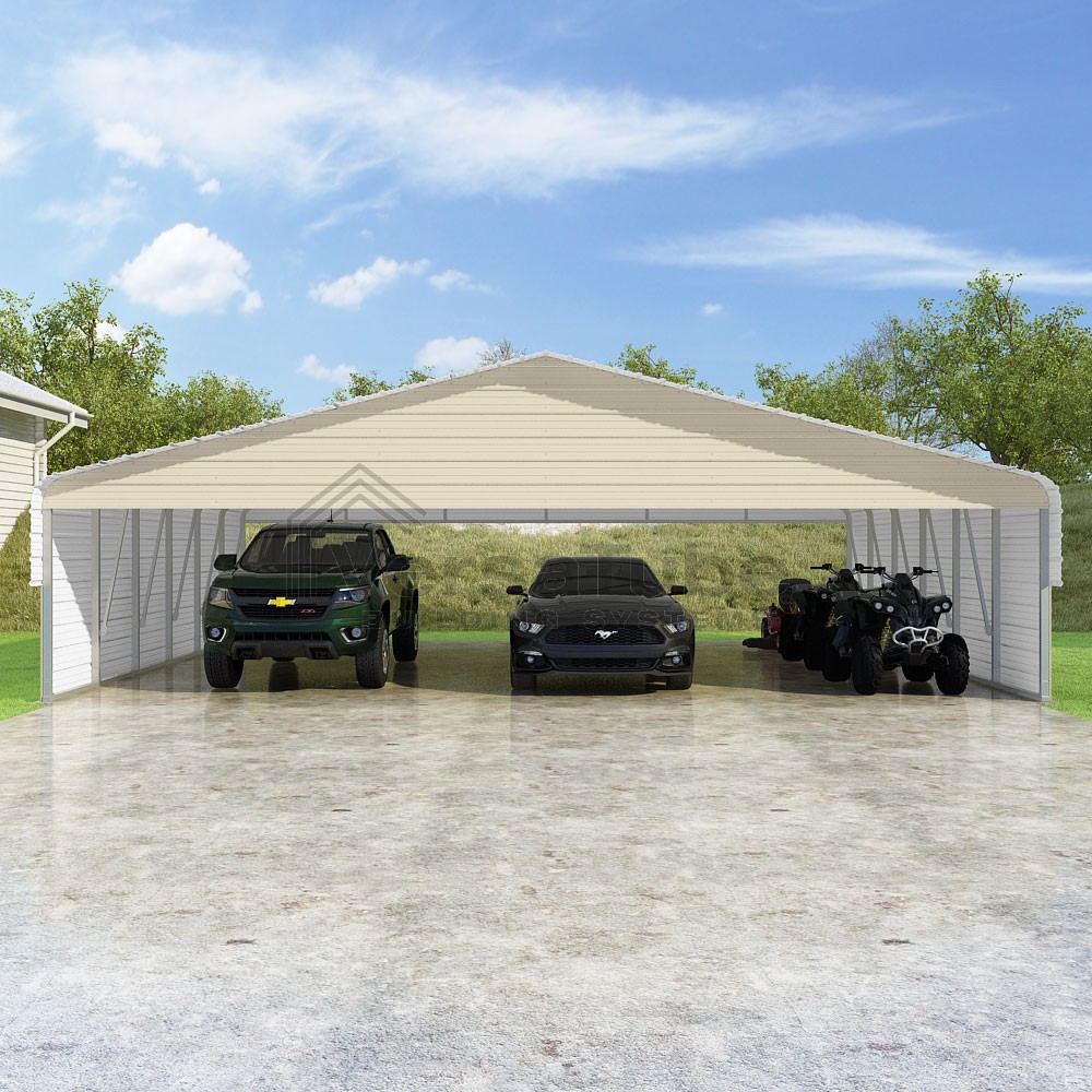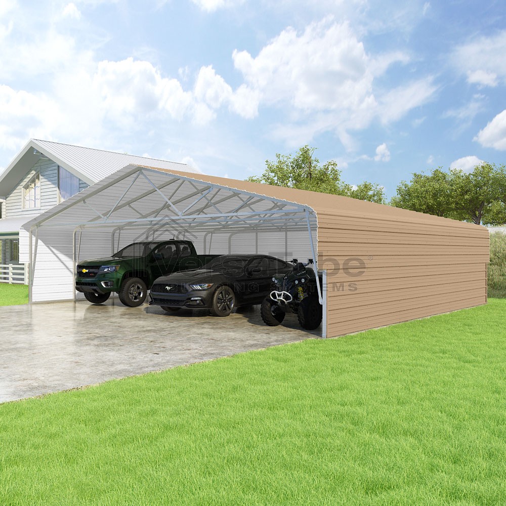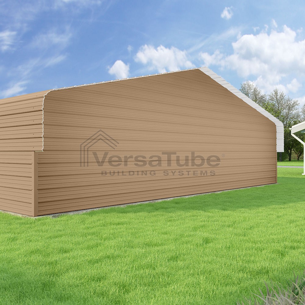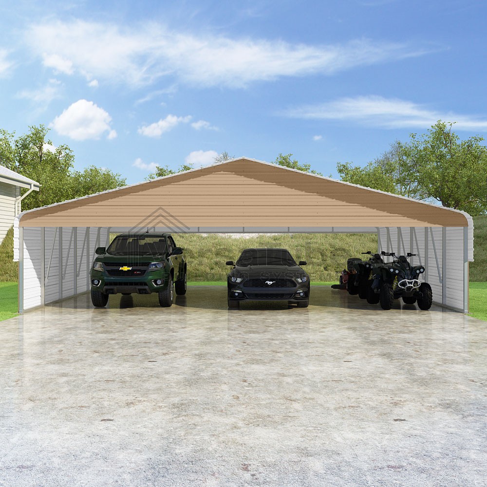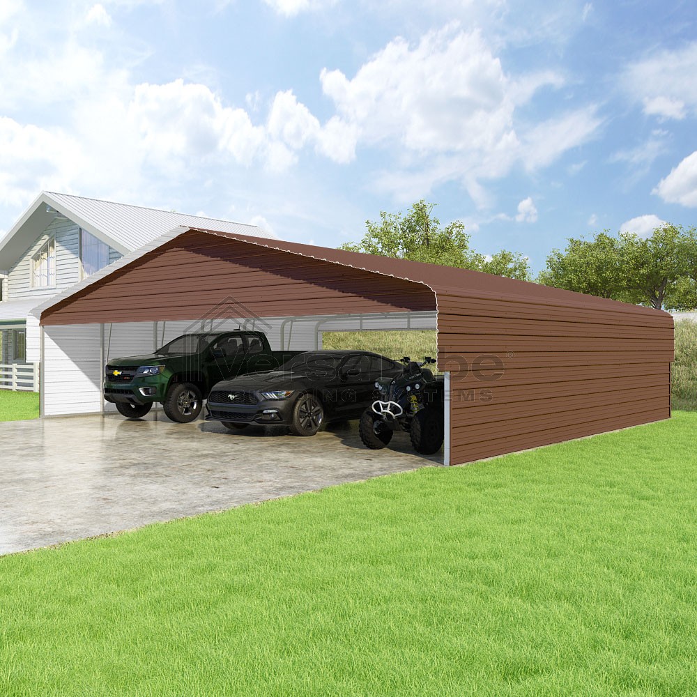 Classic Series DIY carport kit features horizontal application of sheet metal panels with the extra protection of rounded eaves.