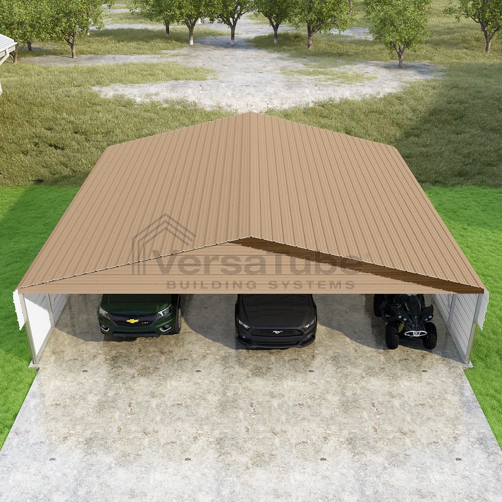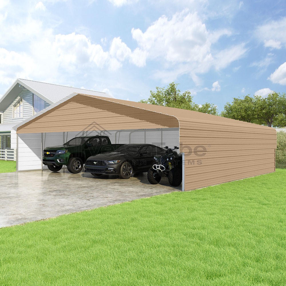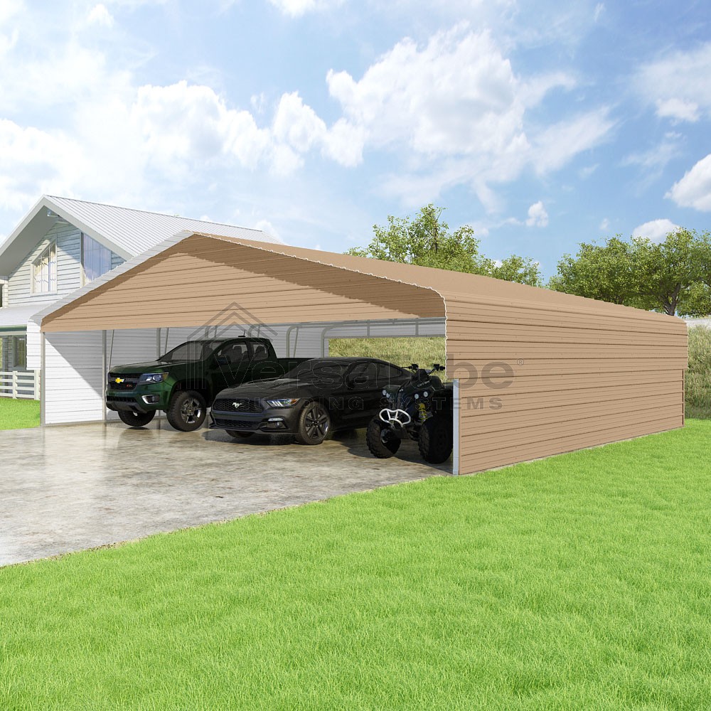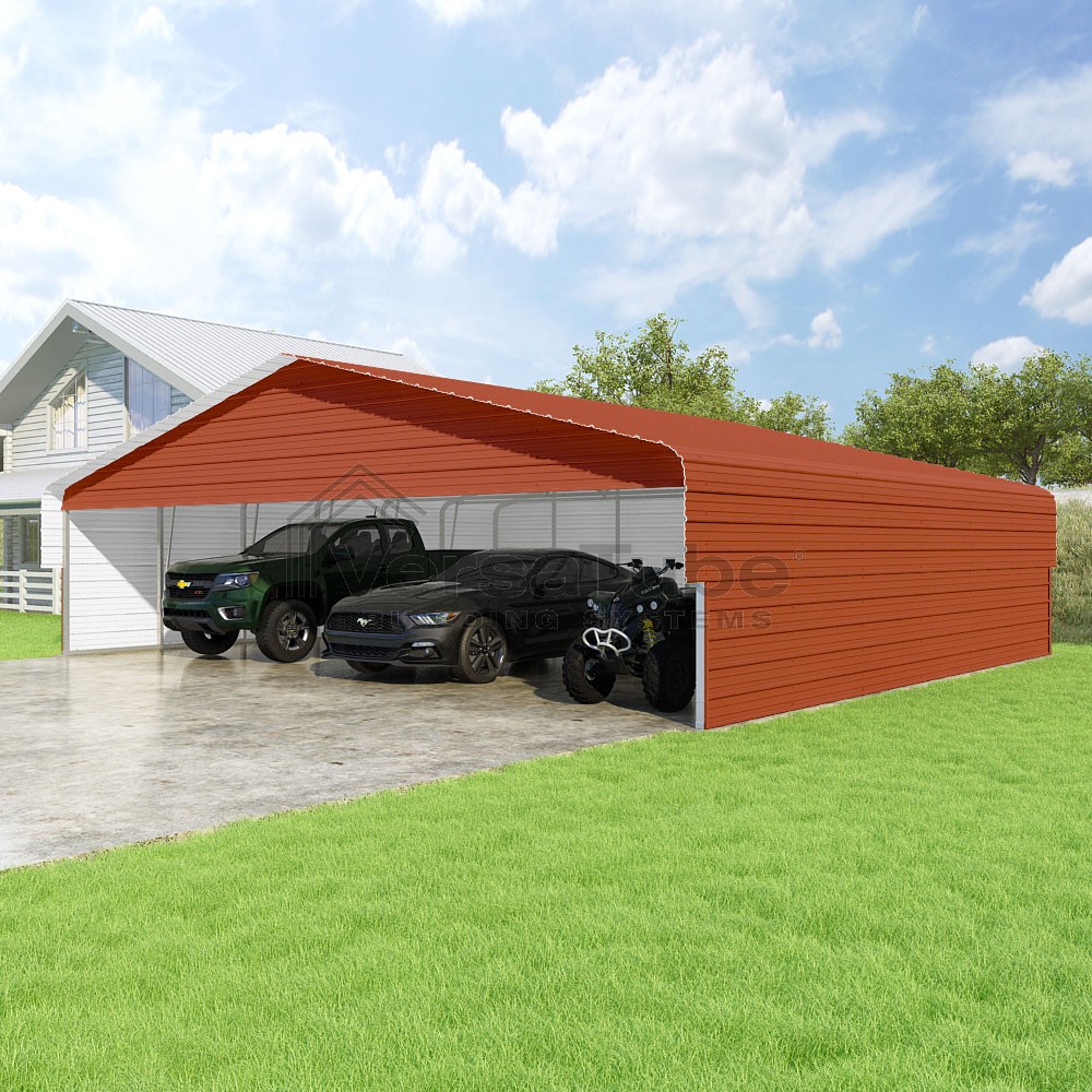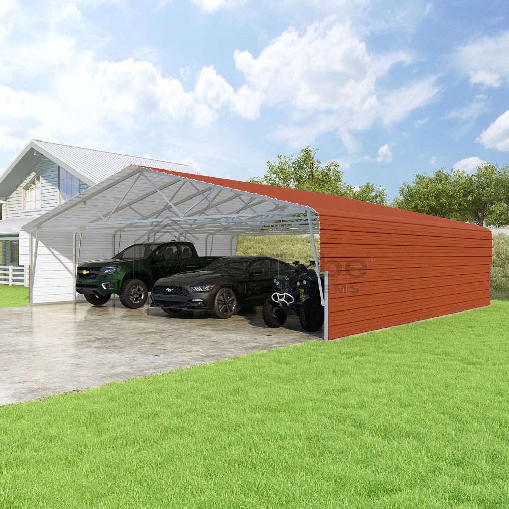 Classic Series DIY carport kit features horizontal application of sheet metal panels with the extra protection of rounded eaves.
