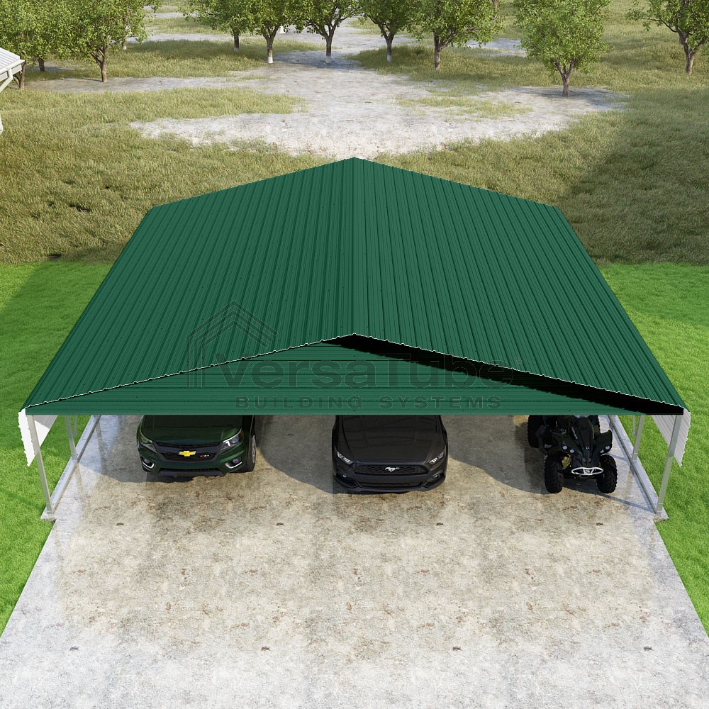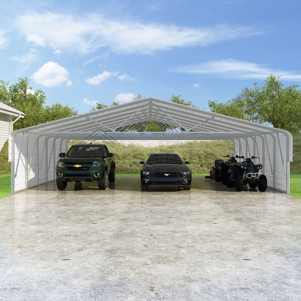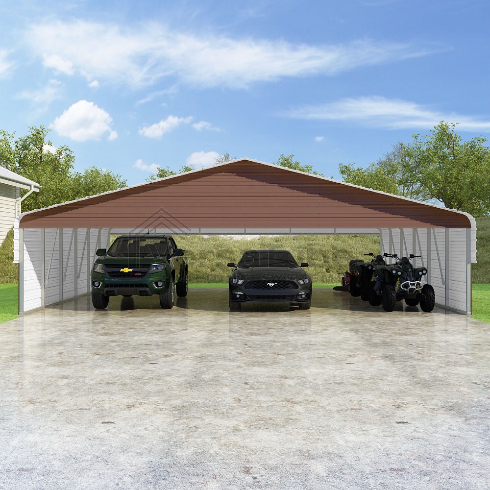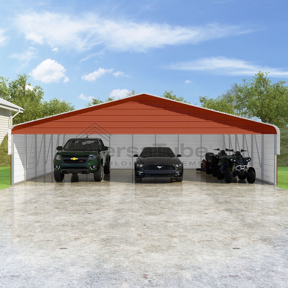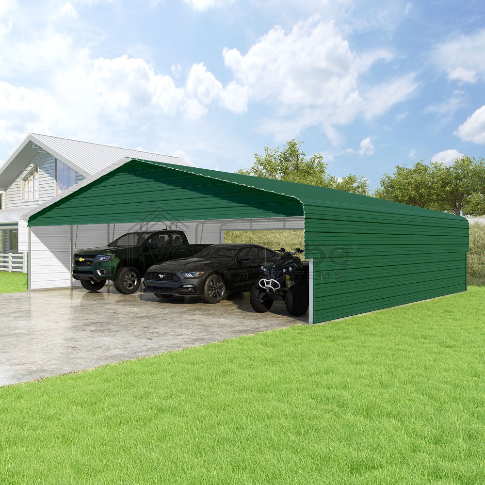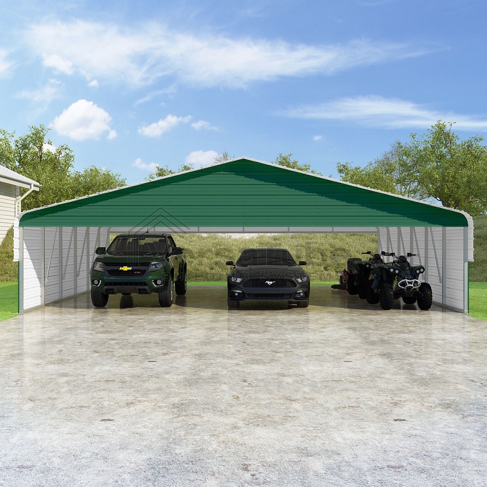 Classic Series DIY carport kit features horizontal application of sheet metal panels with the extra protection of rounded eaves.