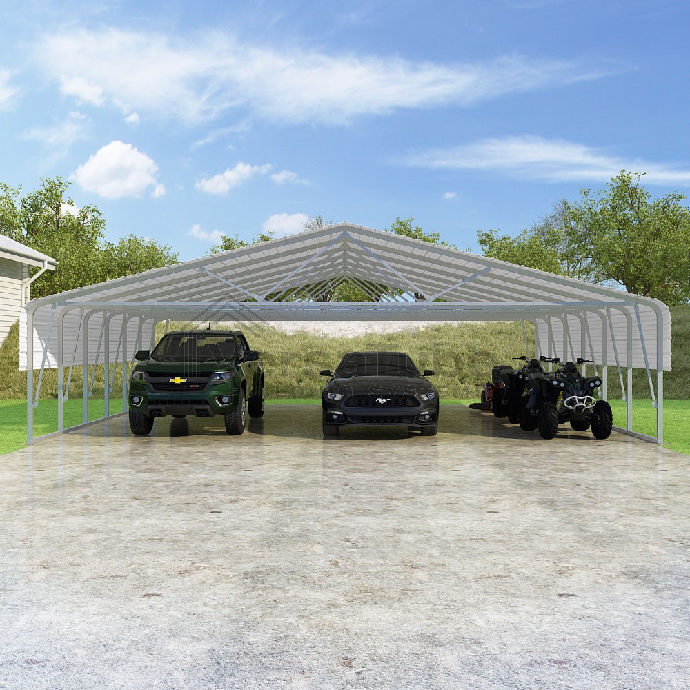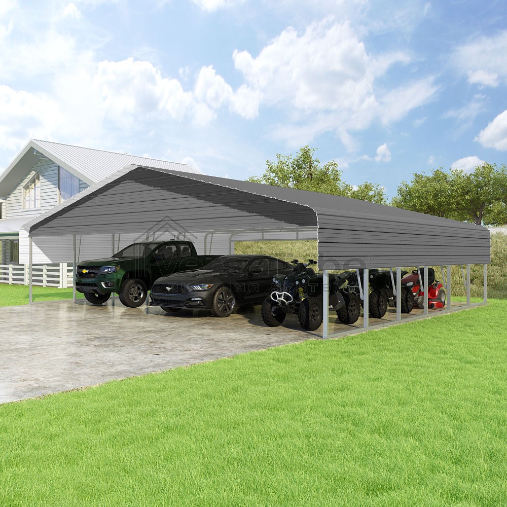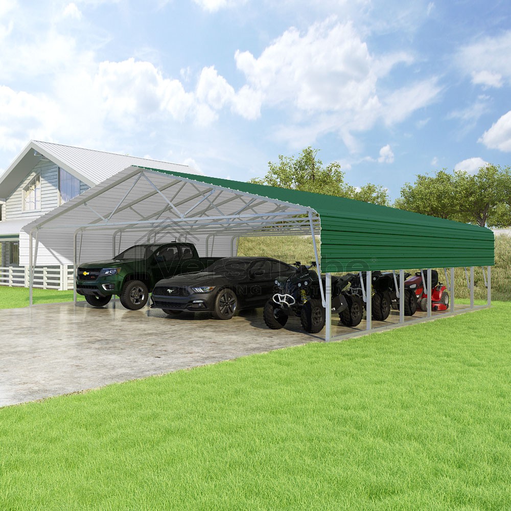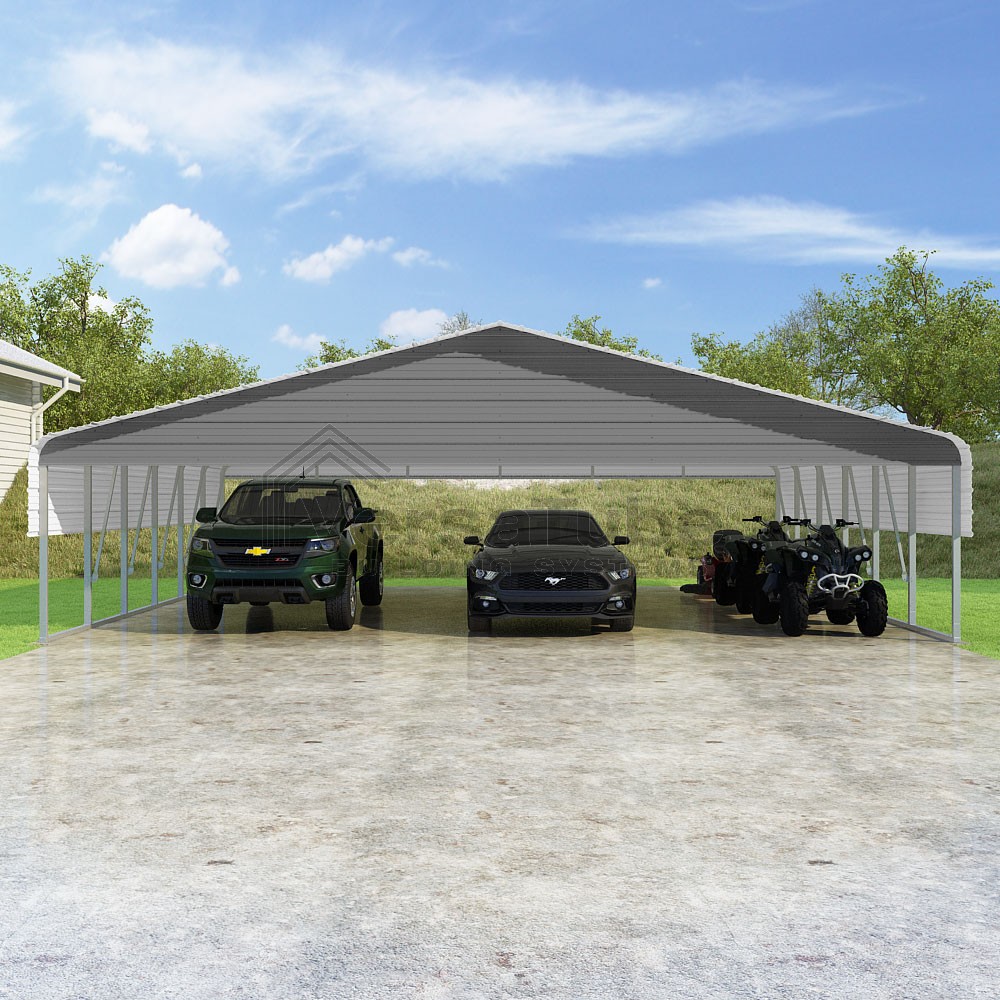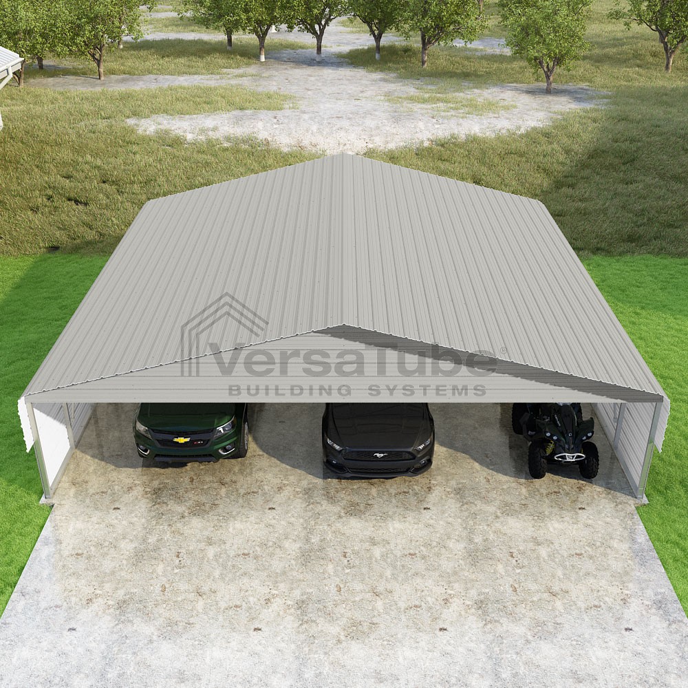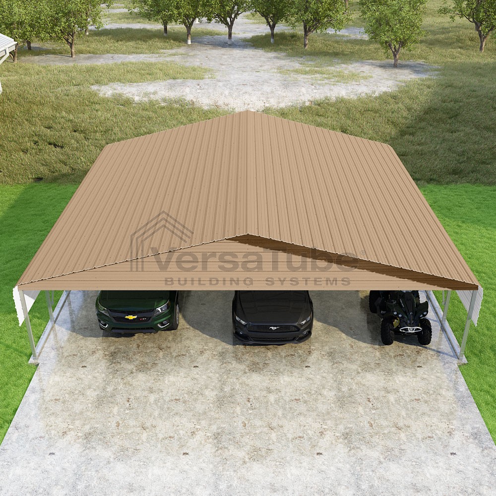 Classic Series DIY carport kit features horizontal application of sheet metal panels with the extra protection of rounded eaves.