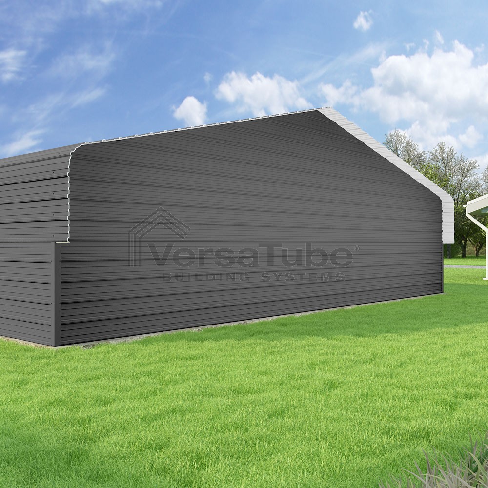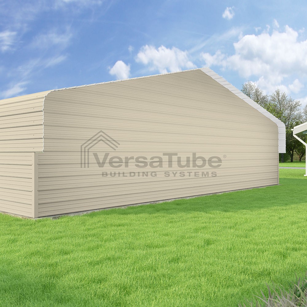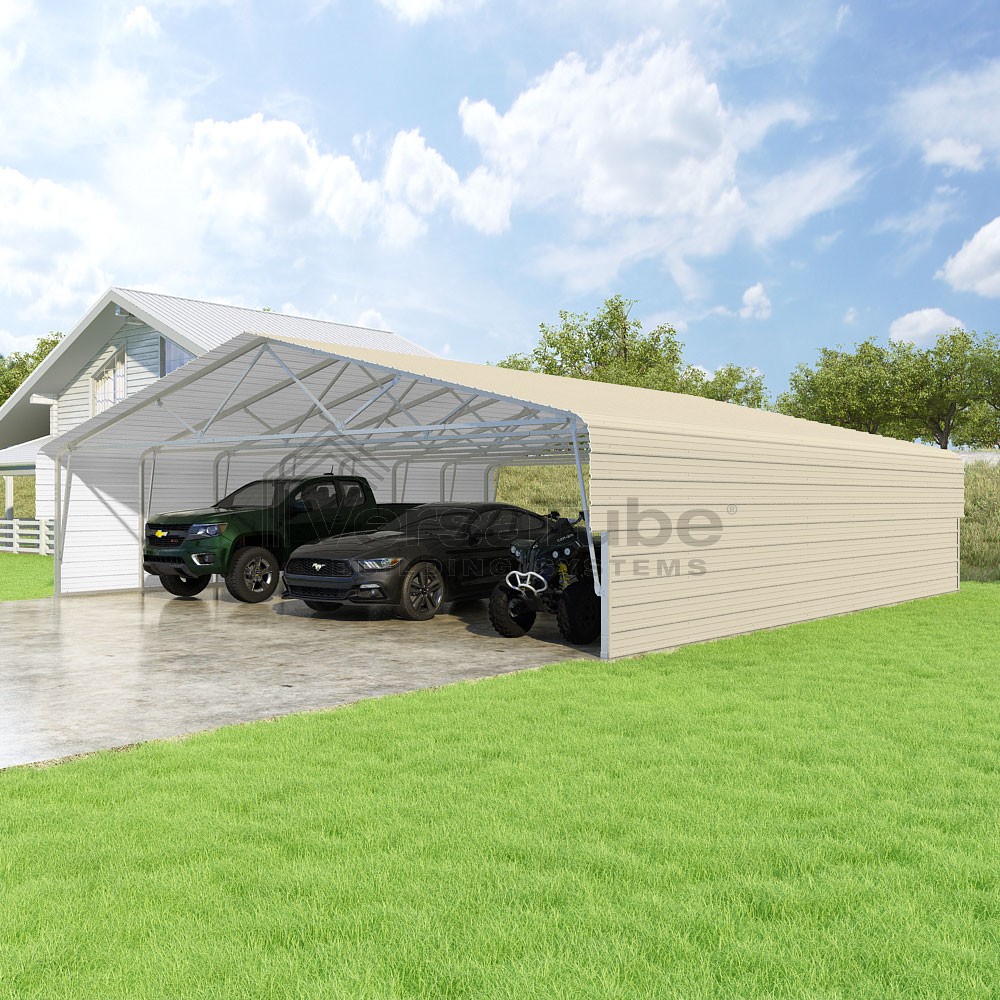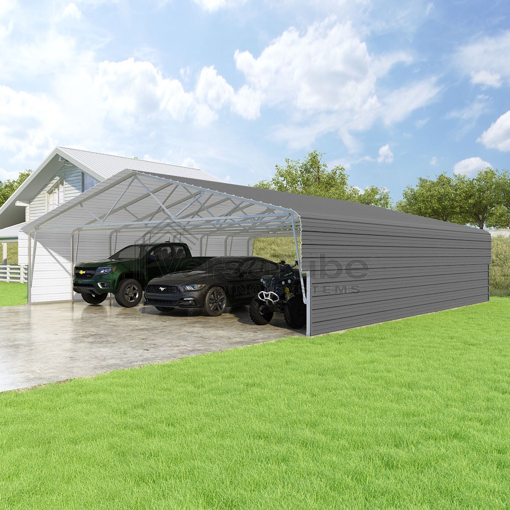 Classic Series DIY carport kit features horizontal application of sheet metal panels with the extra protection of rounded eaves.