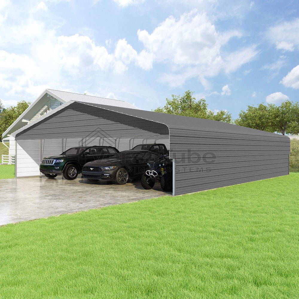 Classic Series DIY carport kit features horizontal application of sheet metal panels with the extra protection of rounded eaves.
