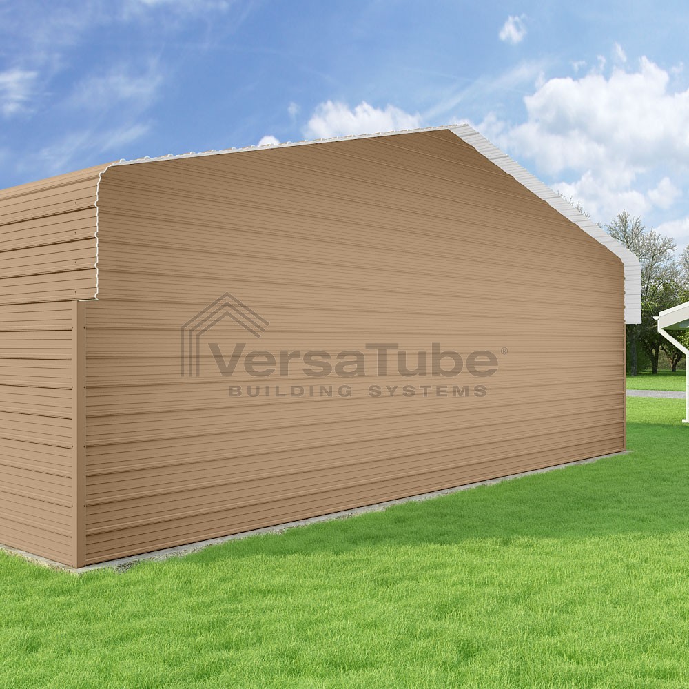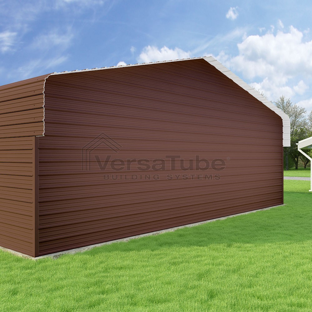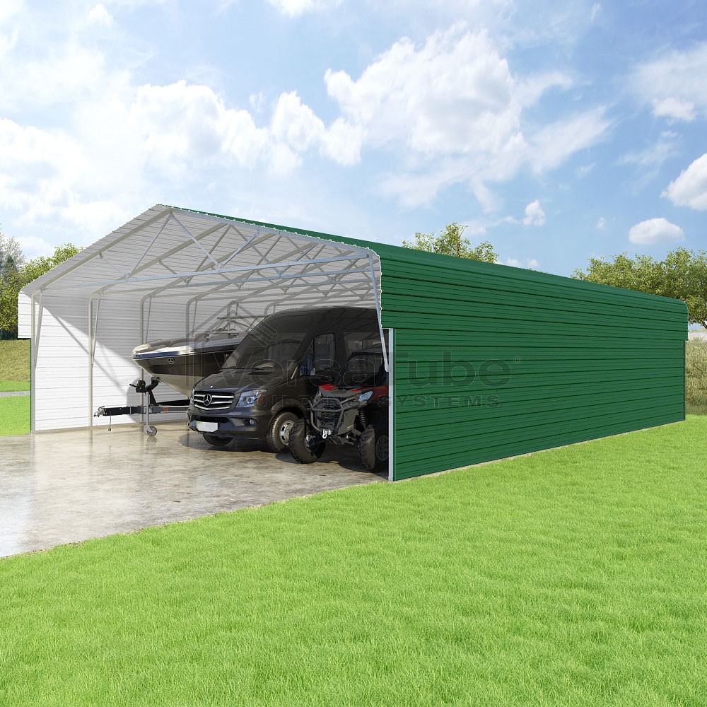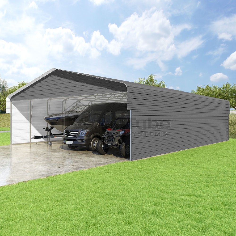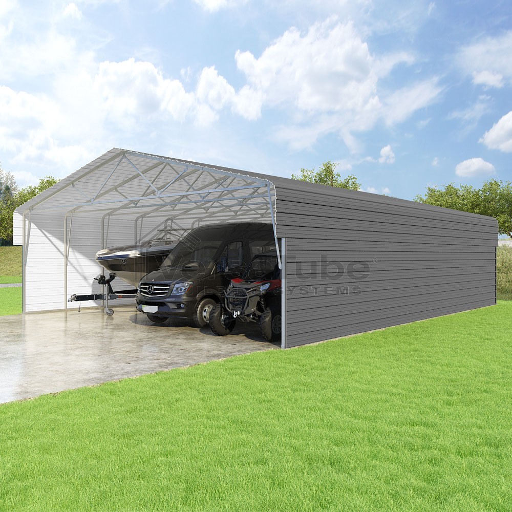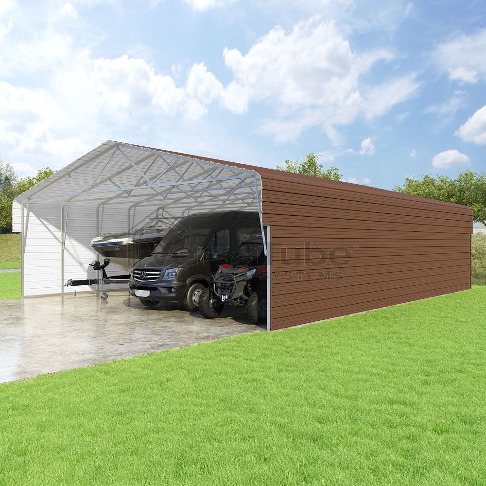 Classic Series DIY carport kit features horizontal application of sheet metal panels with the extra protection of rounded eaves.