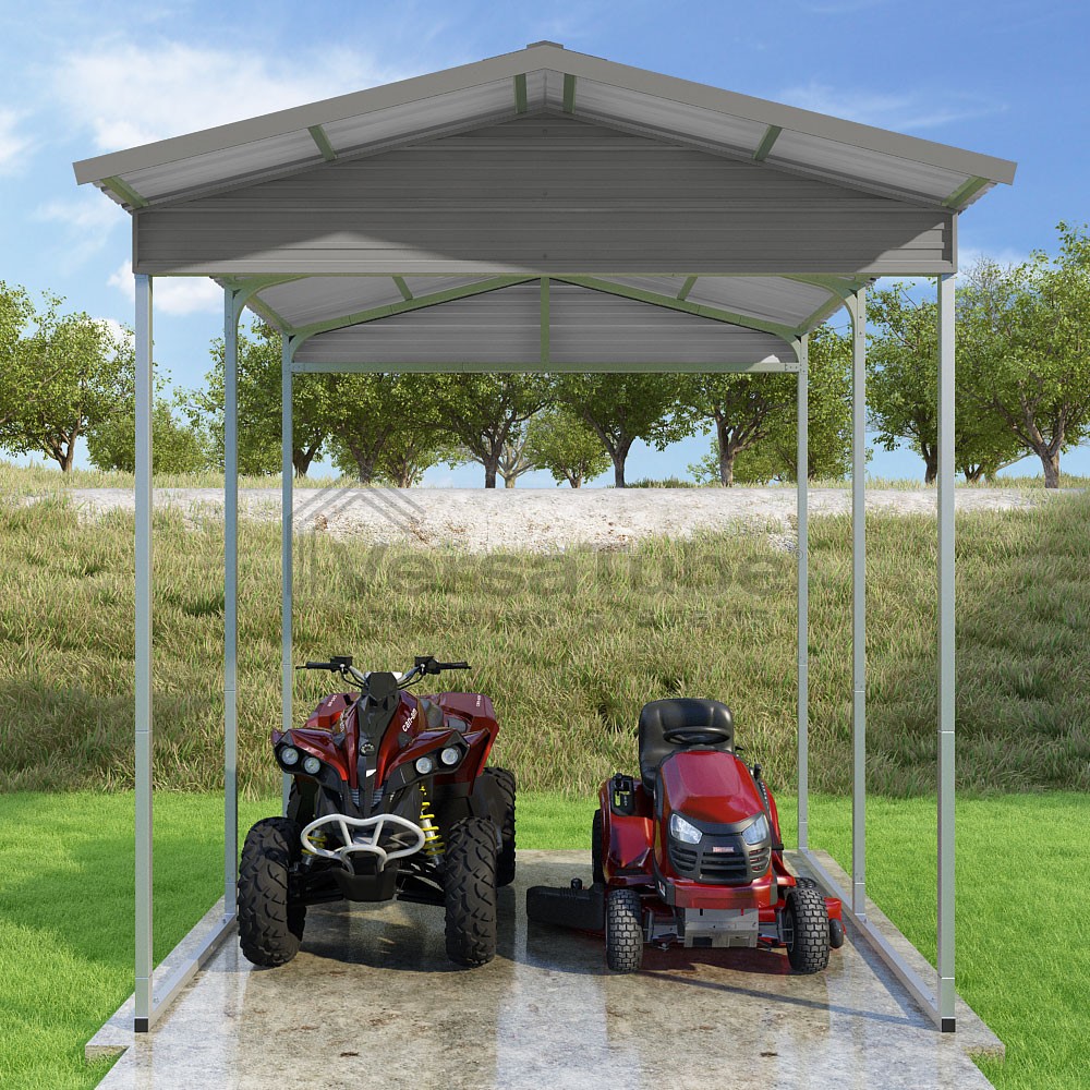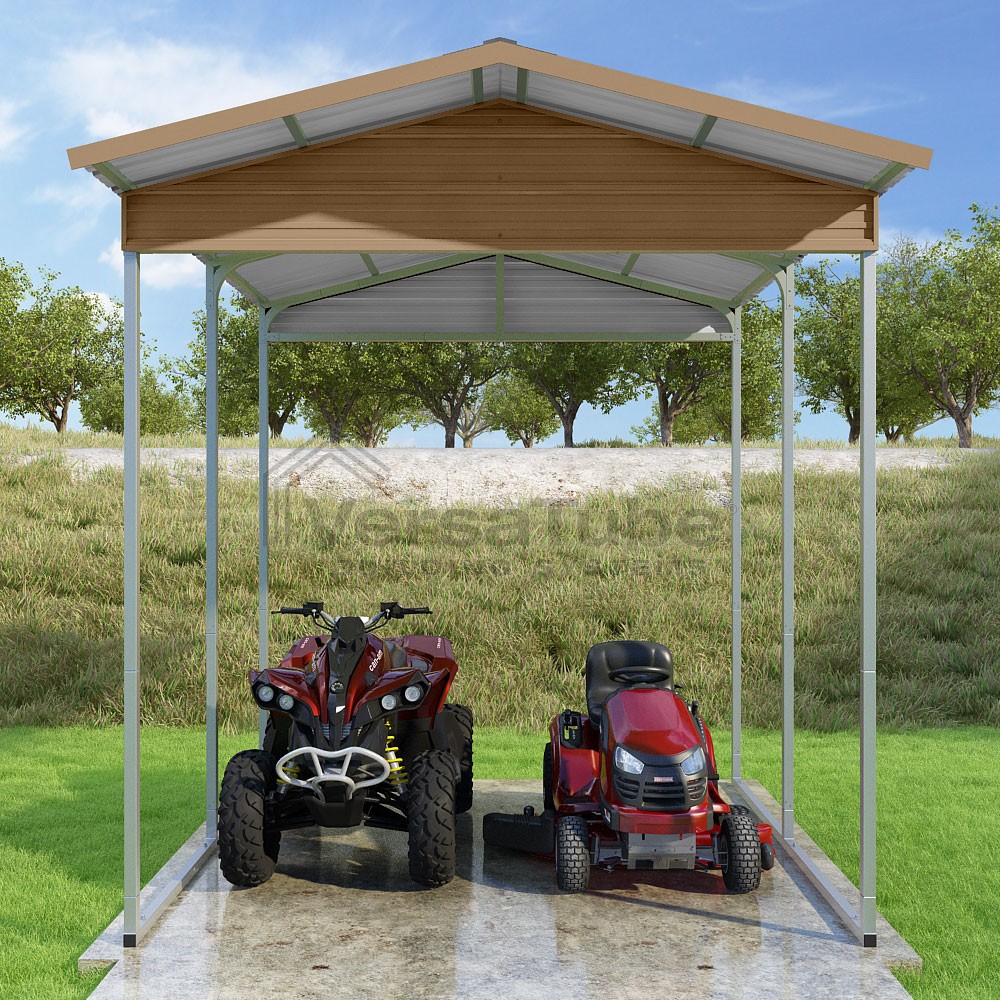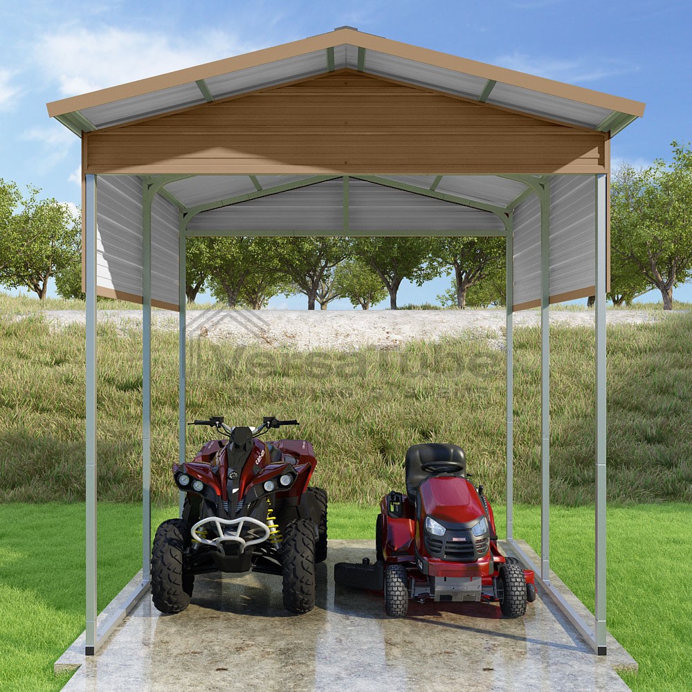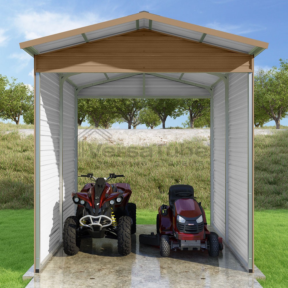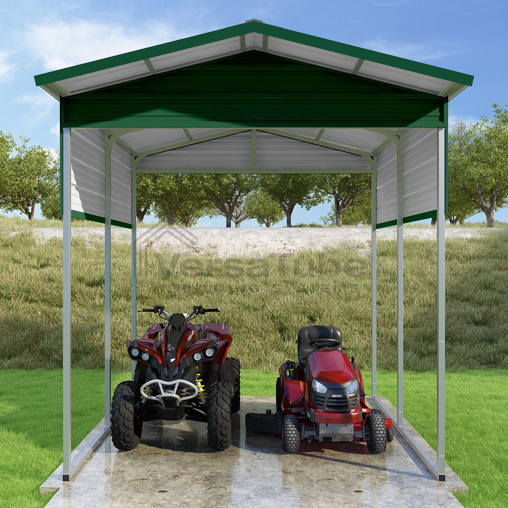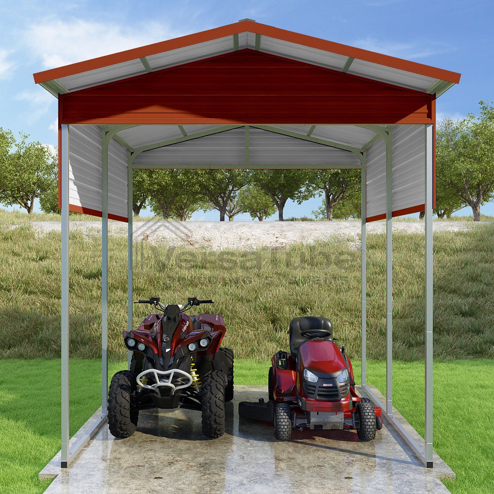 Pinnacle Series DIY carport kit features vertical sheet metal roof panels with ridge cap, gable and eave trim for an A-frame roof style and extended coverage on both ends.