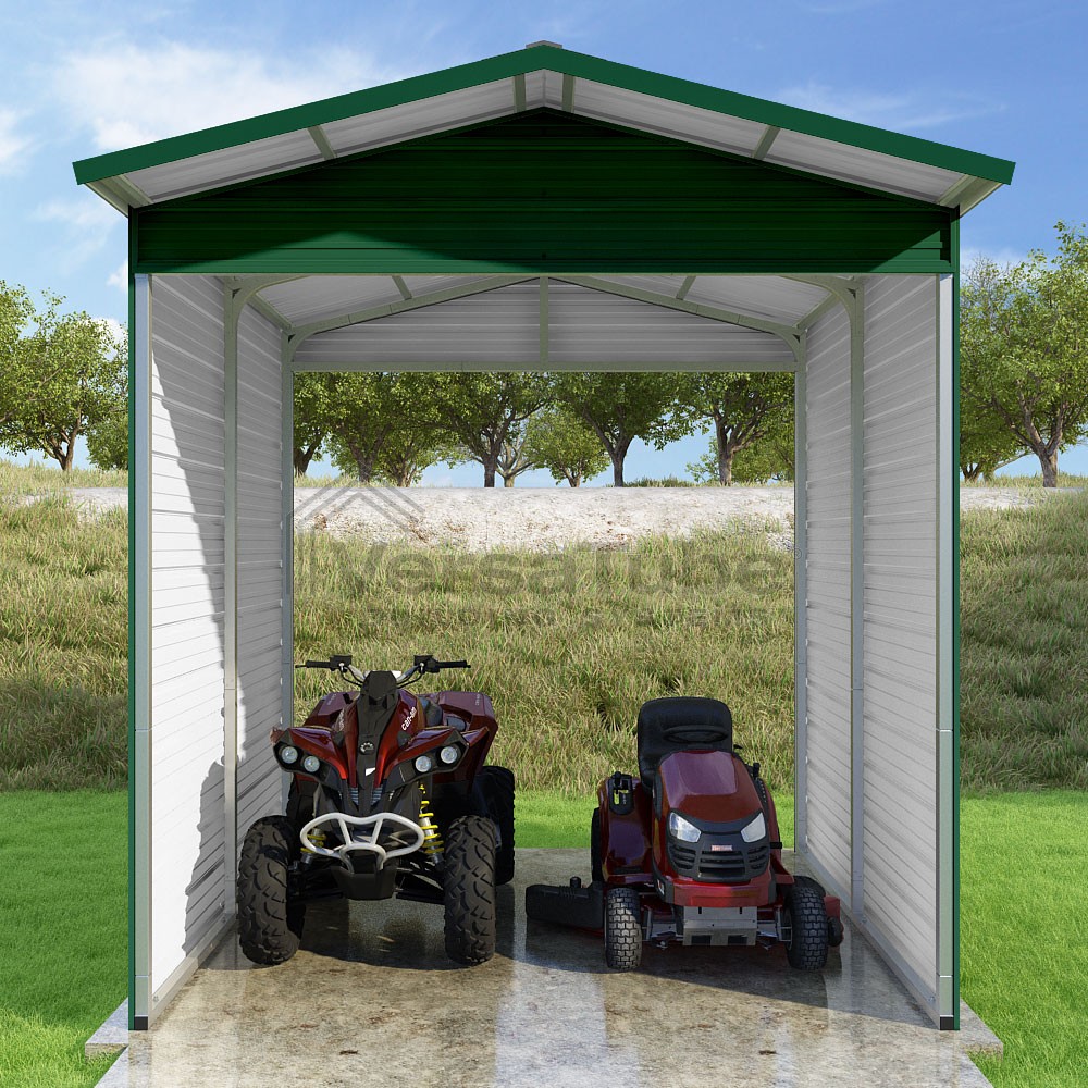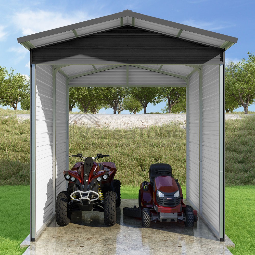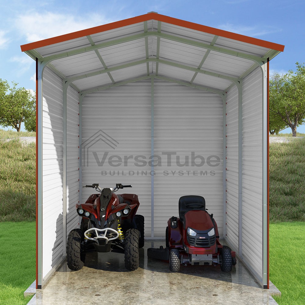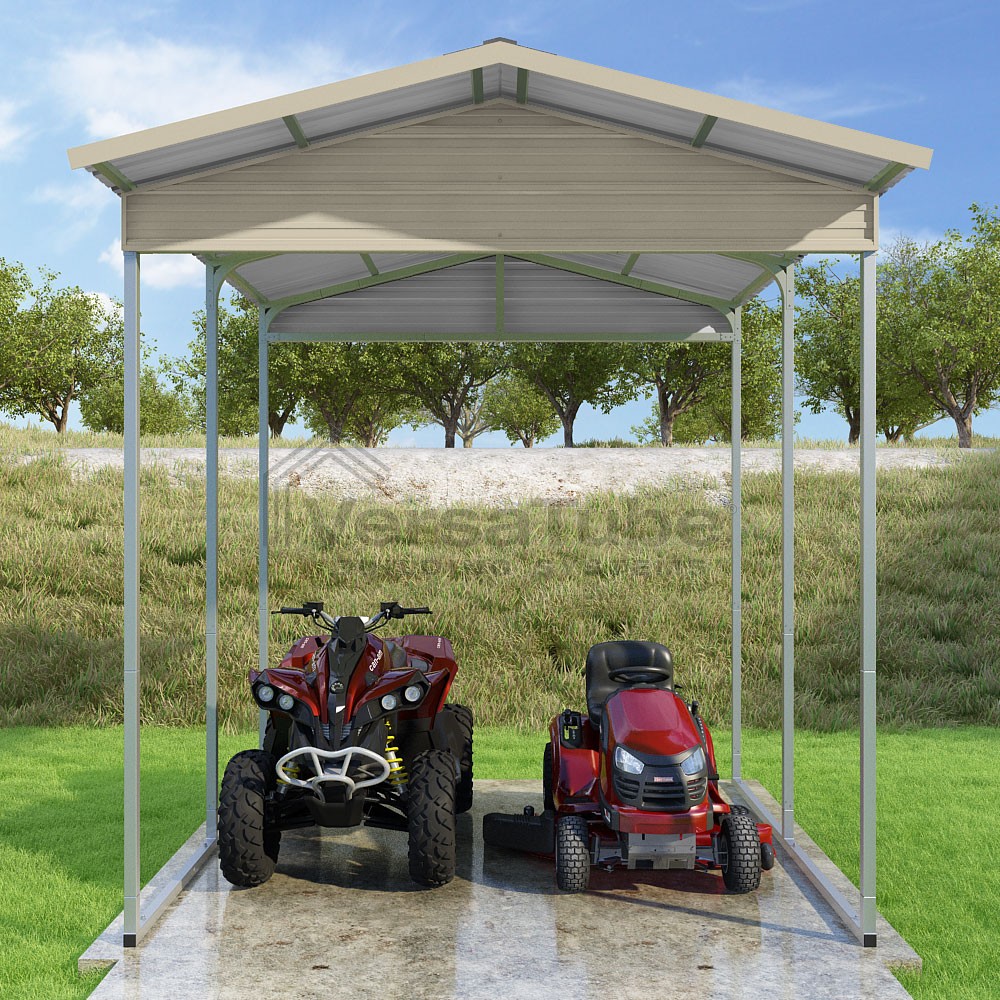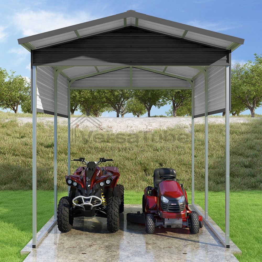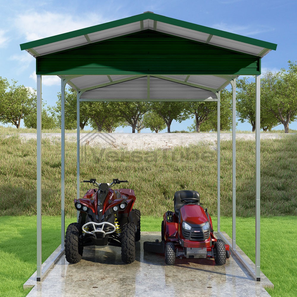 Pinnacle Series DIY carport kit features vertical sheet metal roof panels with ridge cap, gable and eave trim for an A-frame roof style and extended coverage on both ends.