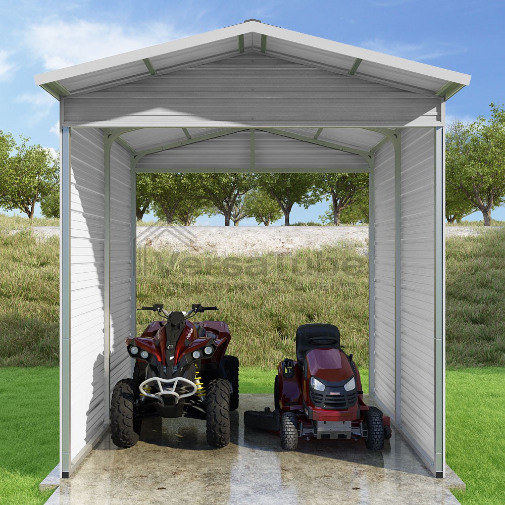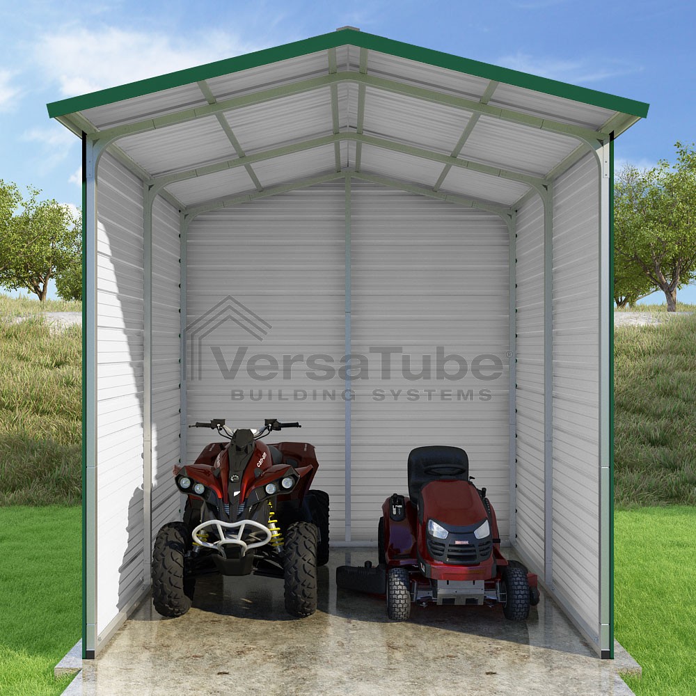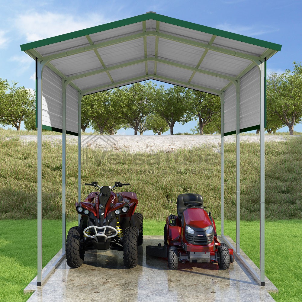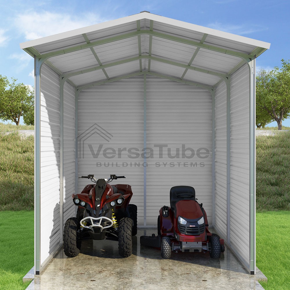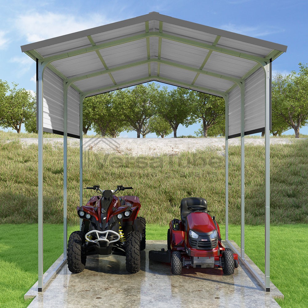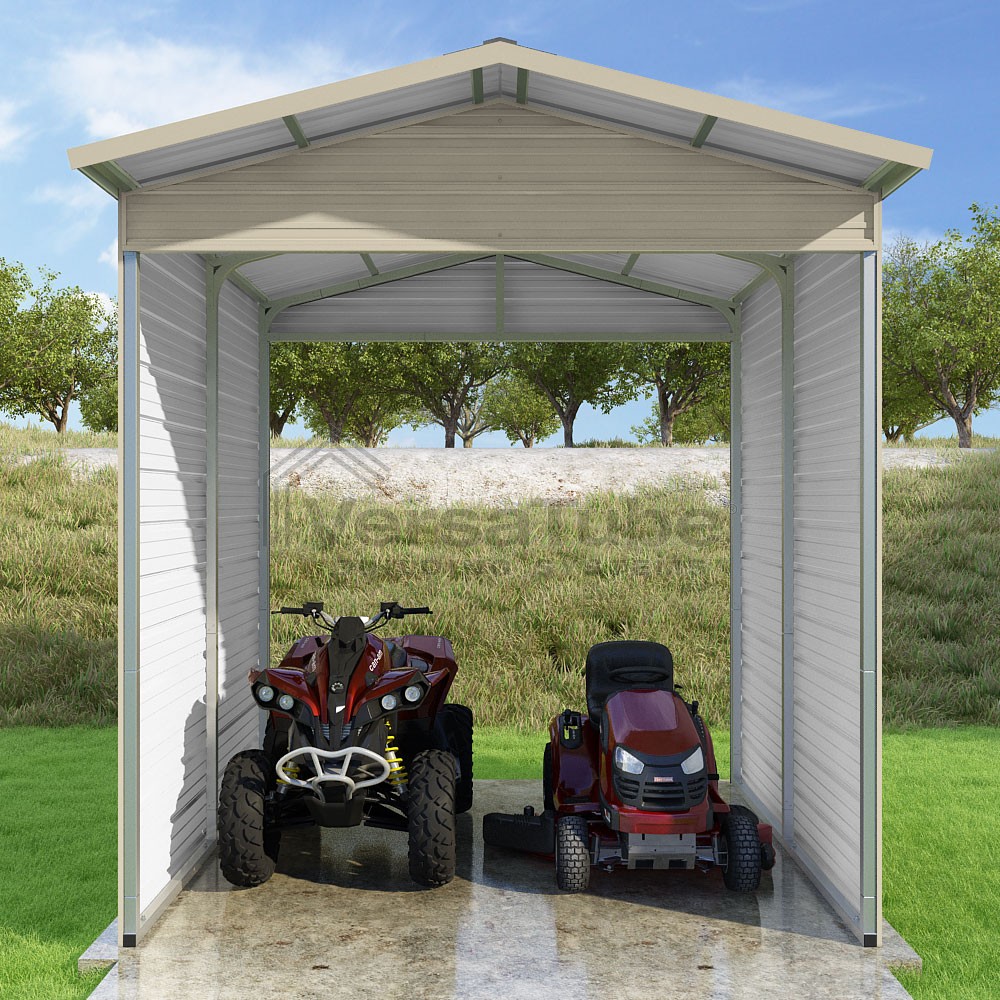 Pinnacle Series DIY carport kit features vertical sheet metal roof panels with ridge cap, gable and eave trim for an A-frame roof style and extended coverage on both ends.