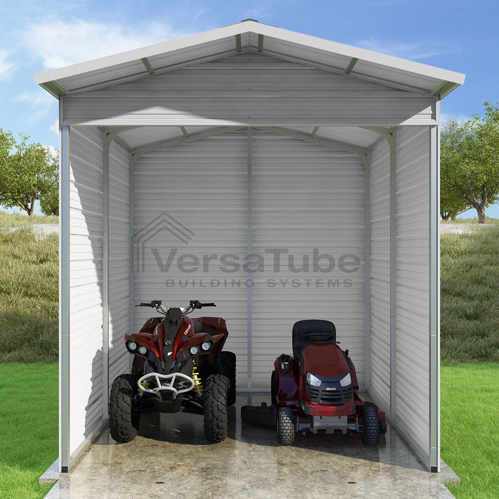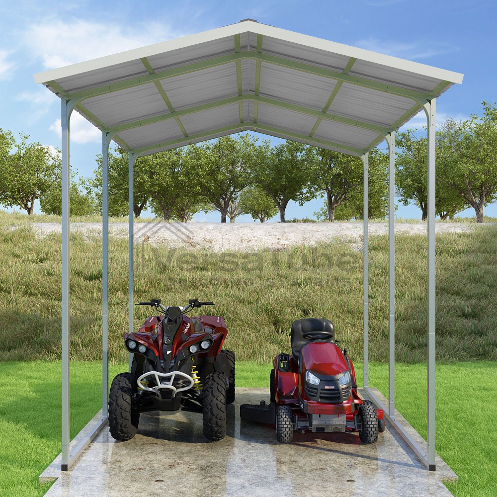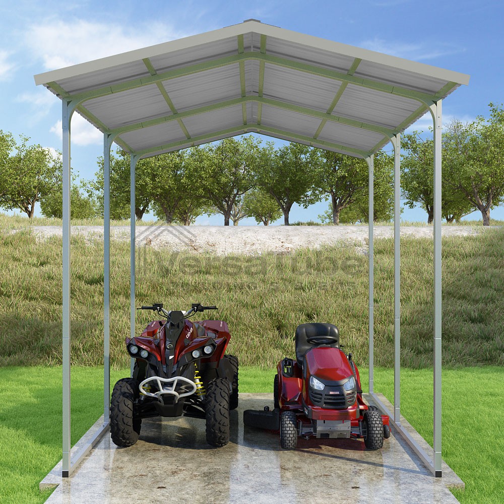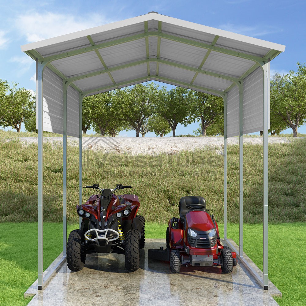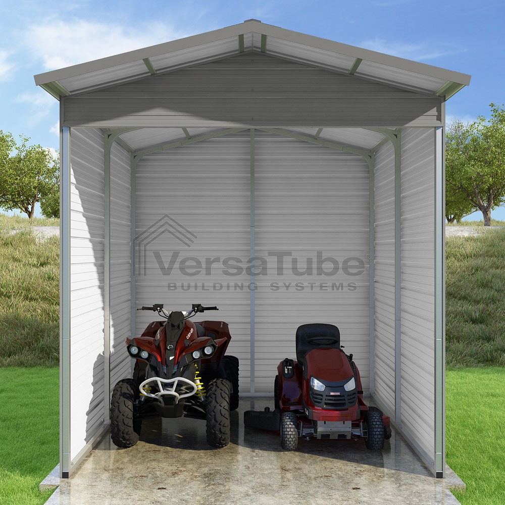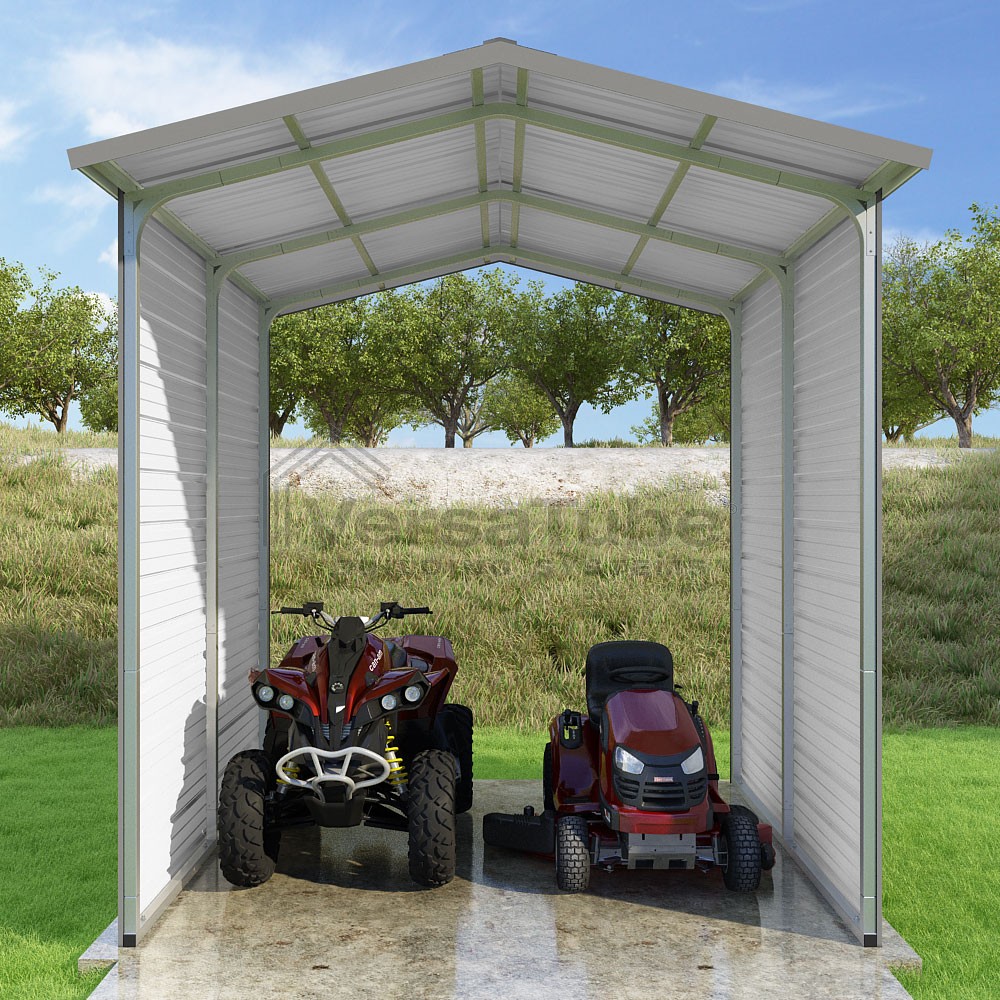 Pinnacle Series DIY carport kit features vertical sheet metal roof panels with ridge cap, gable and eave trim for an A-frame roof style and extended coverage on both ends.