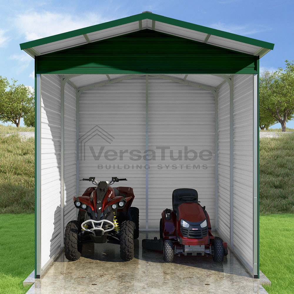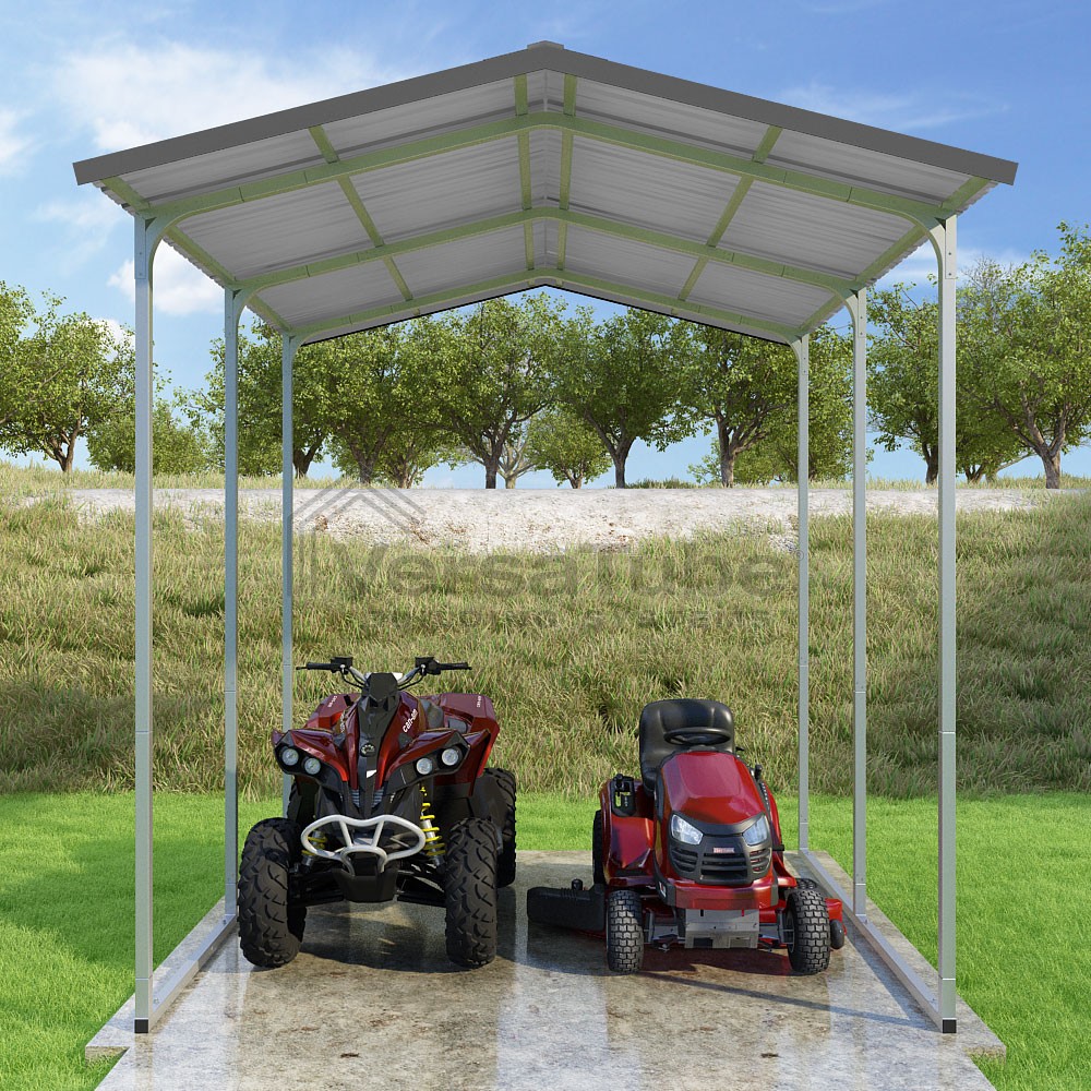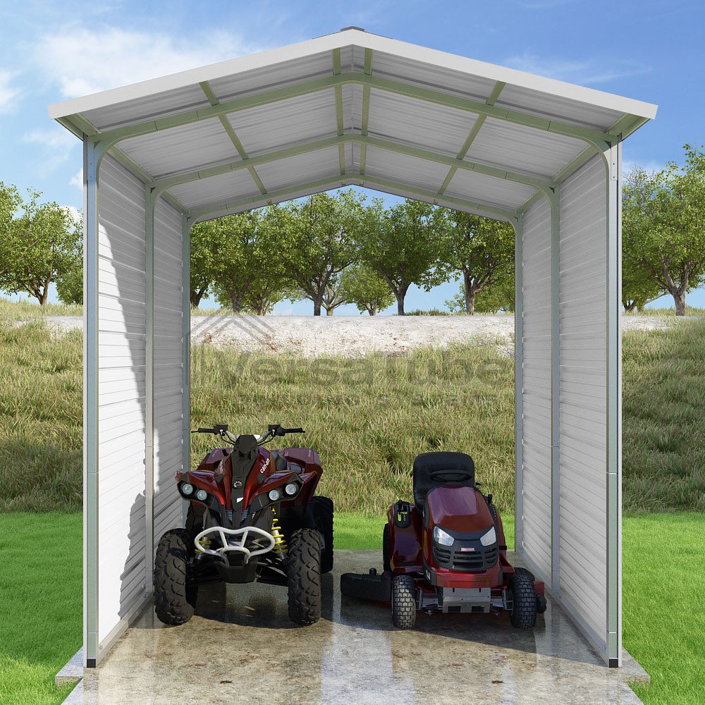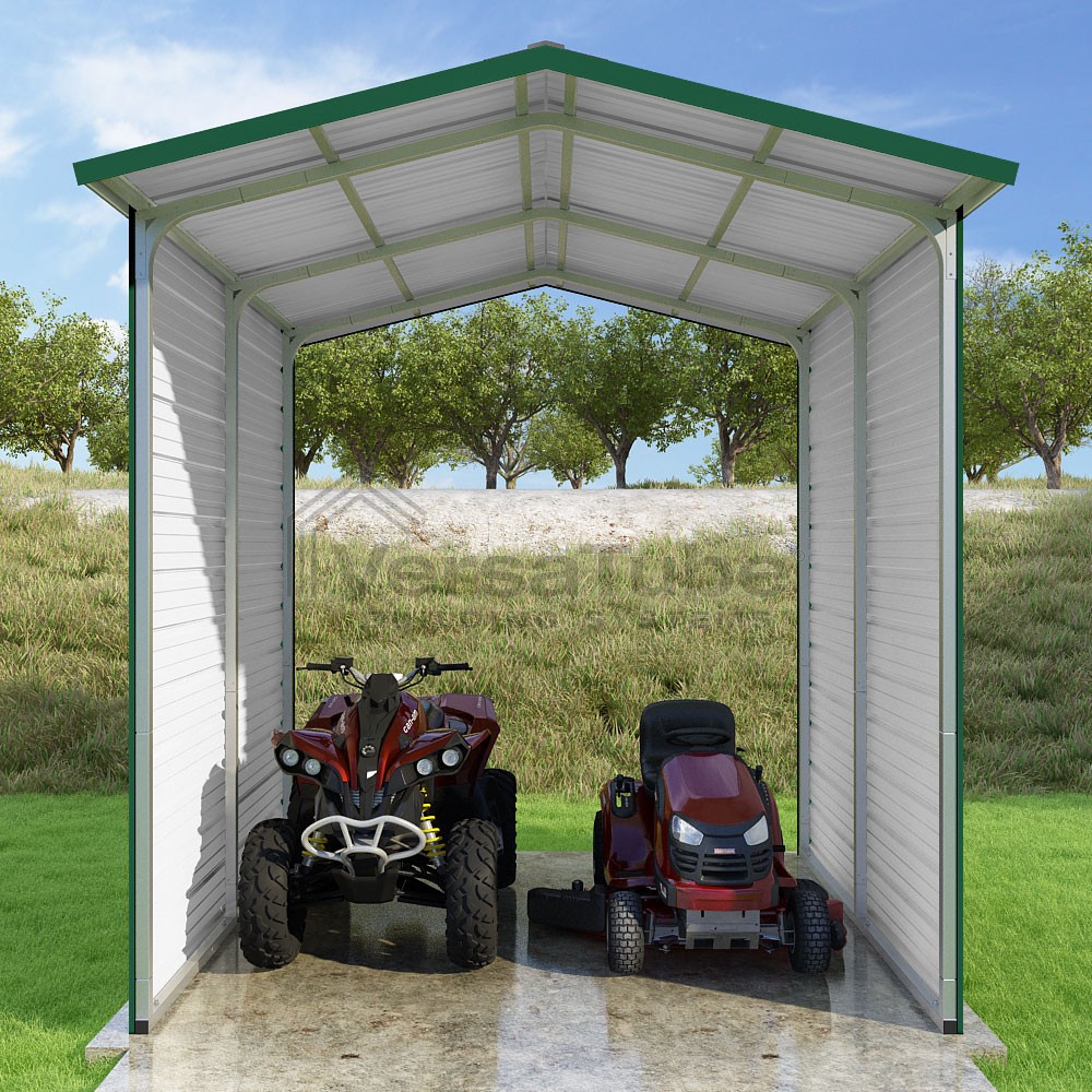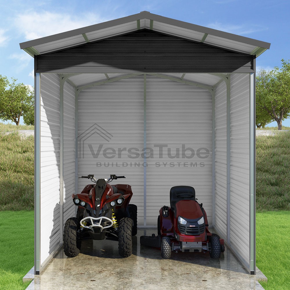 Pinnacle Series DIY carport kit features vertical sheet metal roof panels with ridge cap, gable and eave trim for an A-frame roof style and extended coverage on both ends.