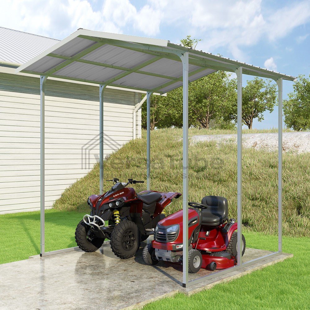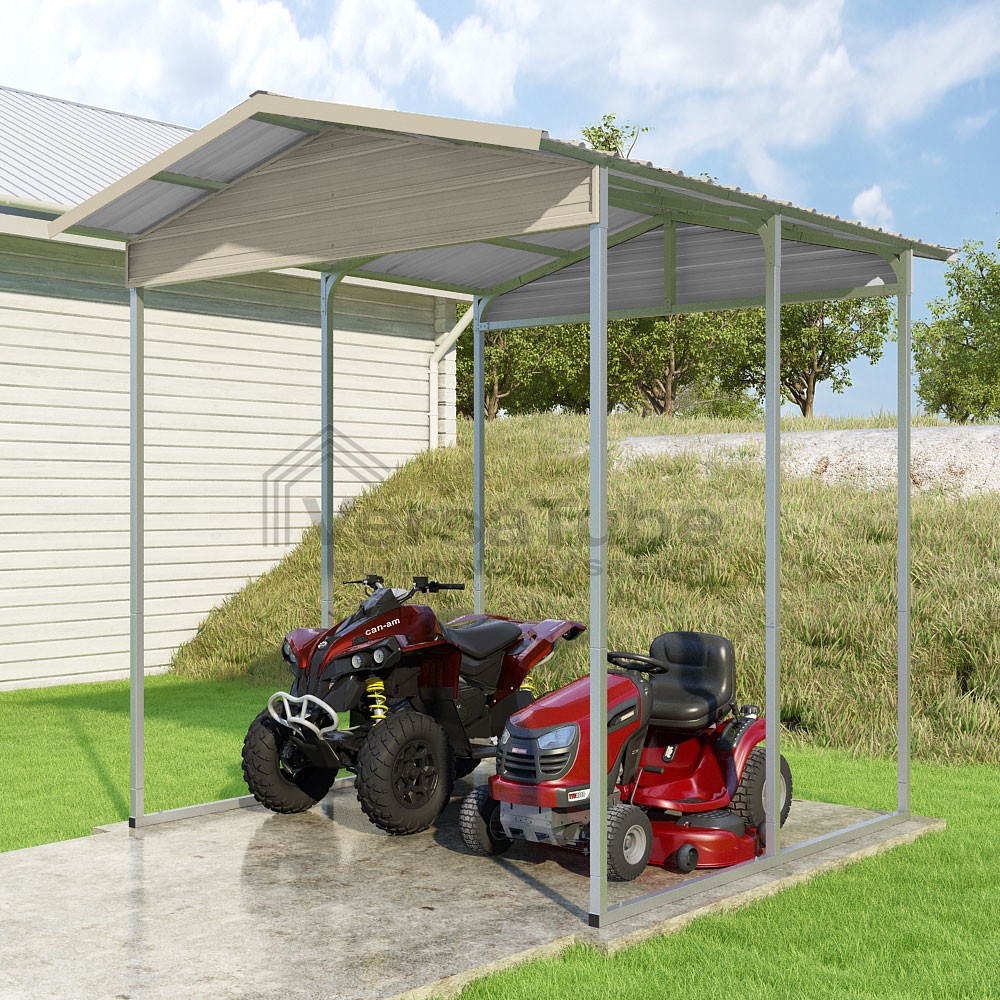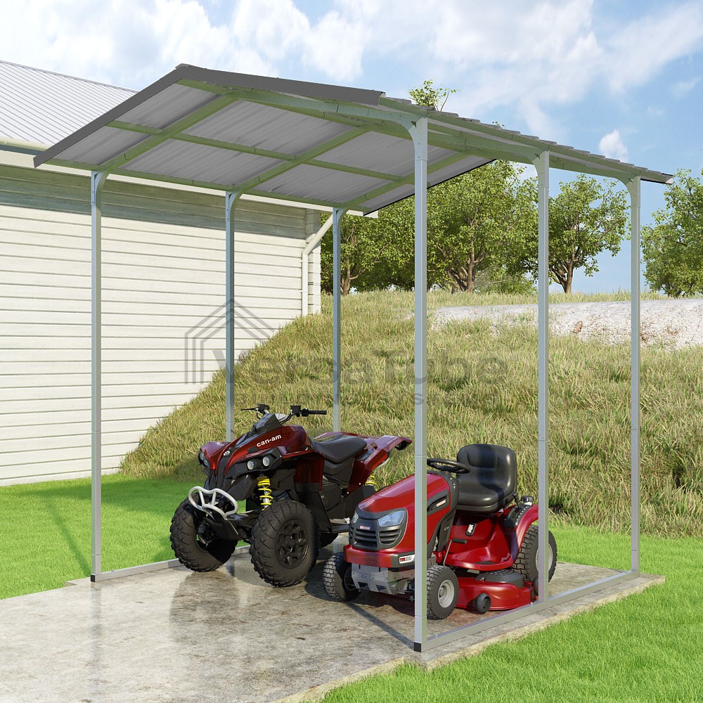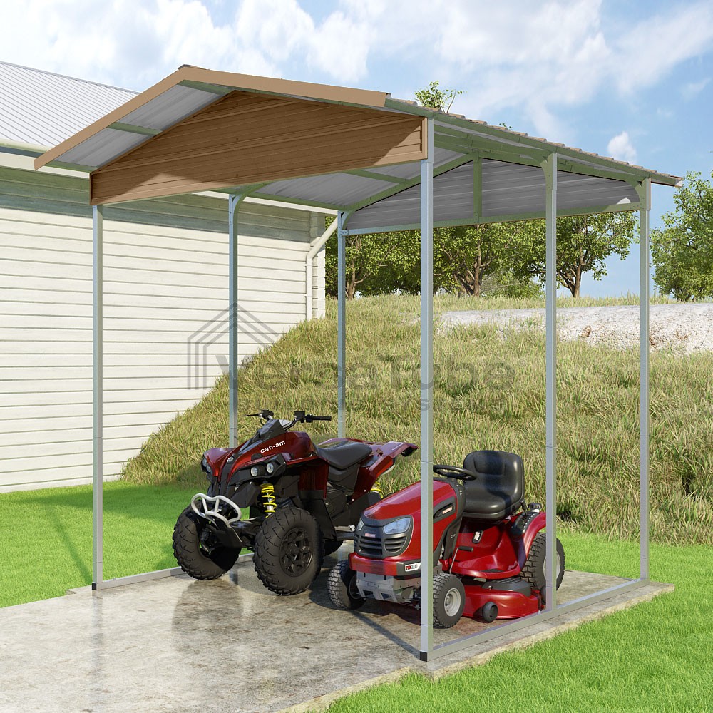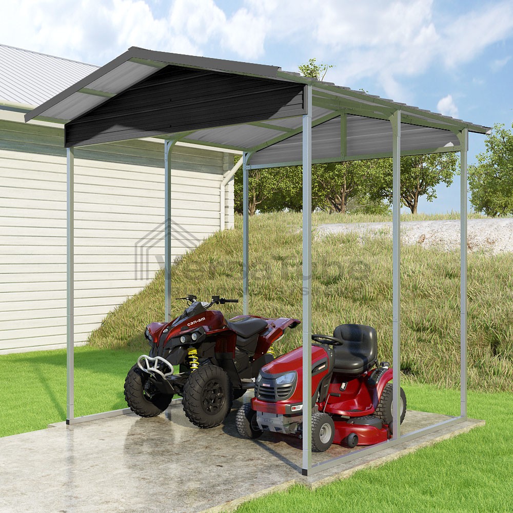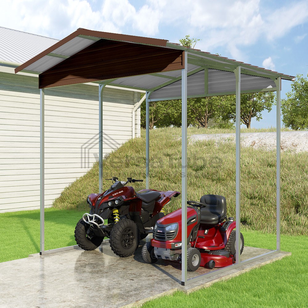 Pinnacle Series DIY carport kit features vertical sheet metal roof panels with ridge cap, gable and eave trim for an A-frame roof style and extended coverage on both ends.