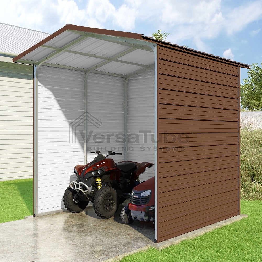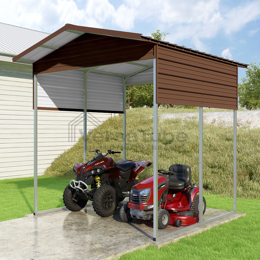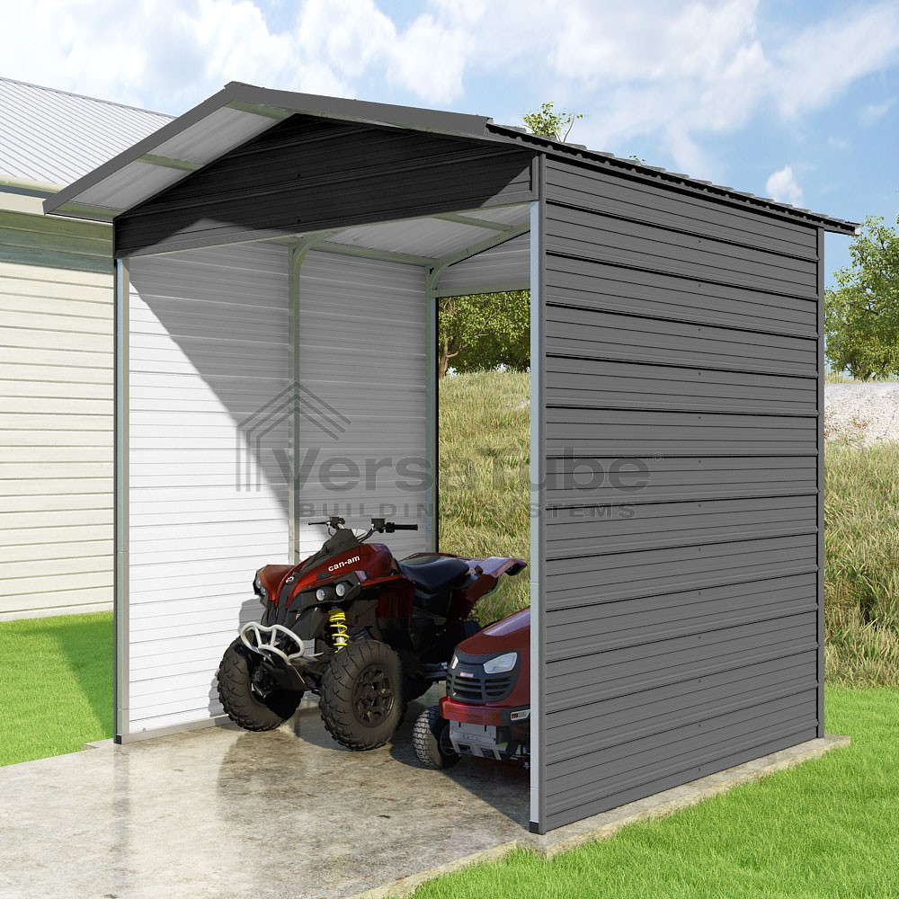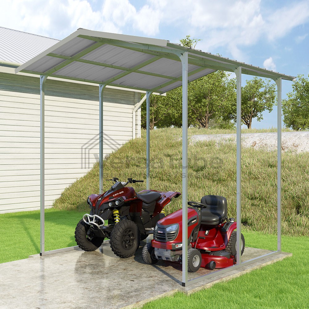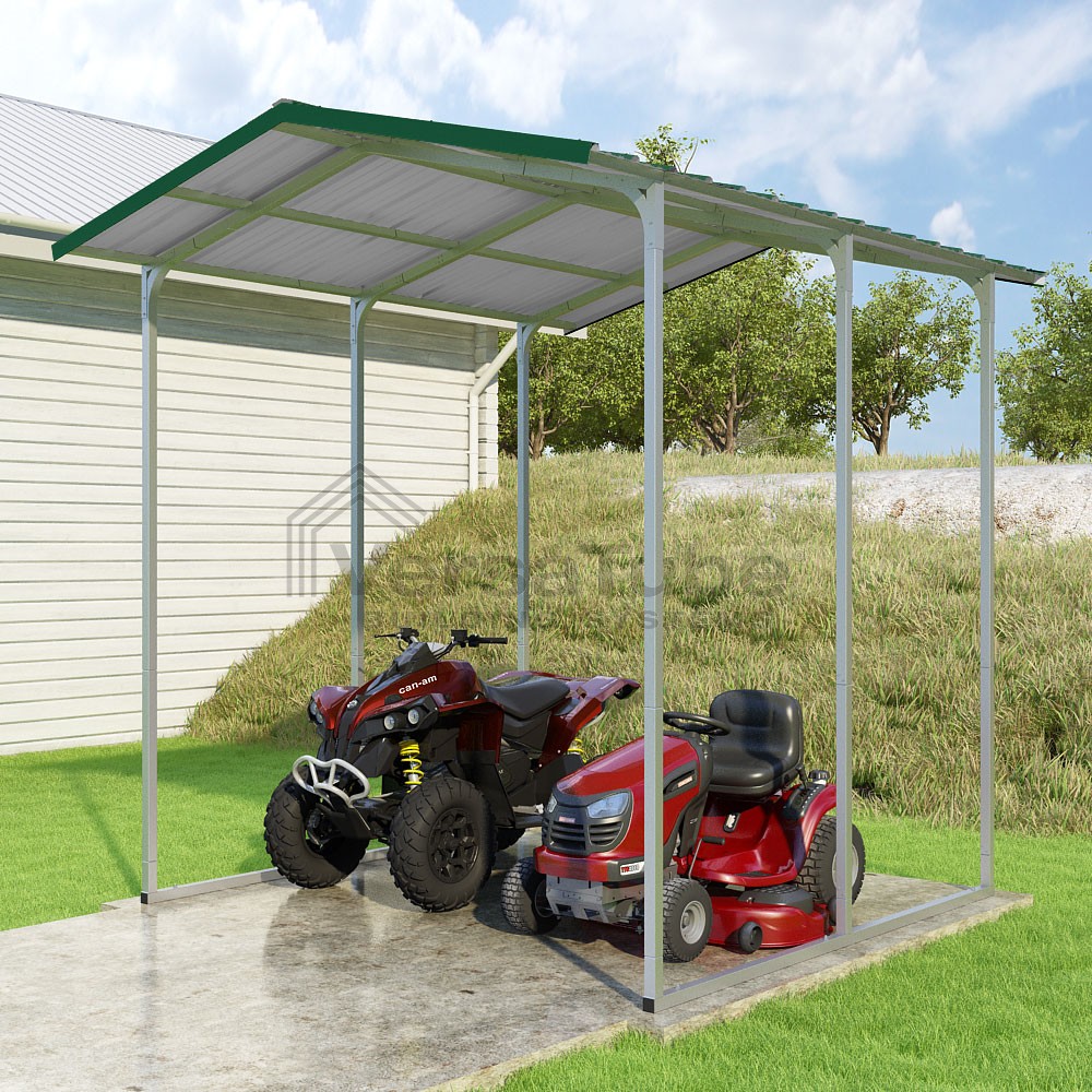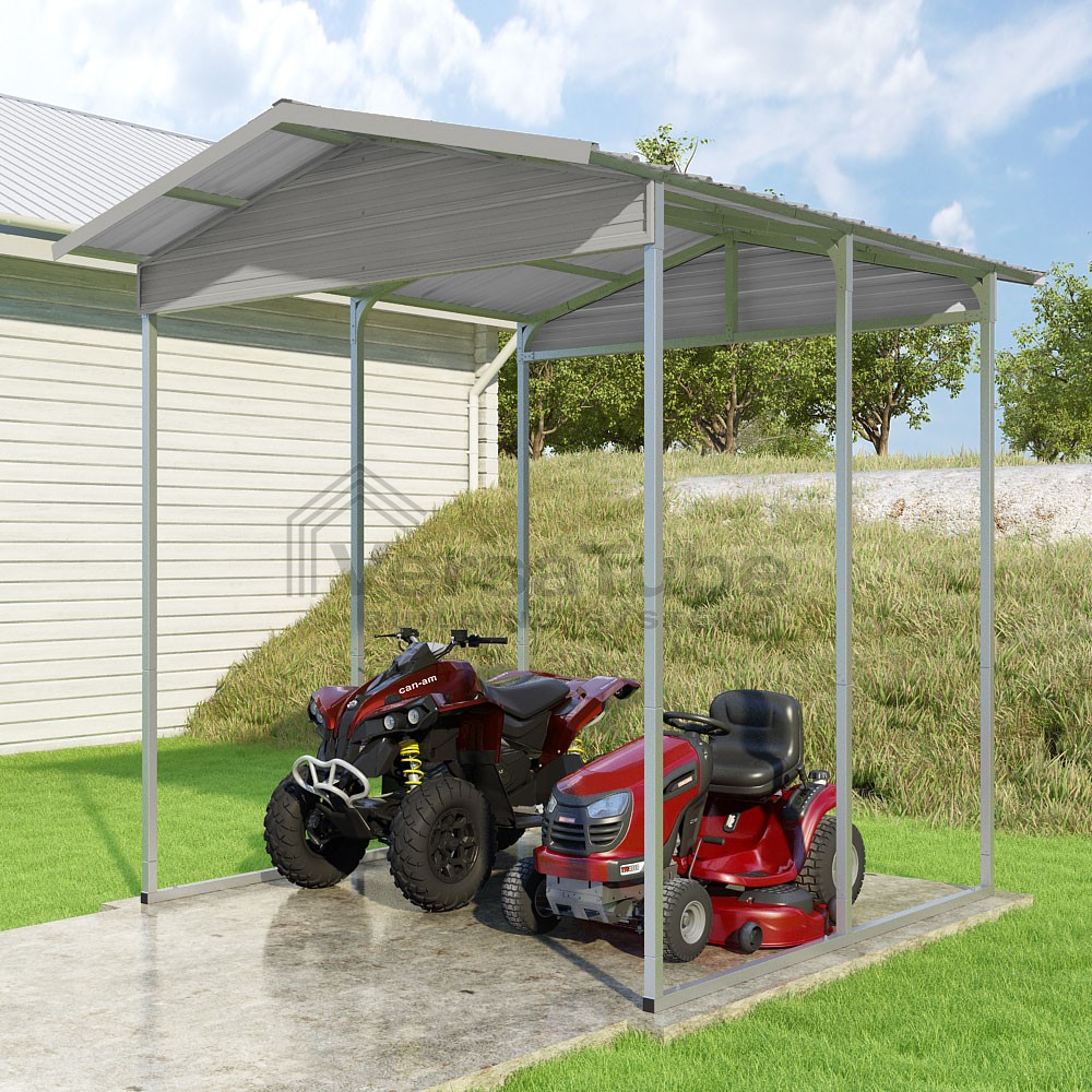 Pinnacle Series DIY carport kit features vertical sheet metal roof panels with ridge cap, gable and eave trim for an A-frame roof style and extended coverage on both ends.