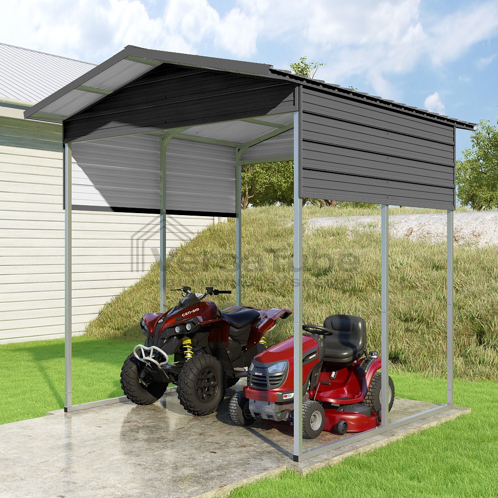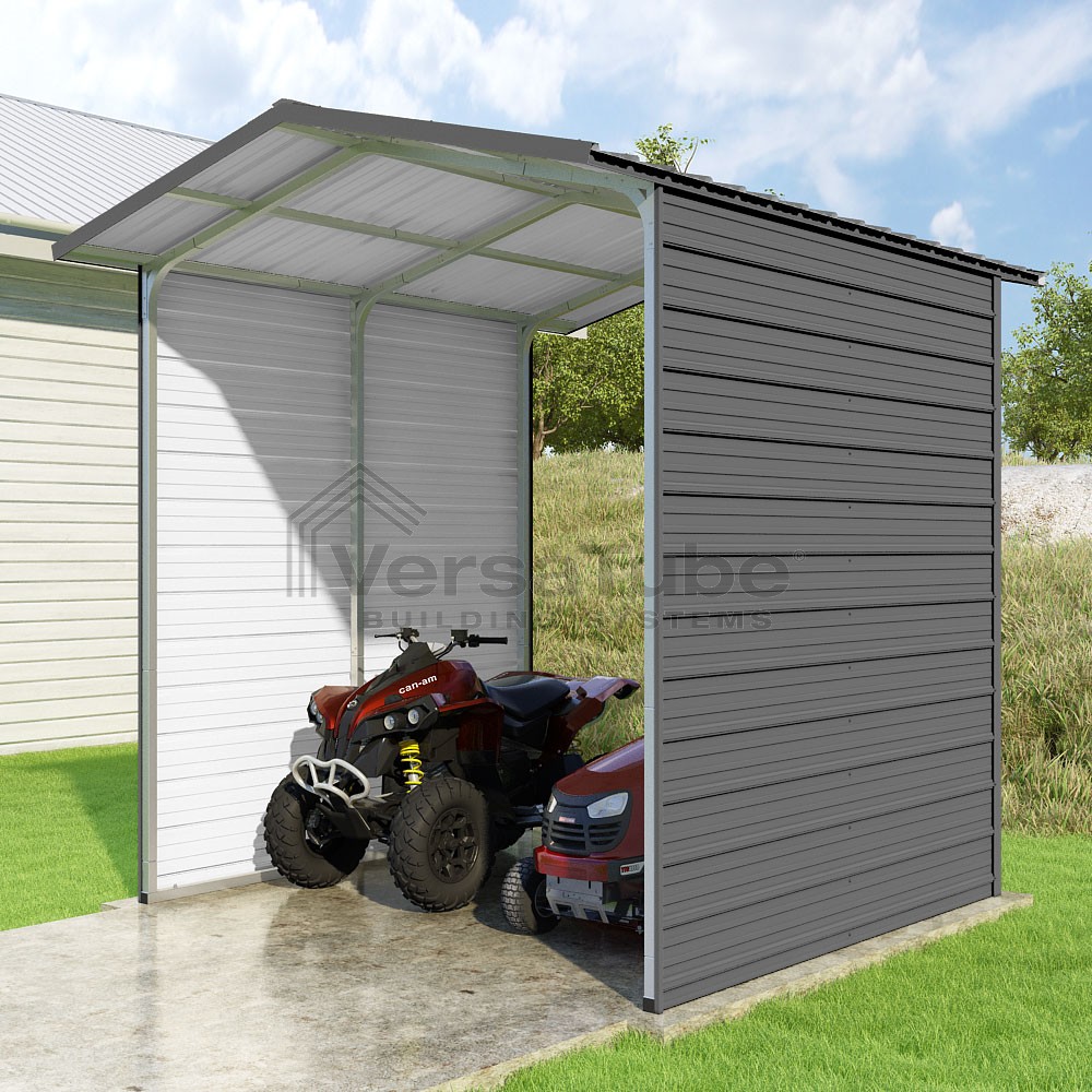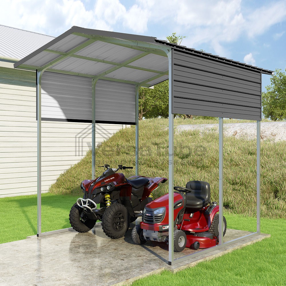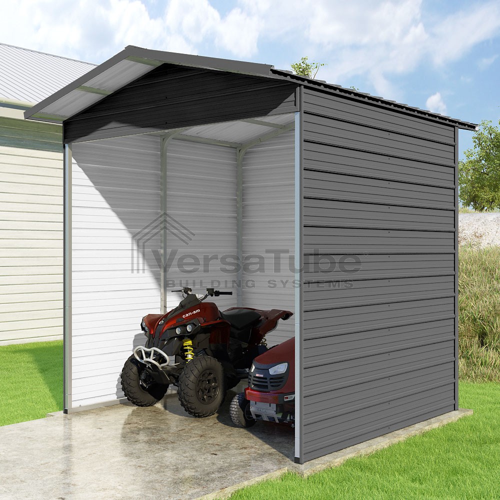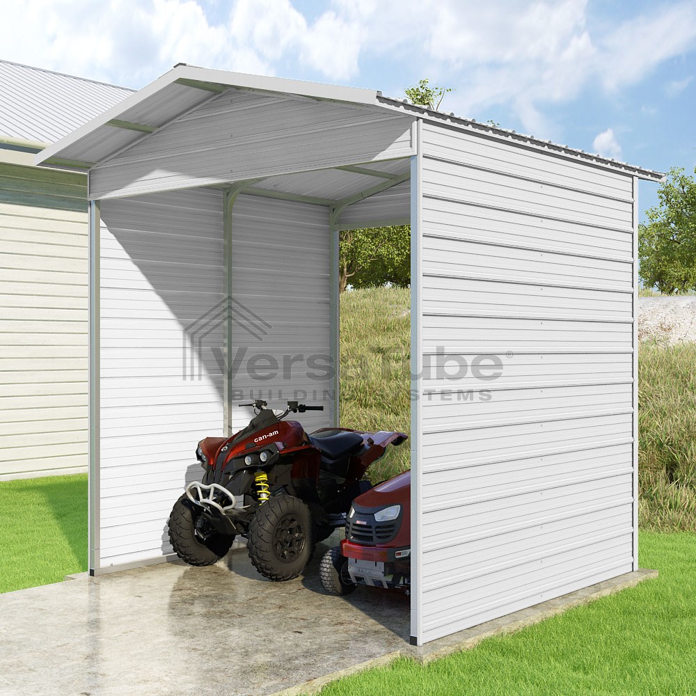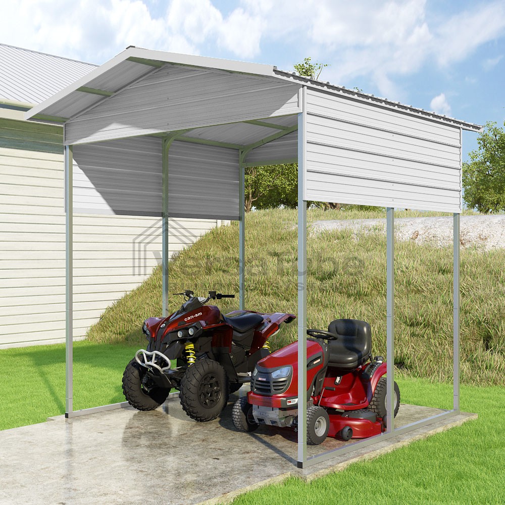 Pinnacle Series DIY carport kit features vertical sheet metal roof panels with ridge cap, gable and eave trim for an A-frame roof style and extended coverage on both ends.