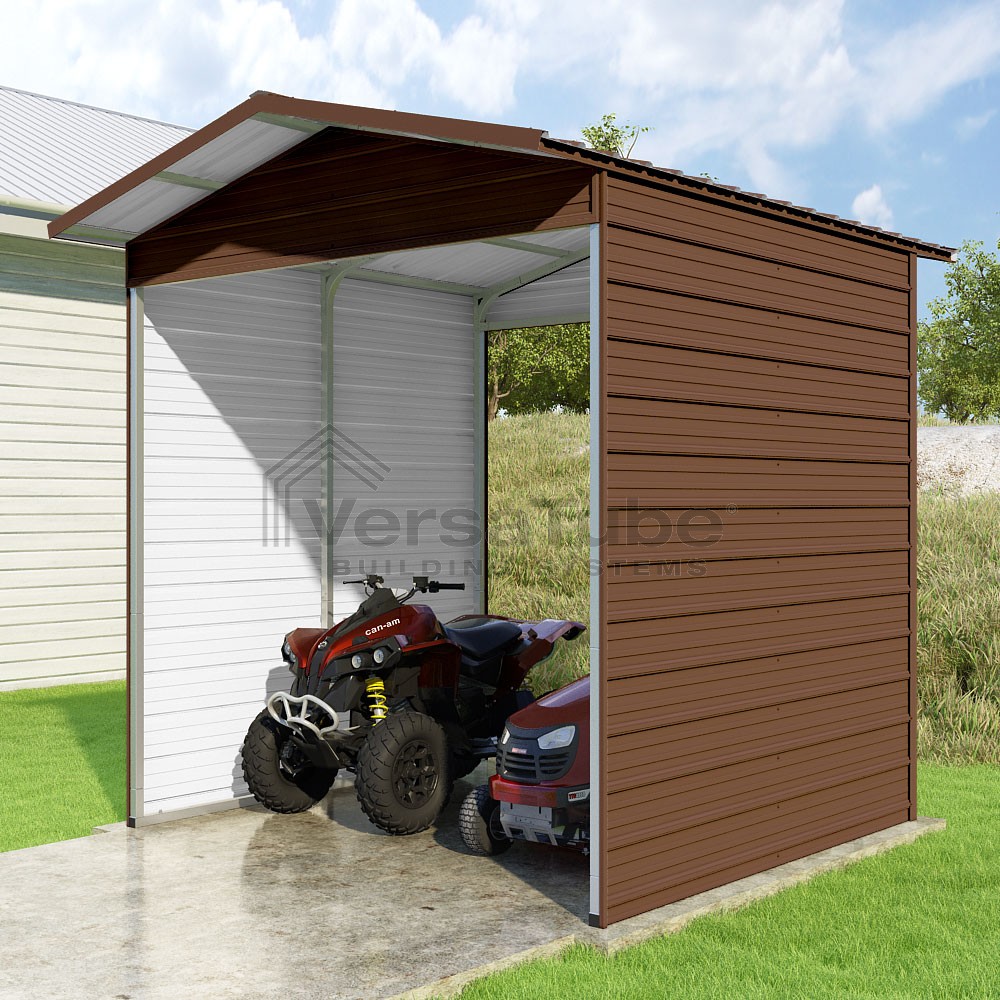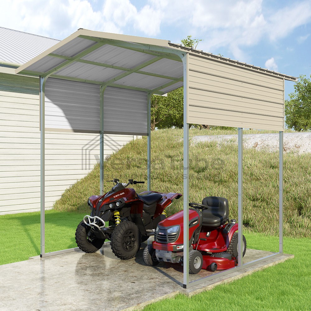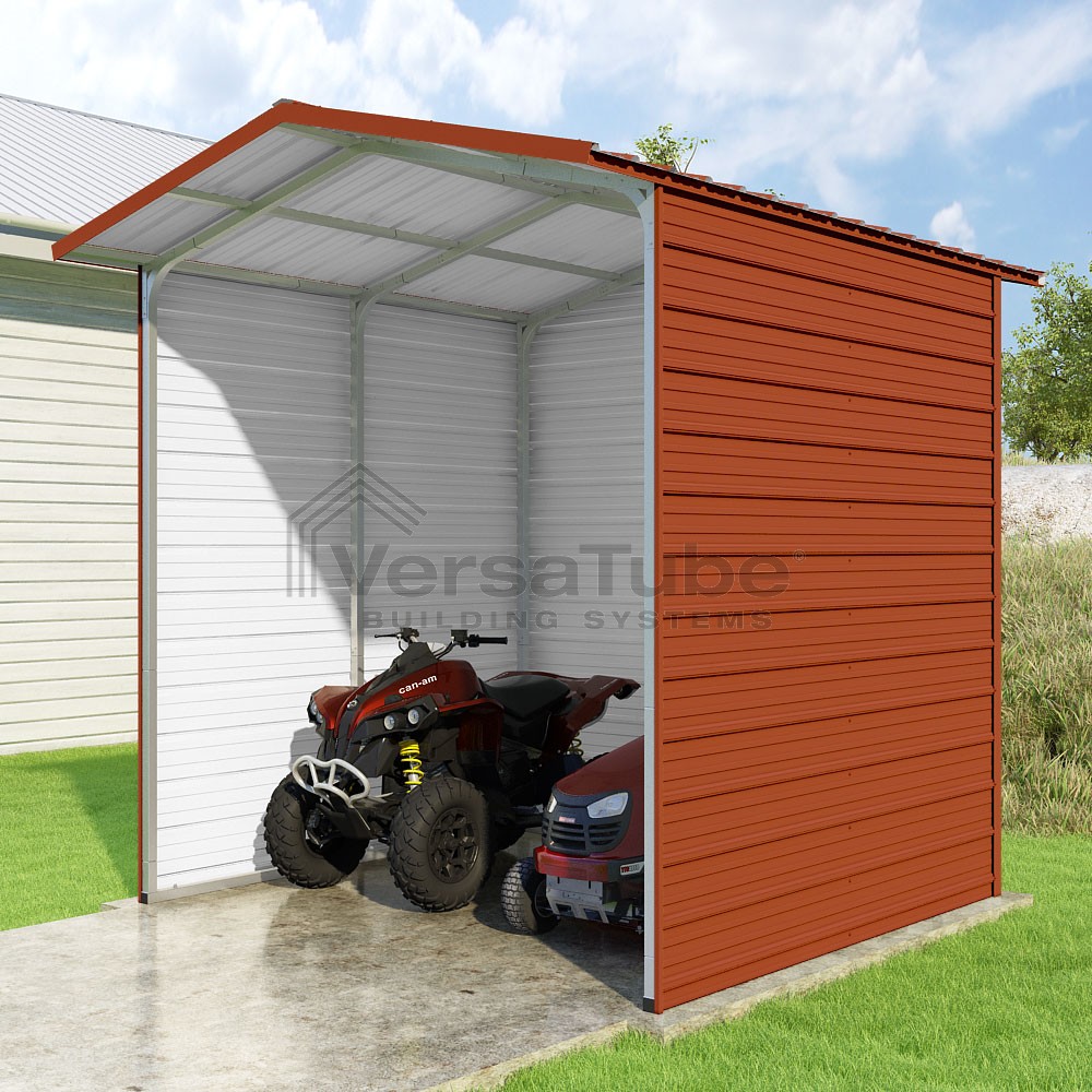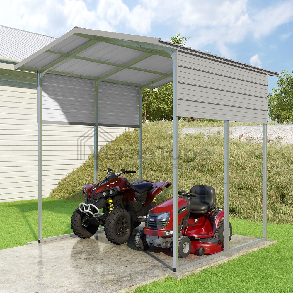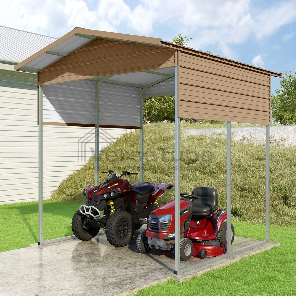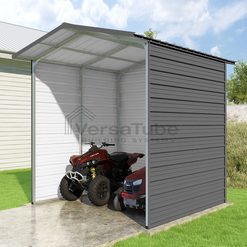 Pinnacle Series DIY carport kit features vertical sheet metal roof panels with ridge cap, gable and eave trim for an A-frame roof style and extended coverage on both ends.