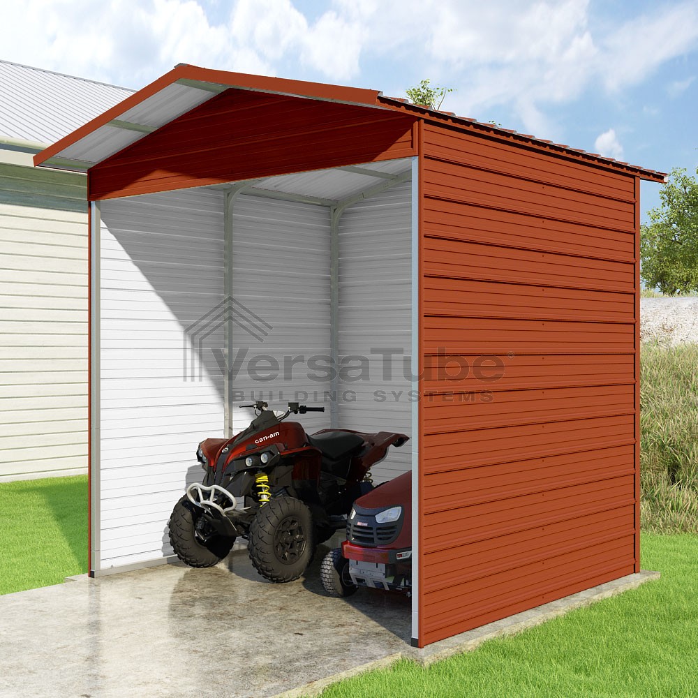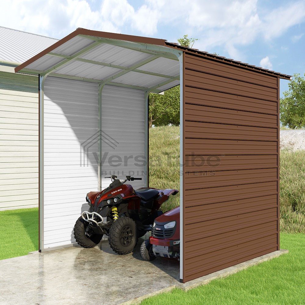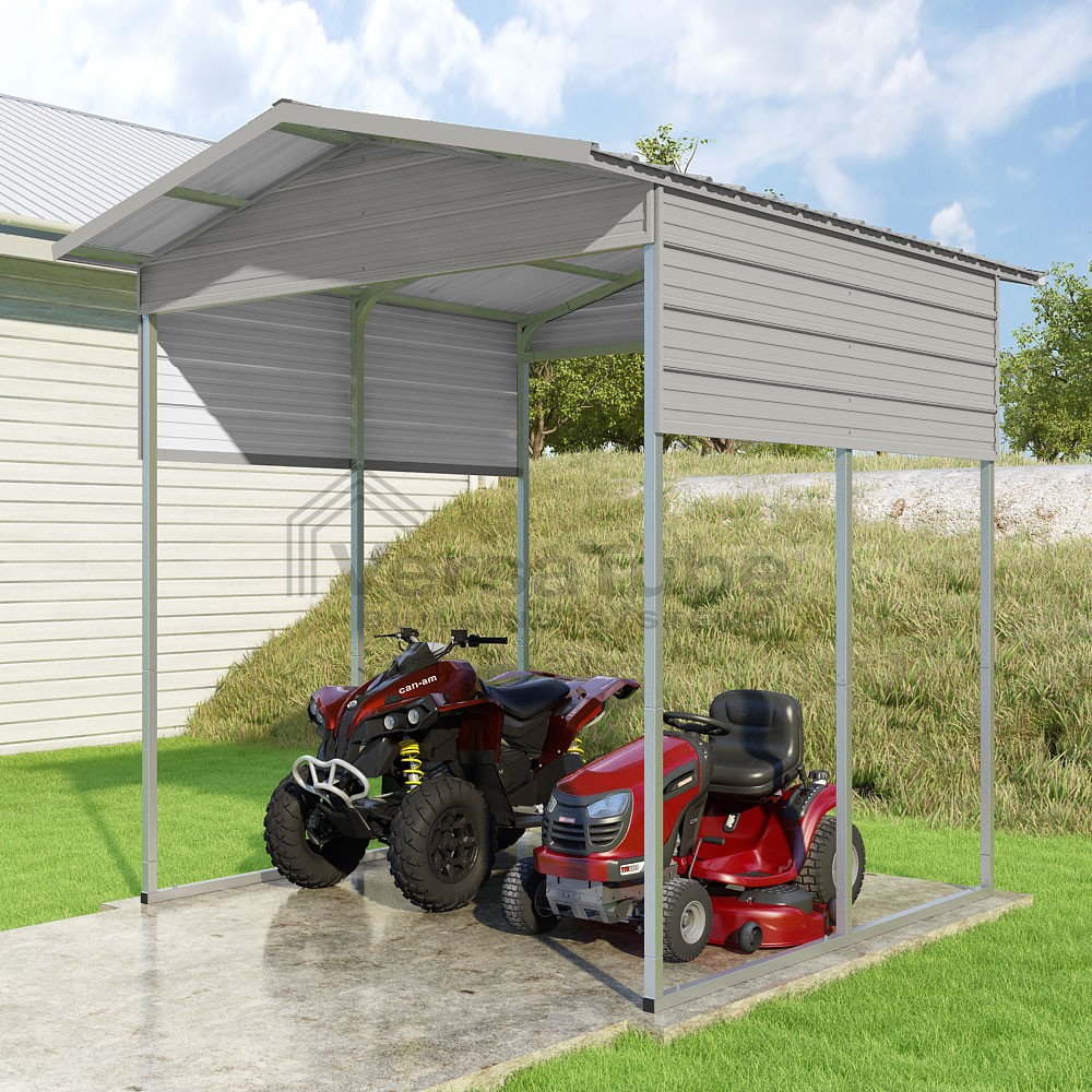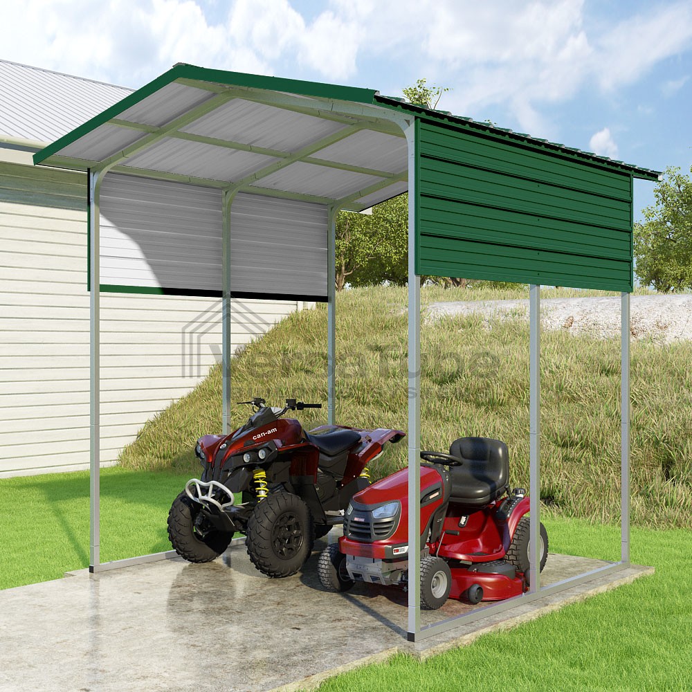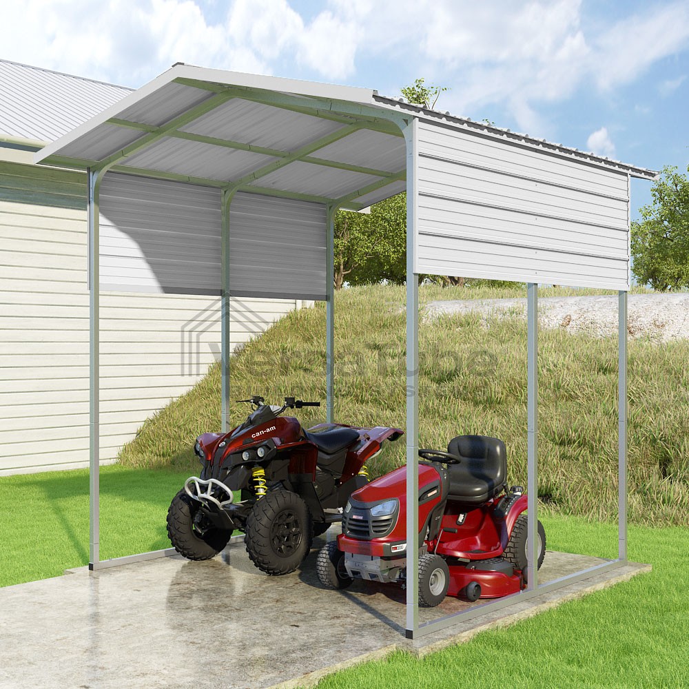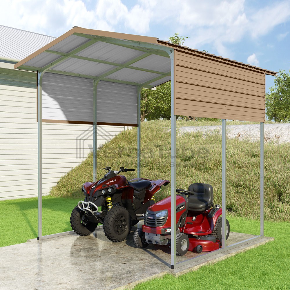 Pinnacle Series DIY carport kit features vertical sheet metal roof panels with ridge cap, gable and eave trim for an A-frame roof style and extended coverage on both ends.