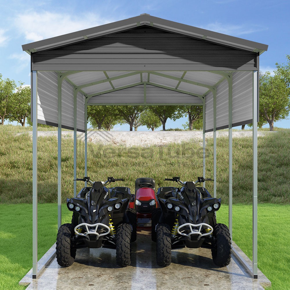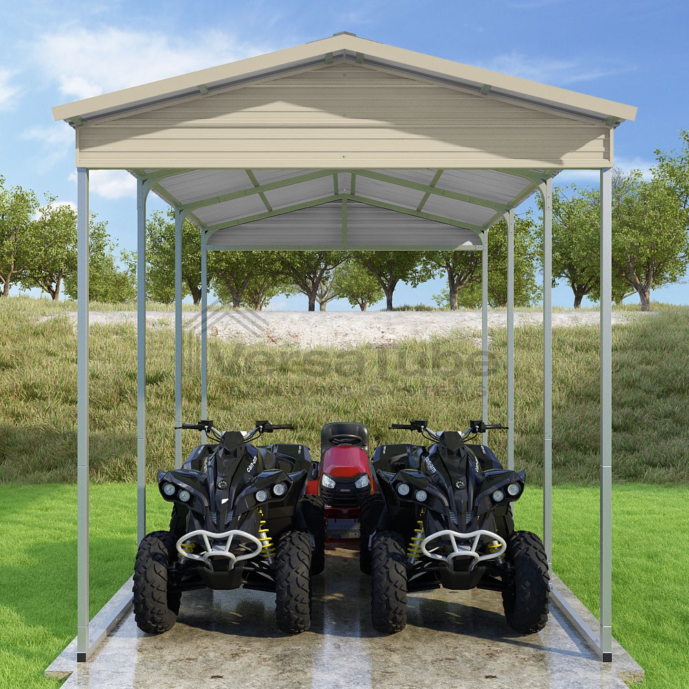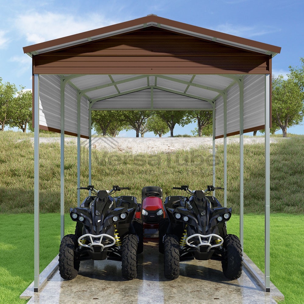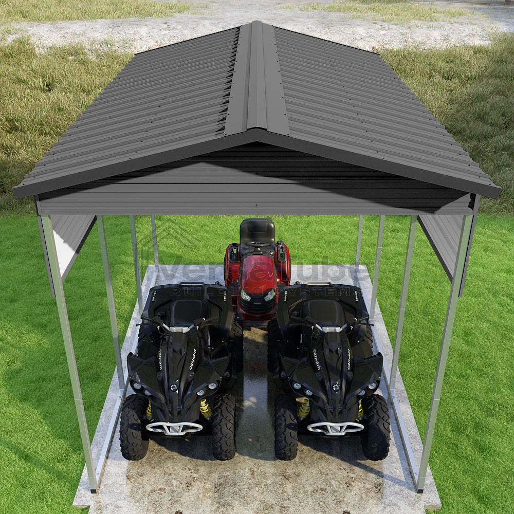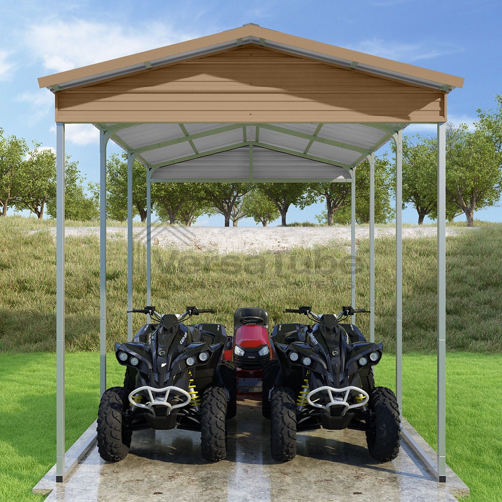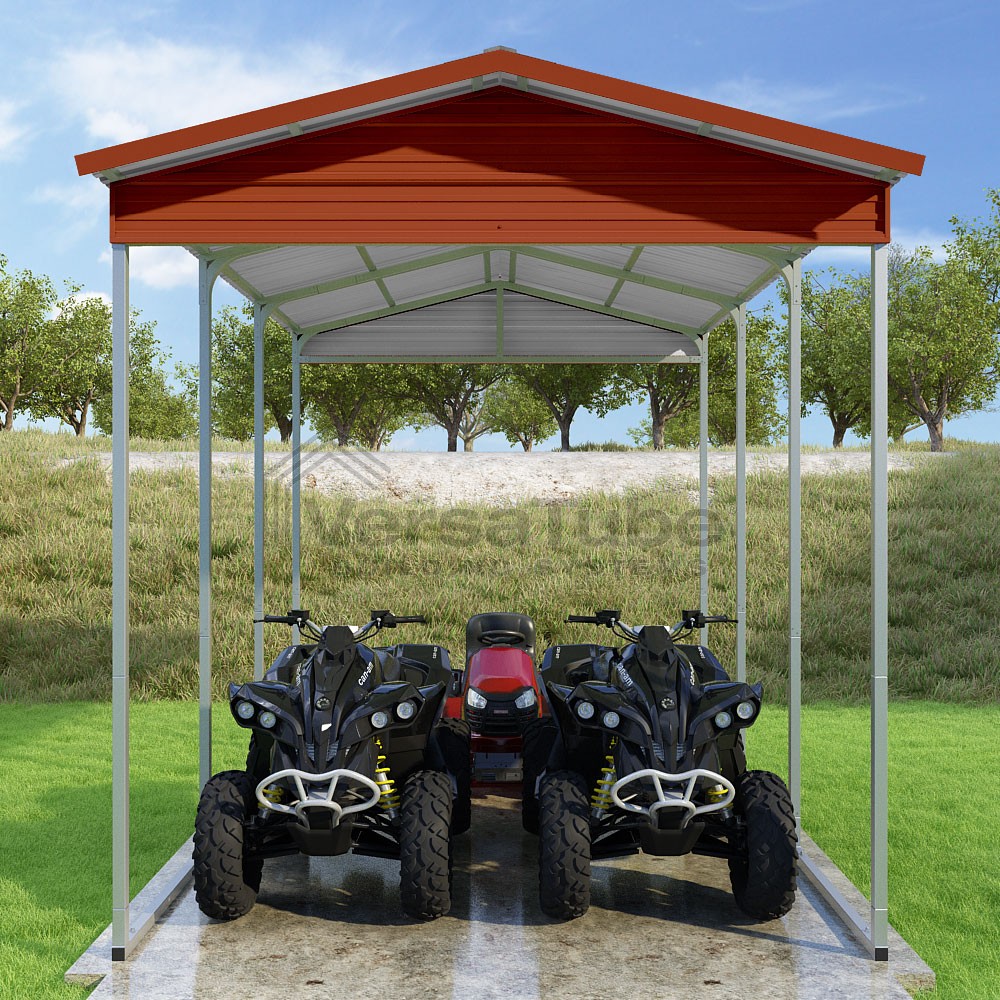 Pinnacle Series DIY carport kit features vertical sheet metal roof panels with ridge cap, gable and eave trim for an A-frame roof style and extended coverage on both ends.