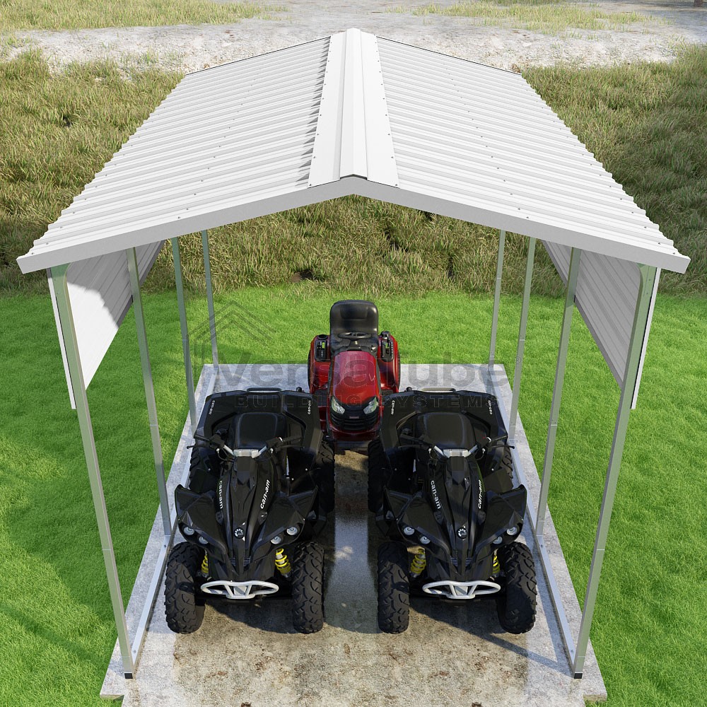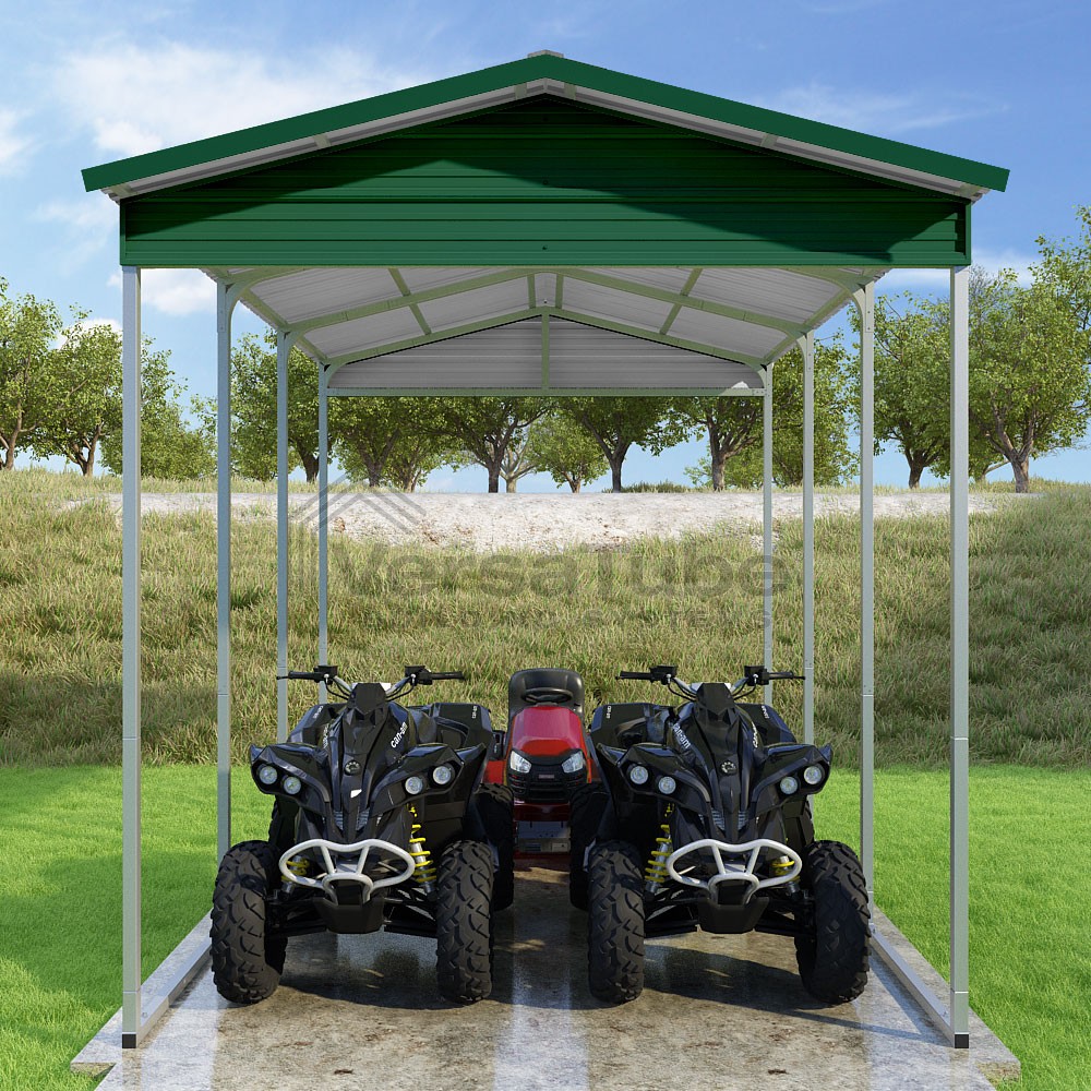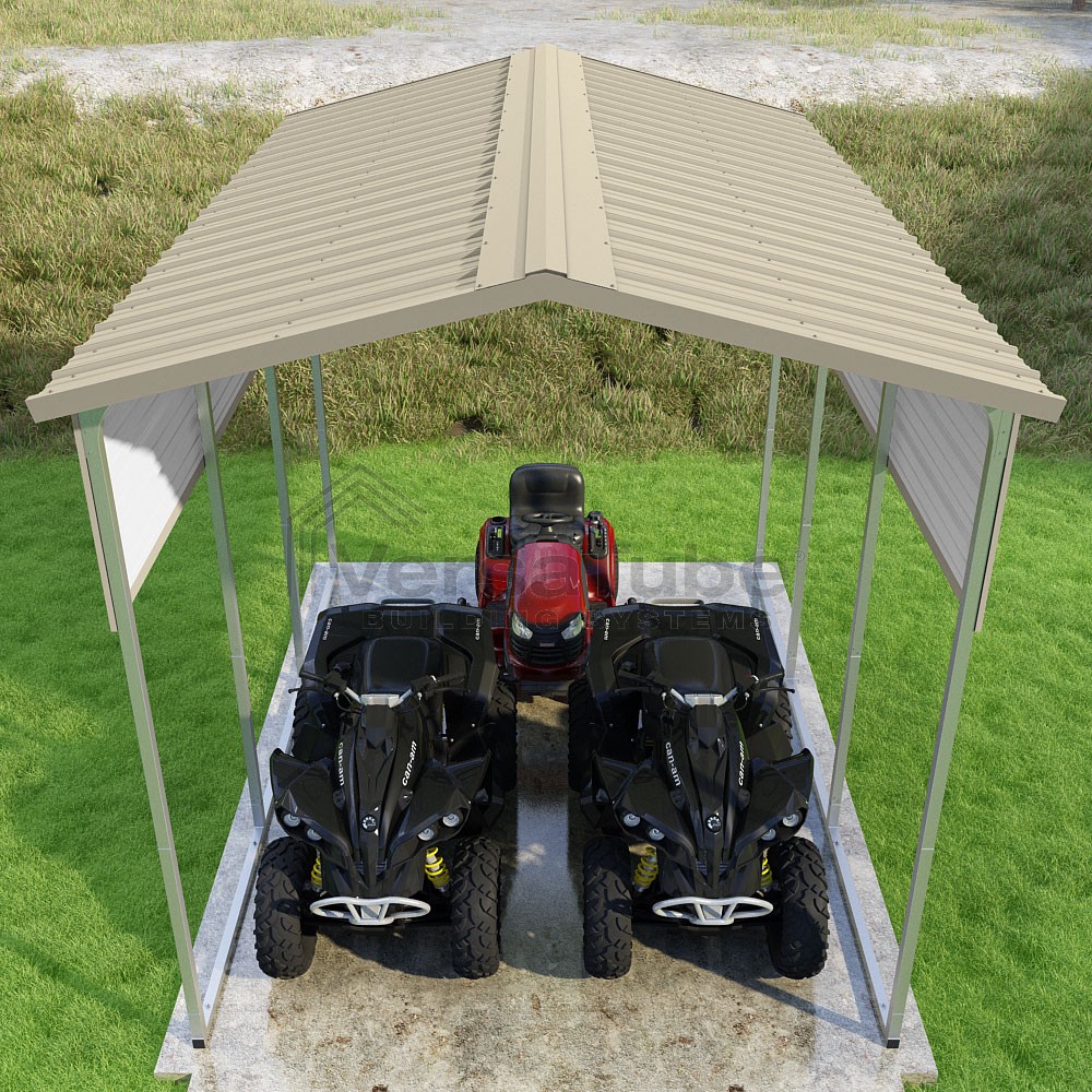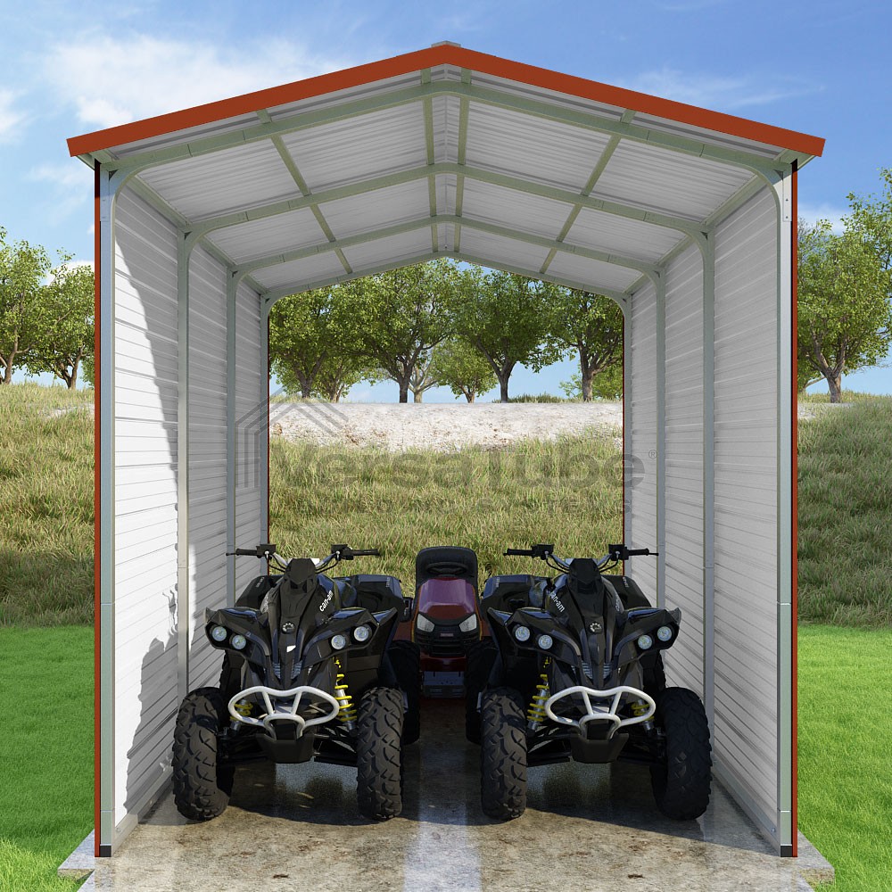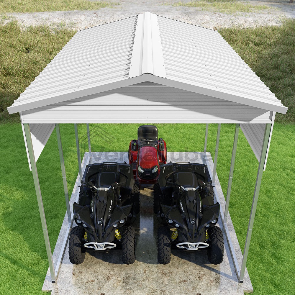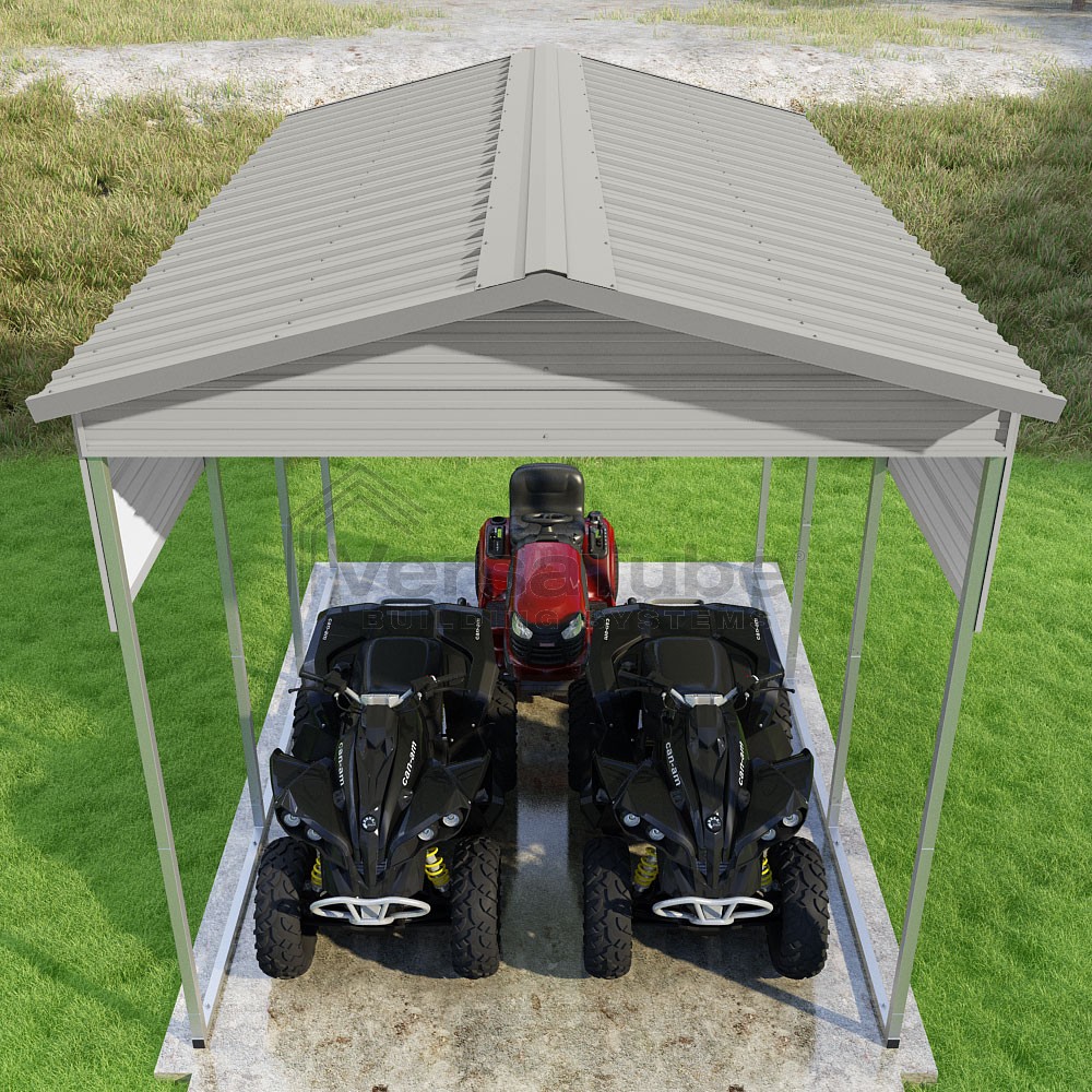 Pinnacle Series DIY carport kit features vertical sheet metal roof panels with ridge cap, gable and eave trim for an A-frame roof style and extended coverage on both ends.