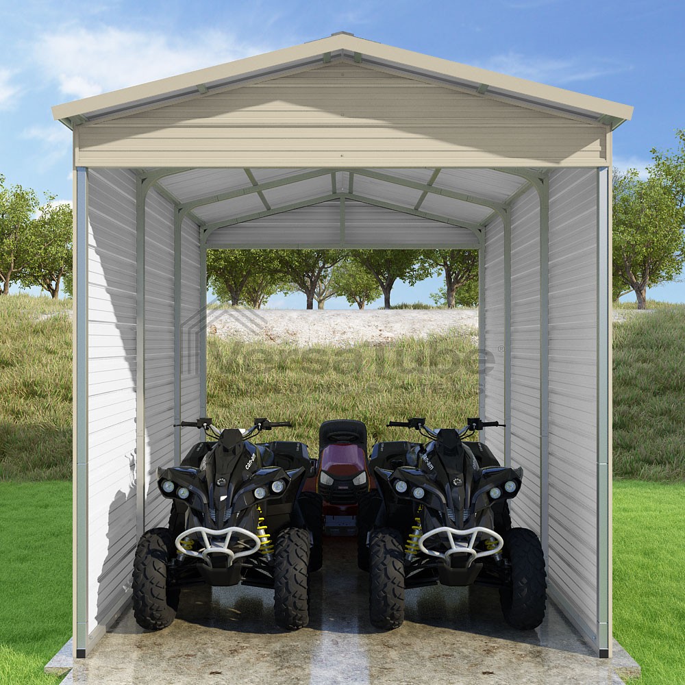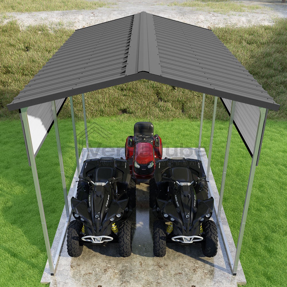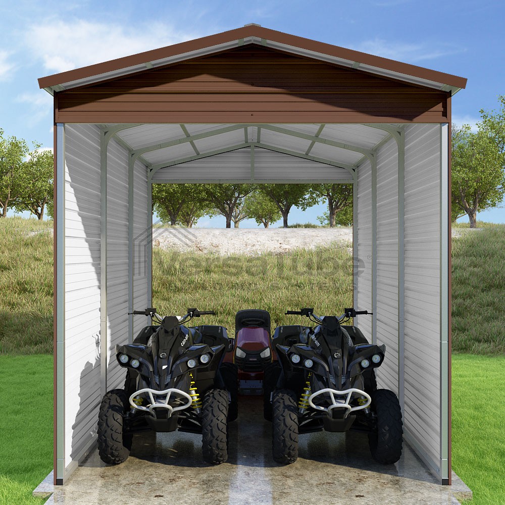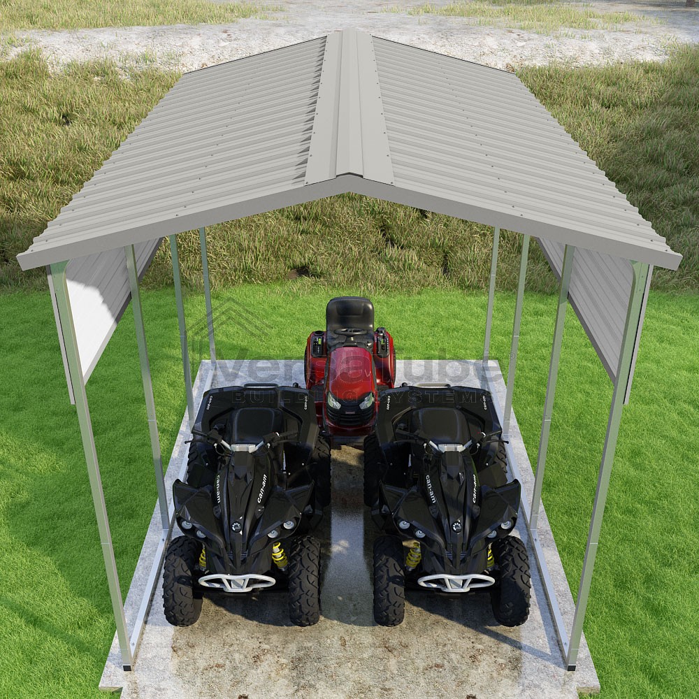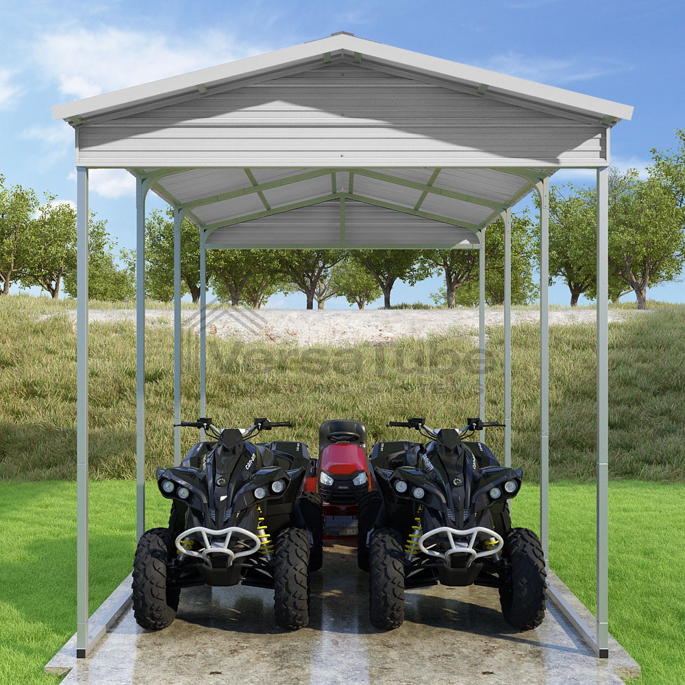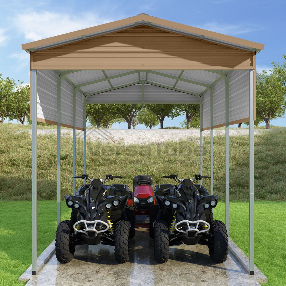 Pinnacle Series DIY carport kit features vertical sheet metal roof panels with ridge cap, gable and eave trim for an A-frame roof style and extended coverage on both ends.