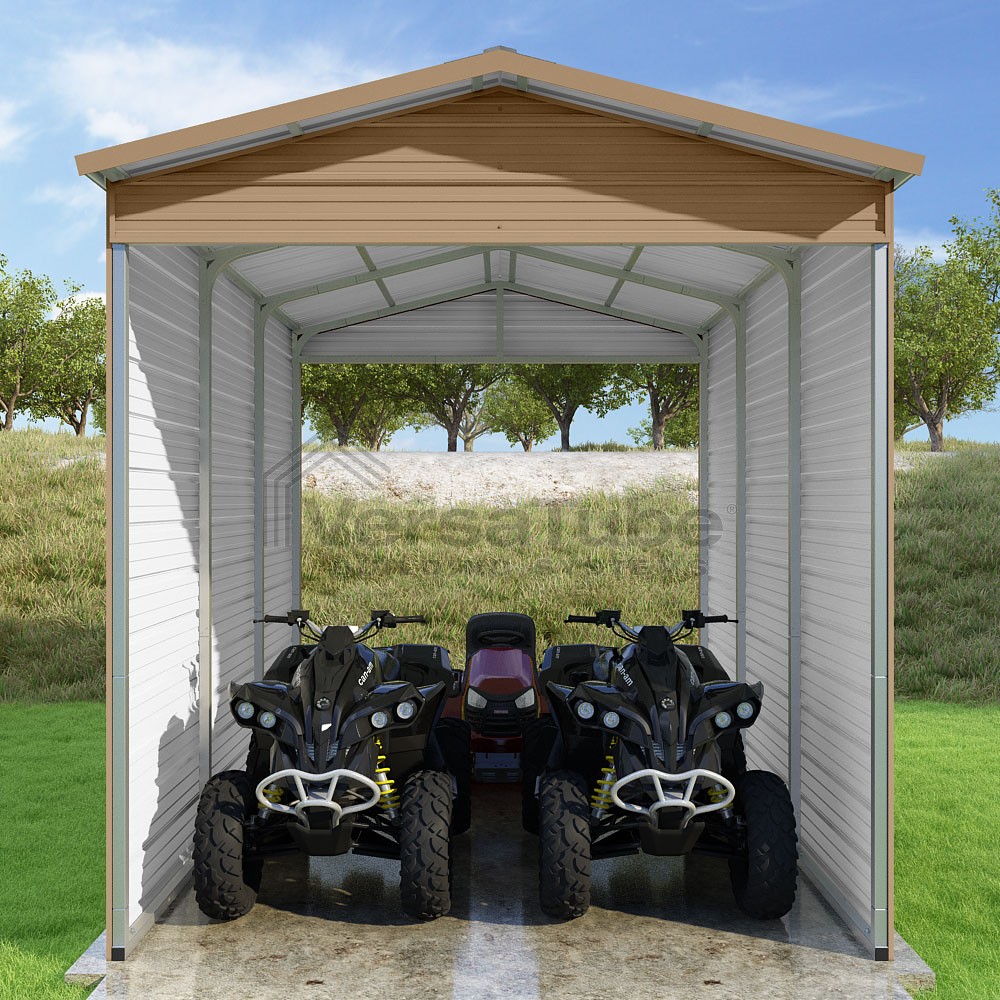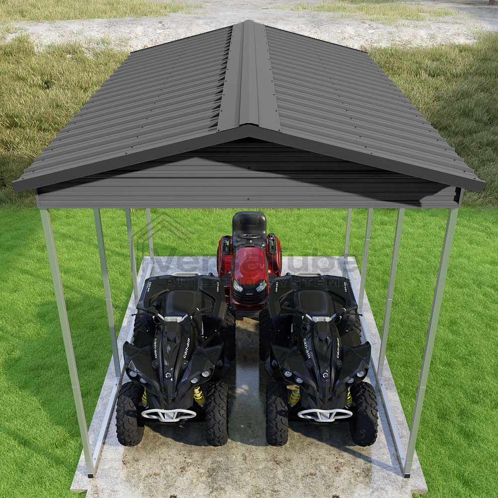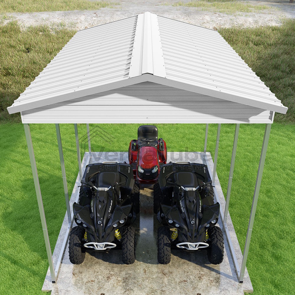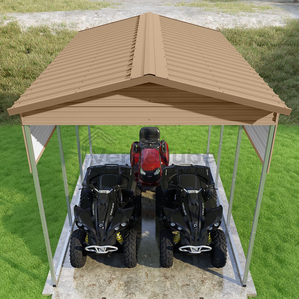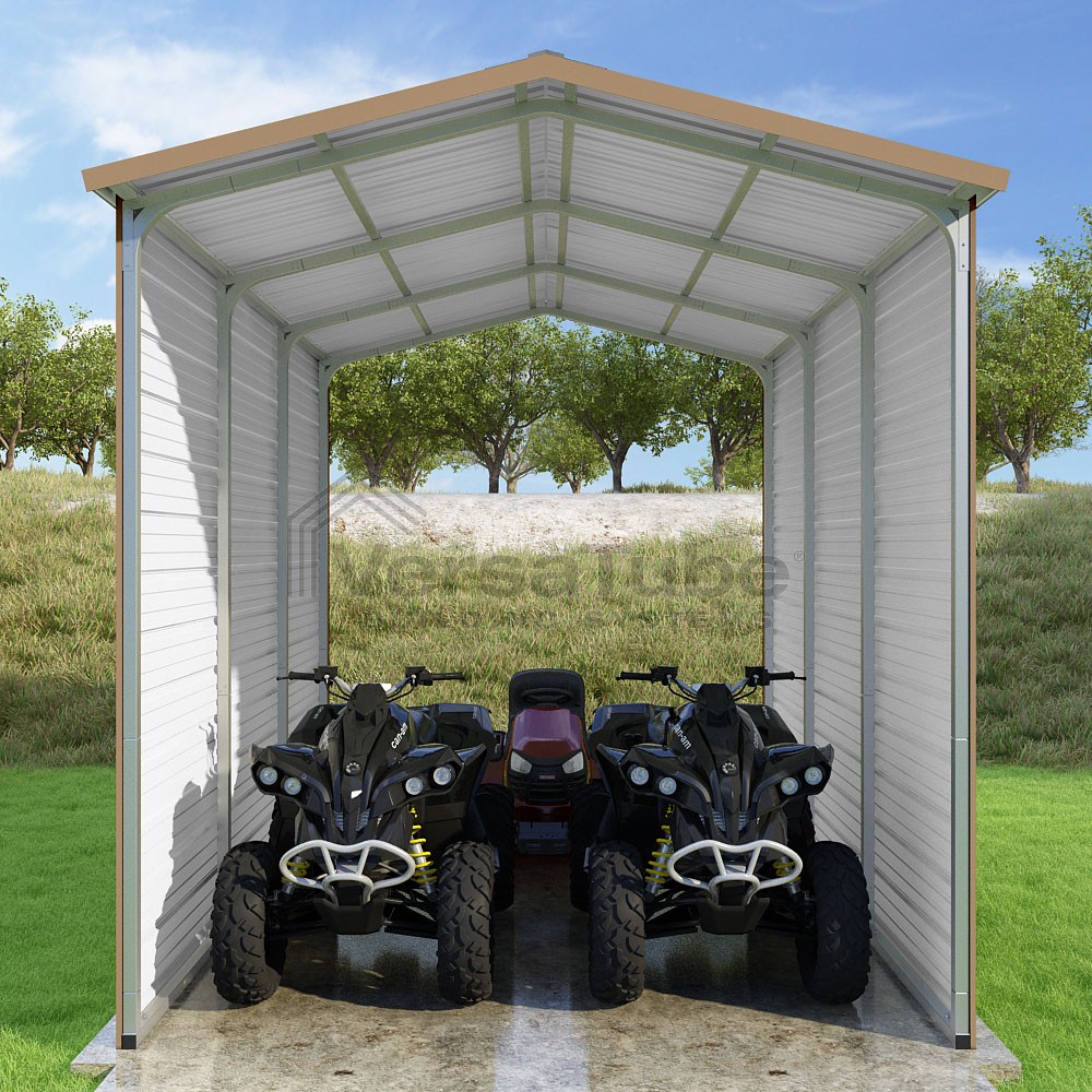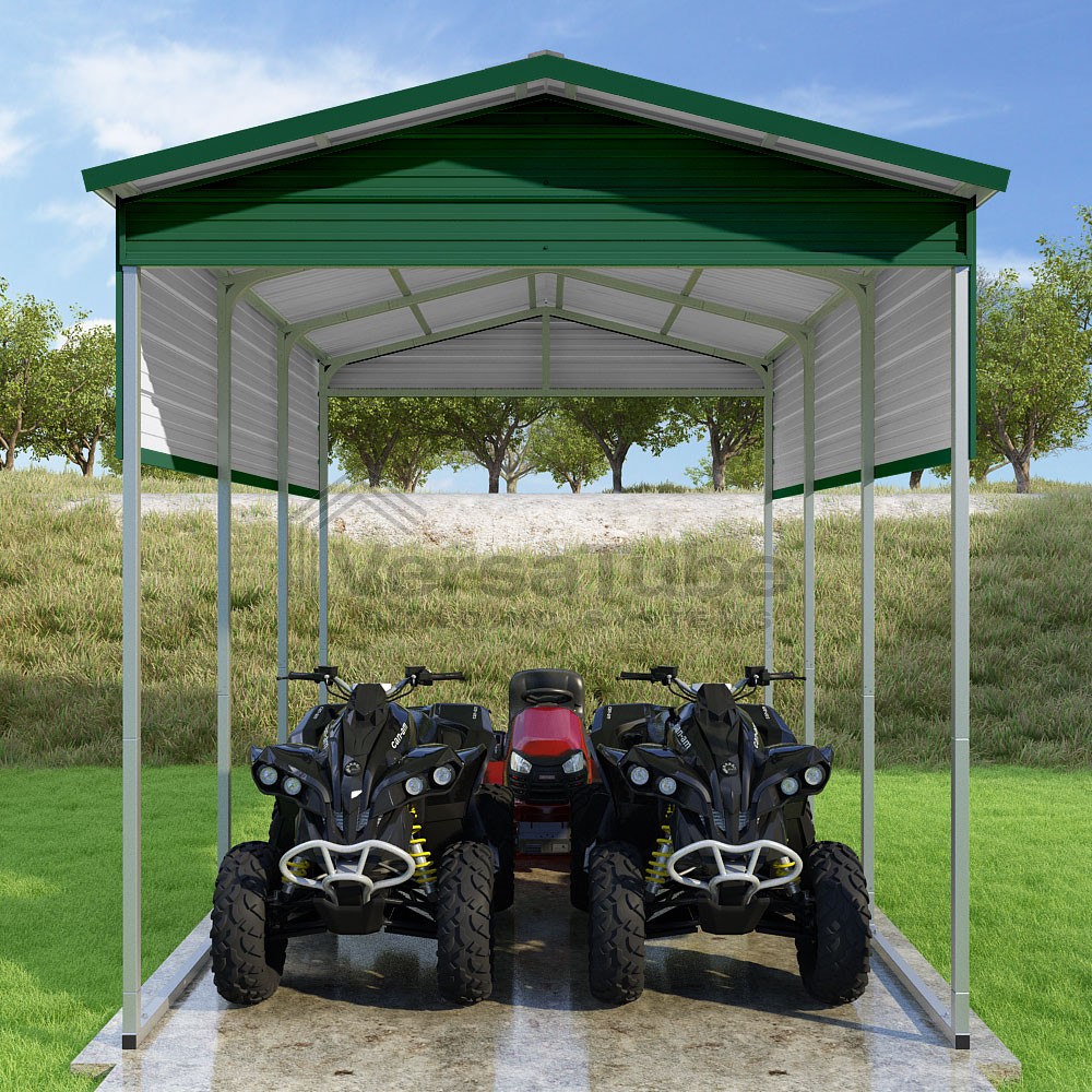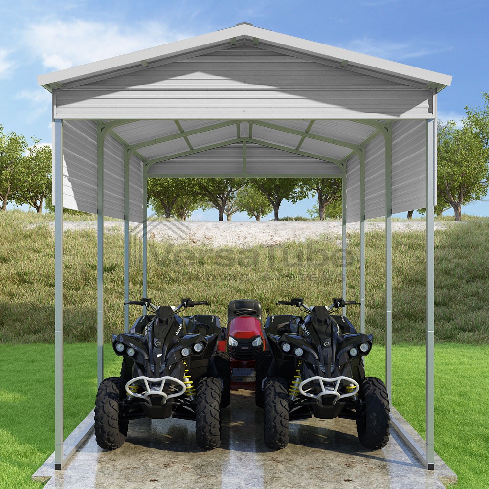 Pinnacle Series DIY carport kit features vertical sheet metal roof panels with ridge cap, gable and eave trim for an A-frame roof style and extended coverage on both ends.