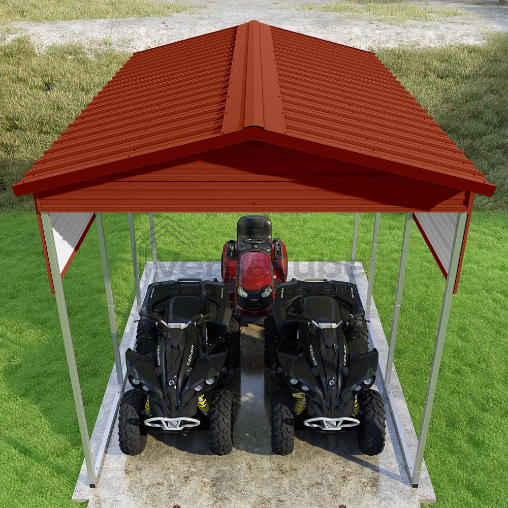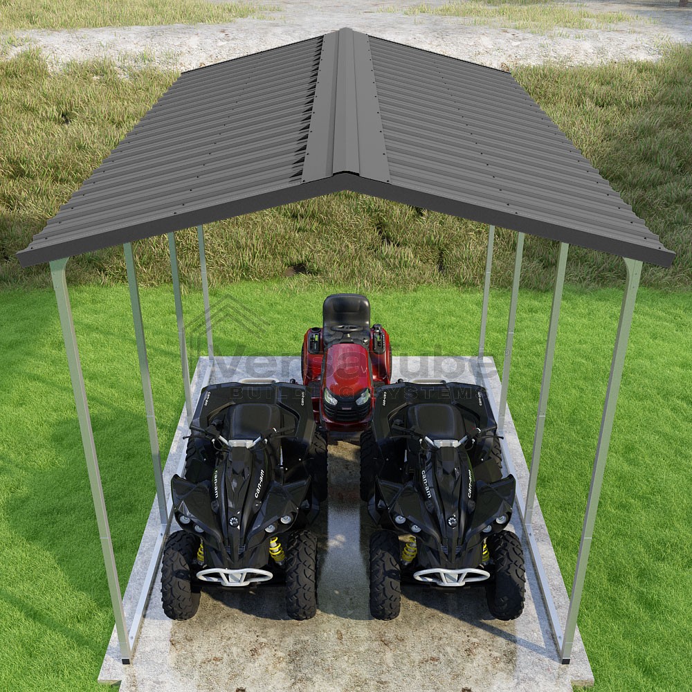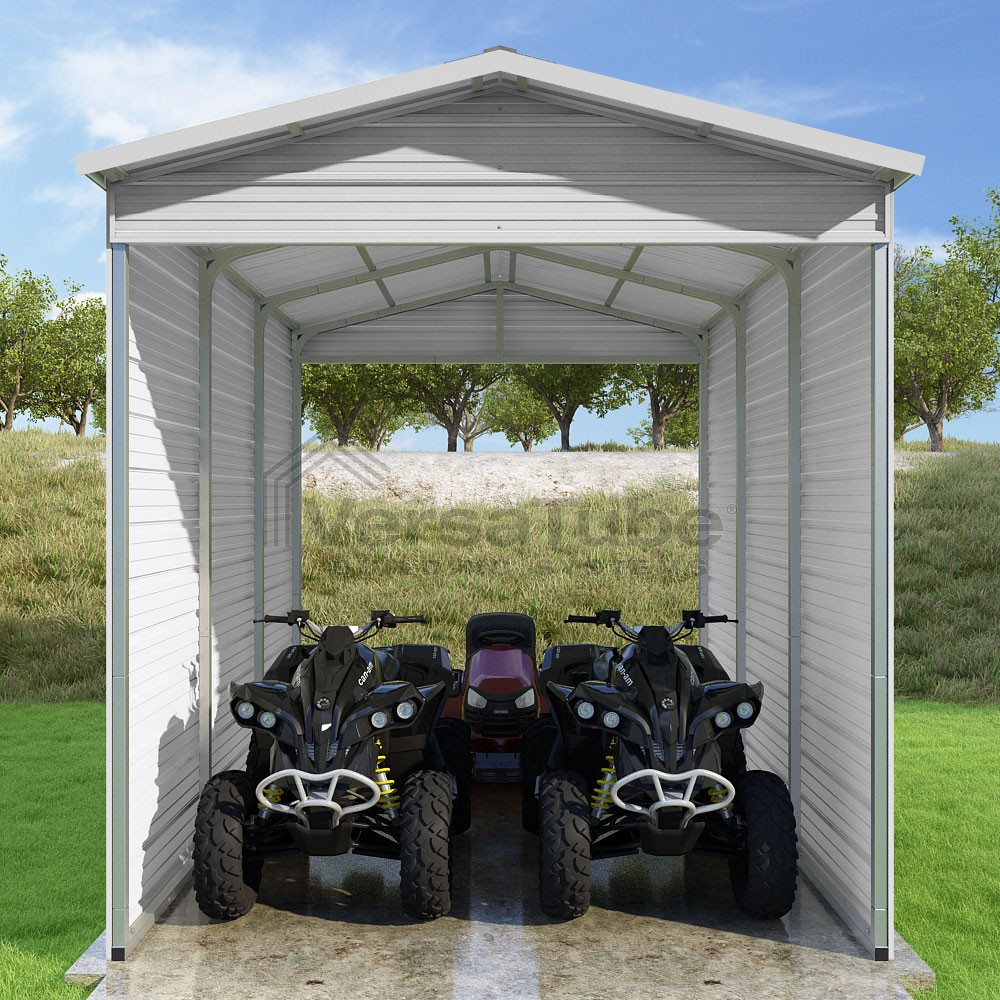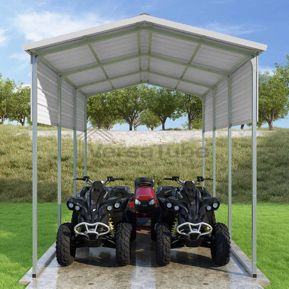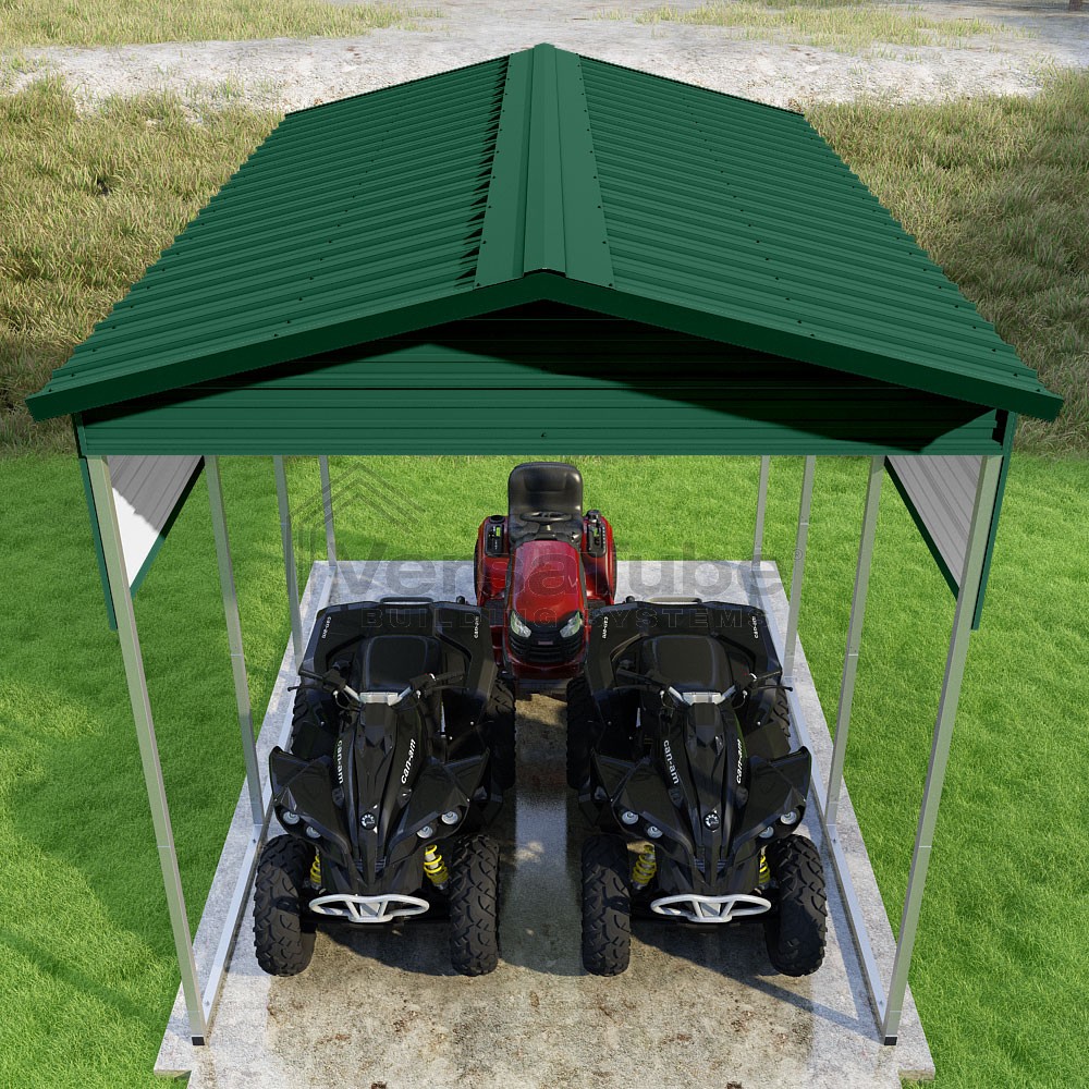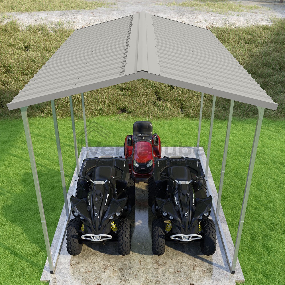 Pinnacle Series DIY carport kit features vertical sheet metal roof panels with ridge cap, gable and eave trim for an A-frame roof style and extended coverage on both ends.
