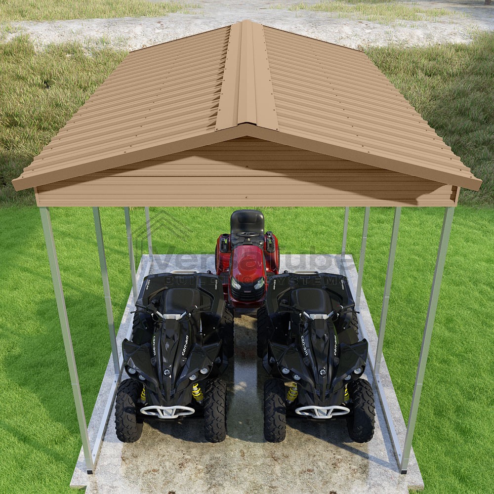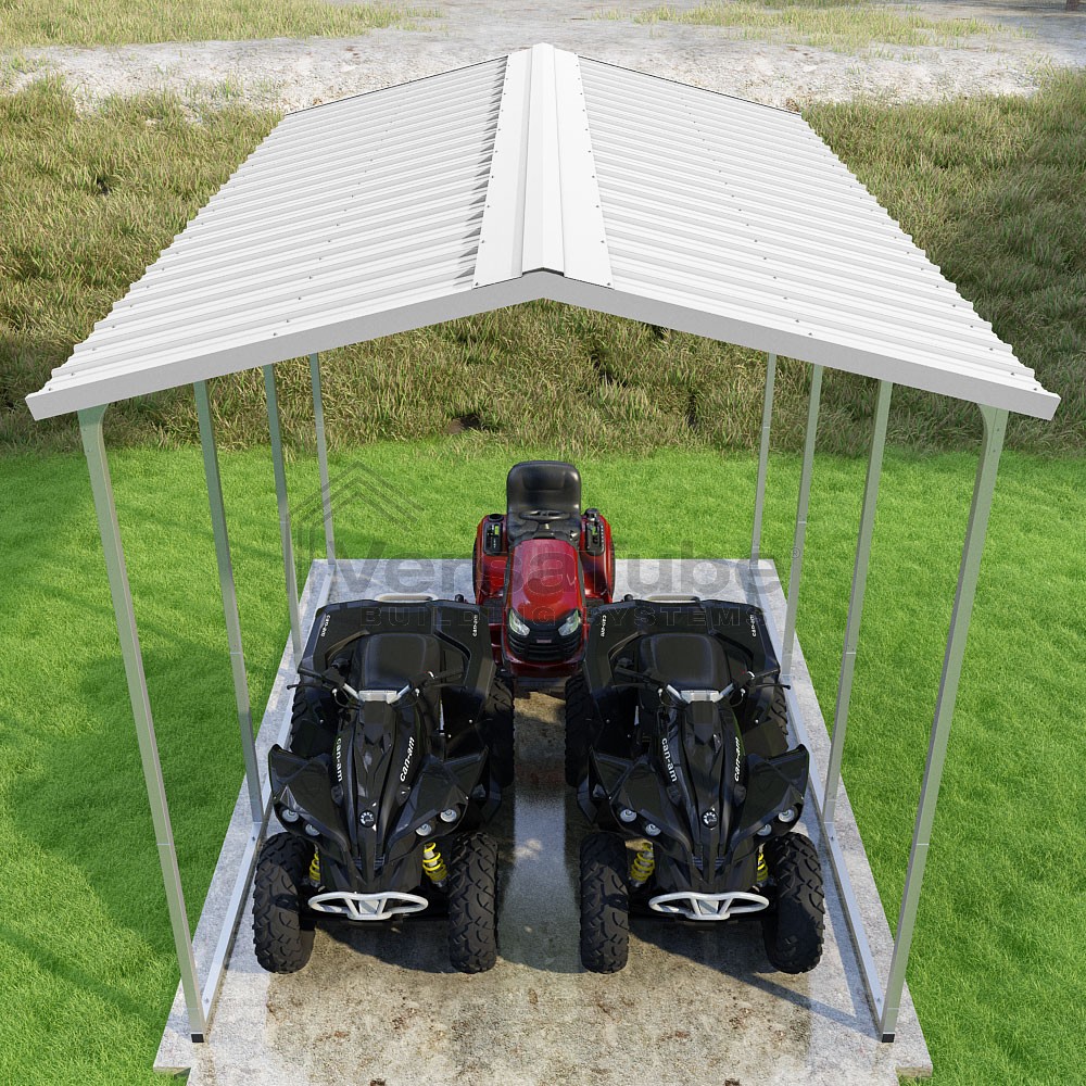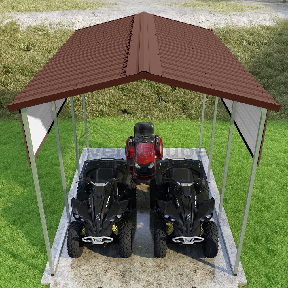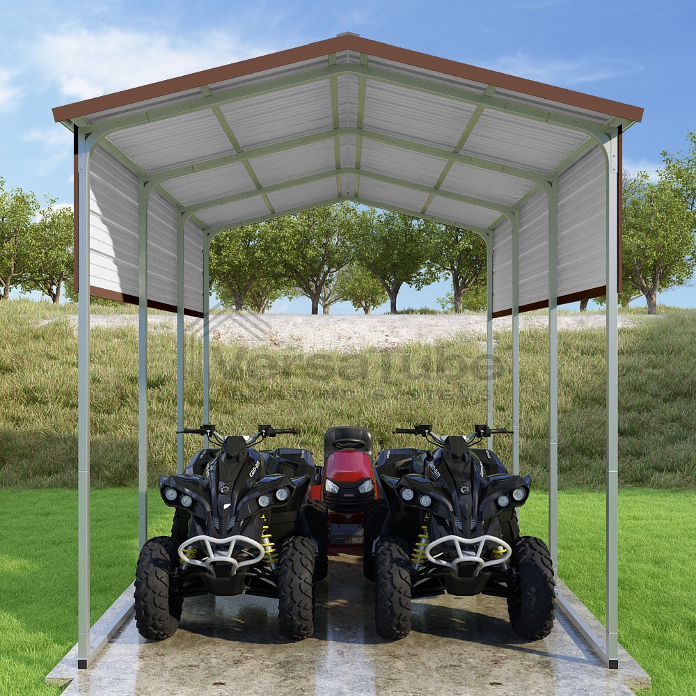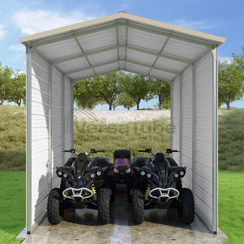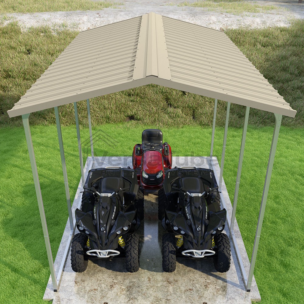 Pinnacle Series DIY carport kit features vertical sheet metal roof panels with ridge cap, gable and eave trim for an A-frame roof style and extended coverage on both ends.