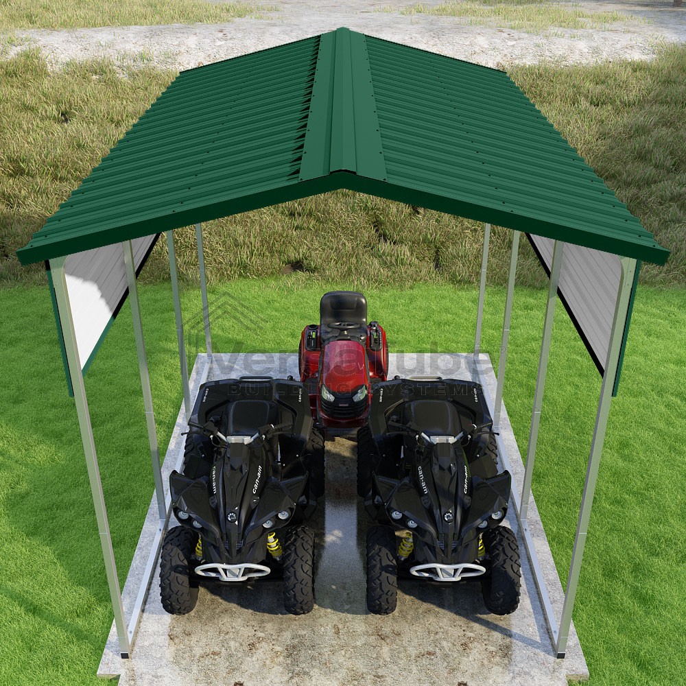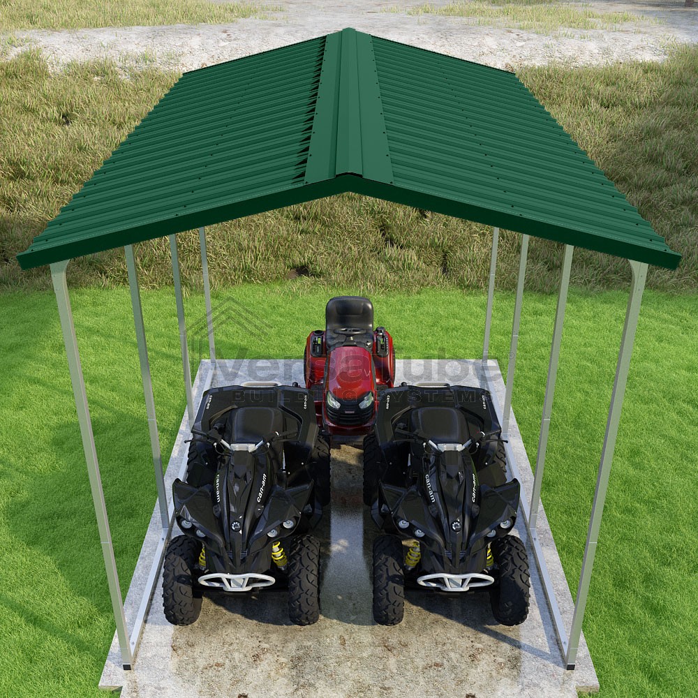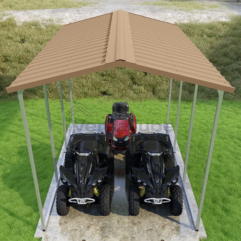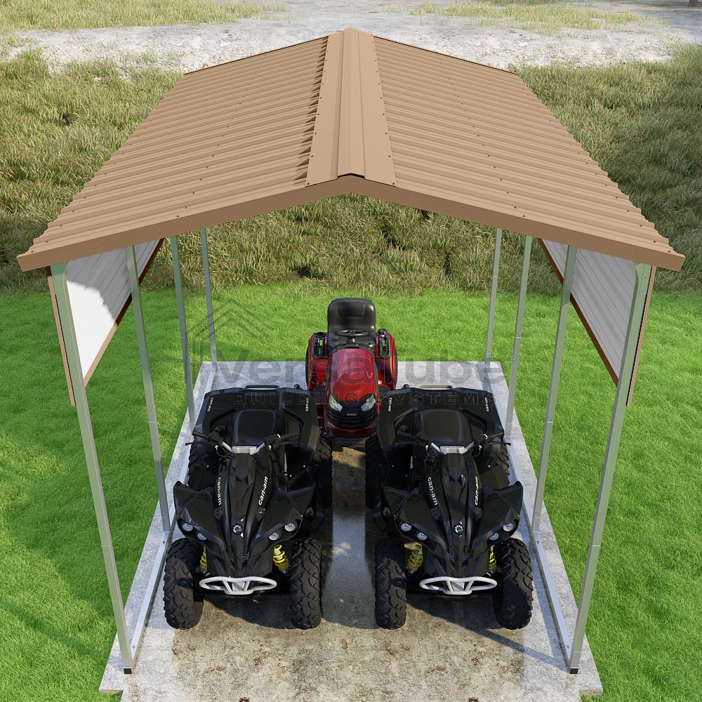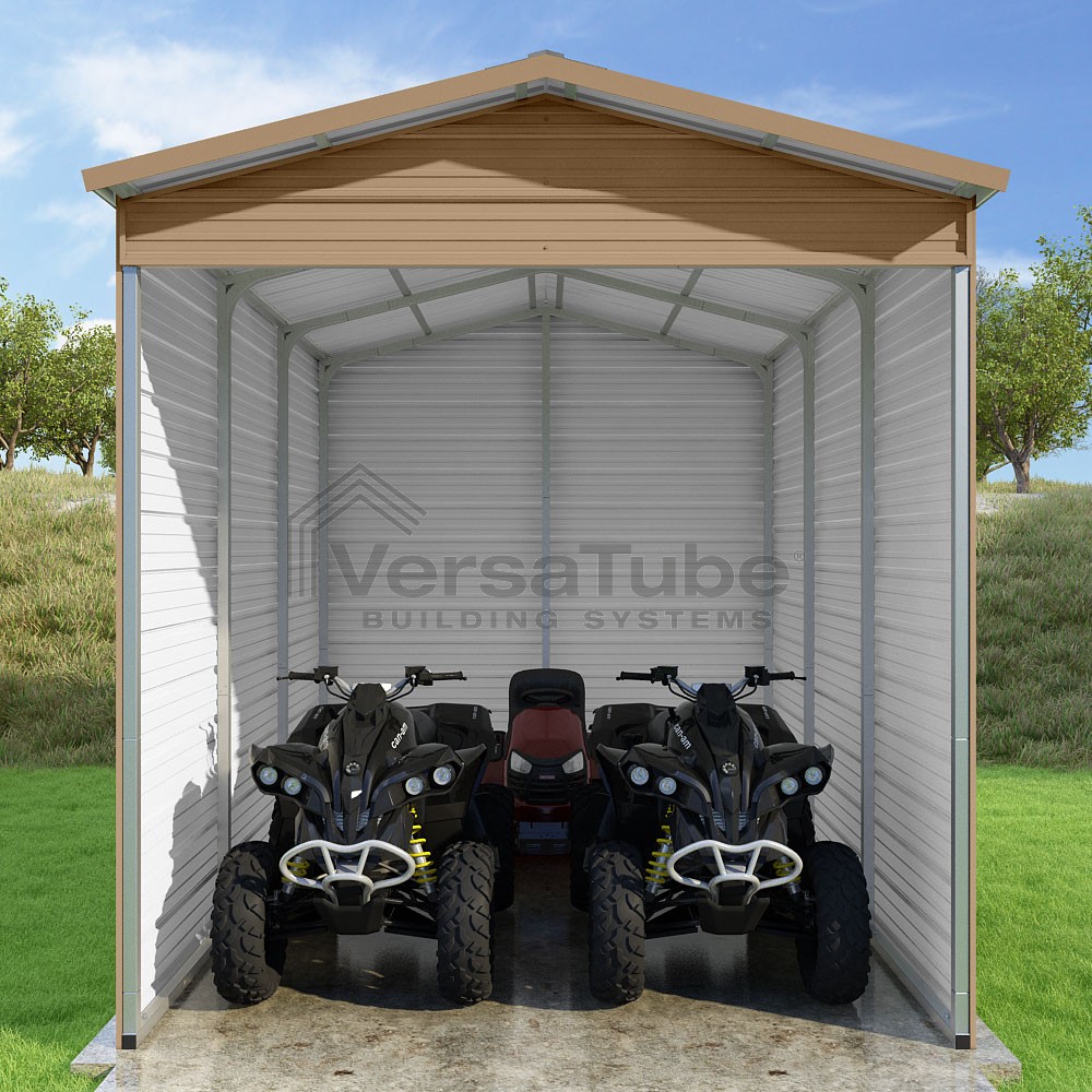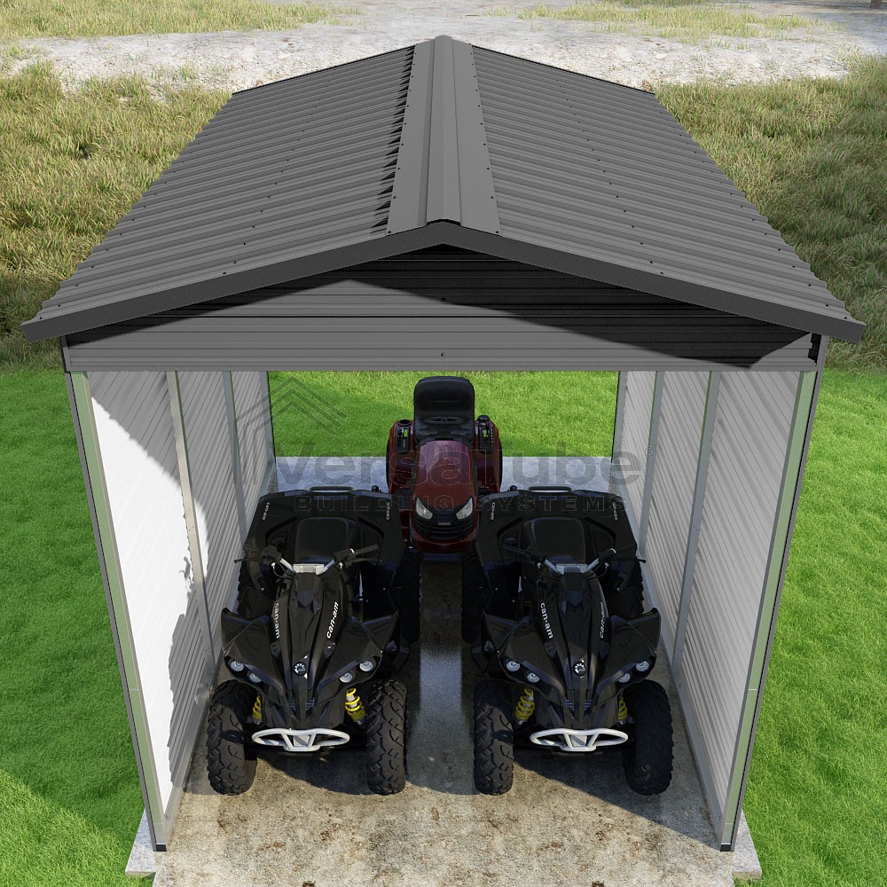 Pinnacle Series DIY carport kit features vertical sheet metal roof panels with ridge cap, gable and eave trim for an A-frame roof style and extended coverage on both ends.