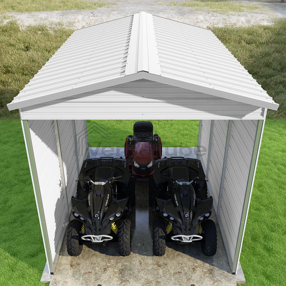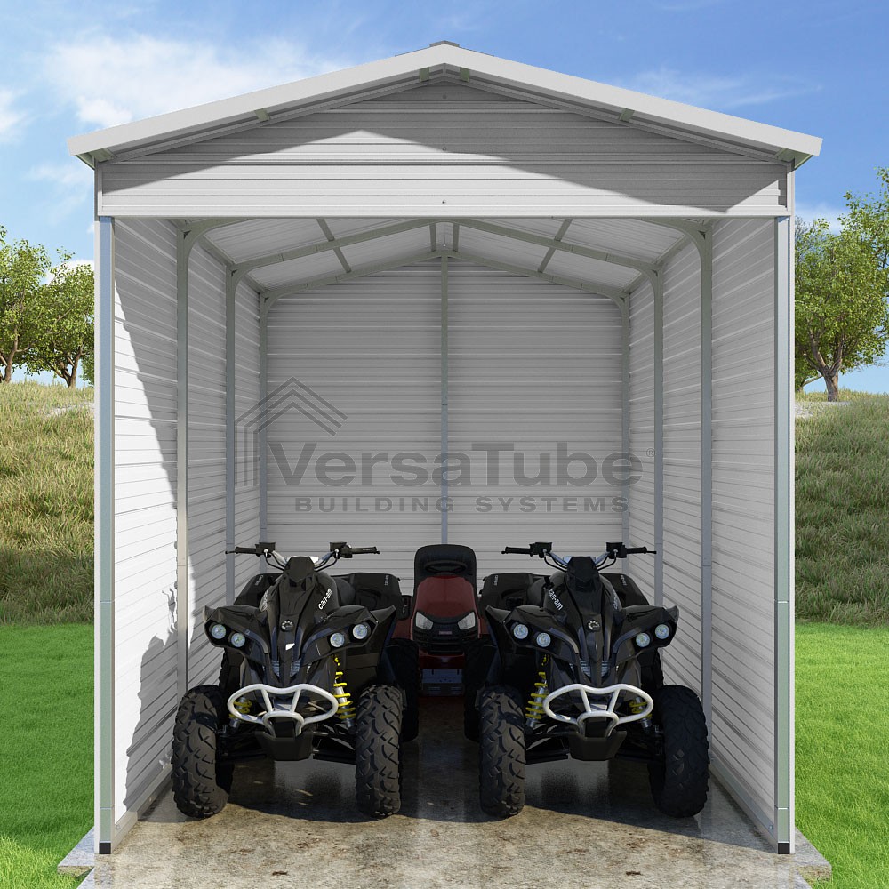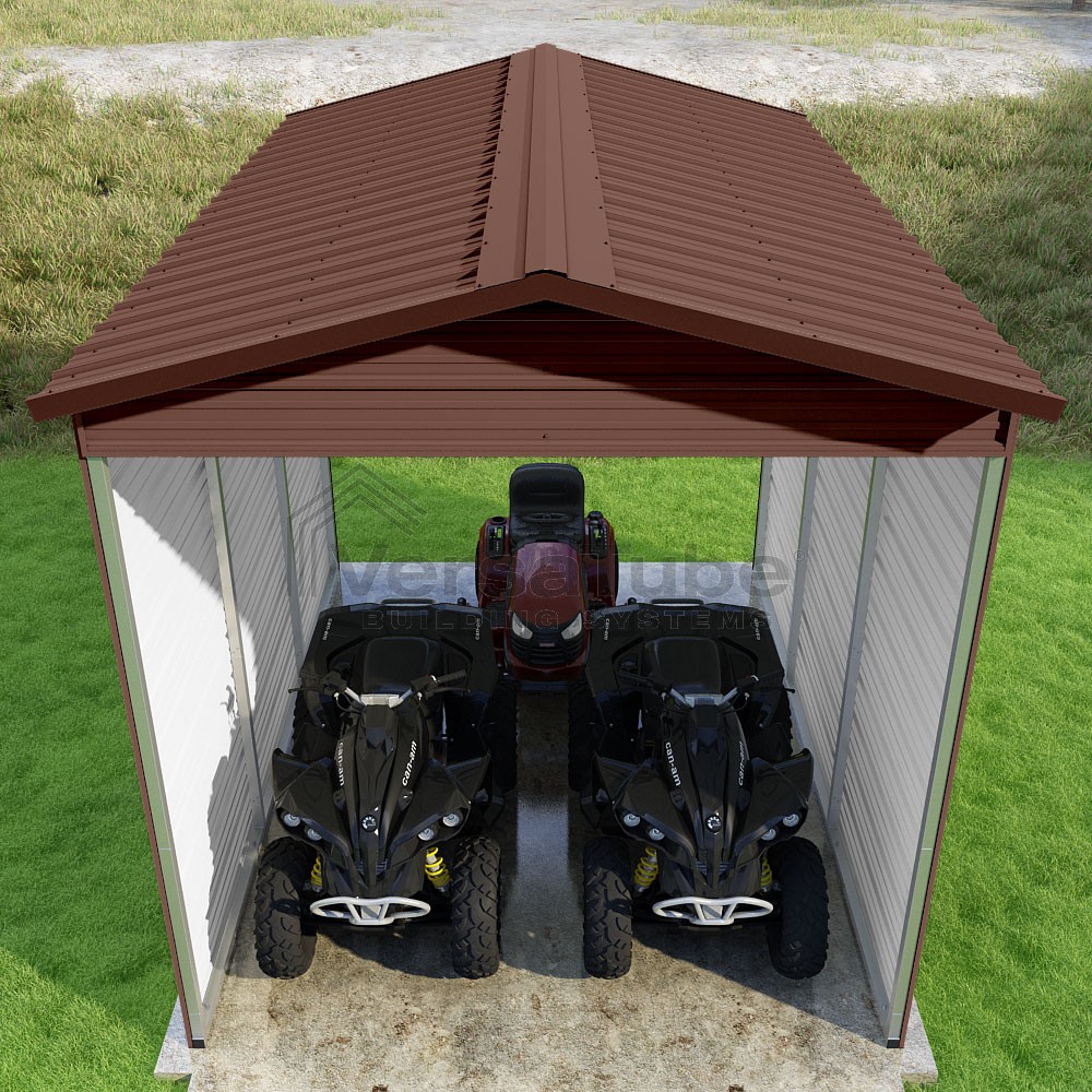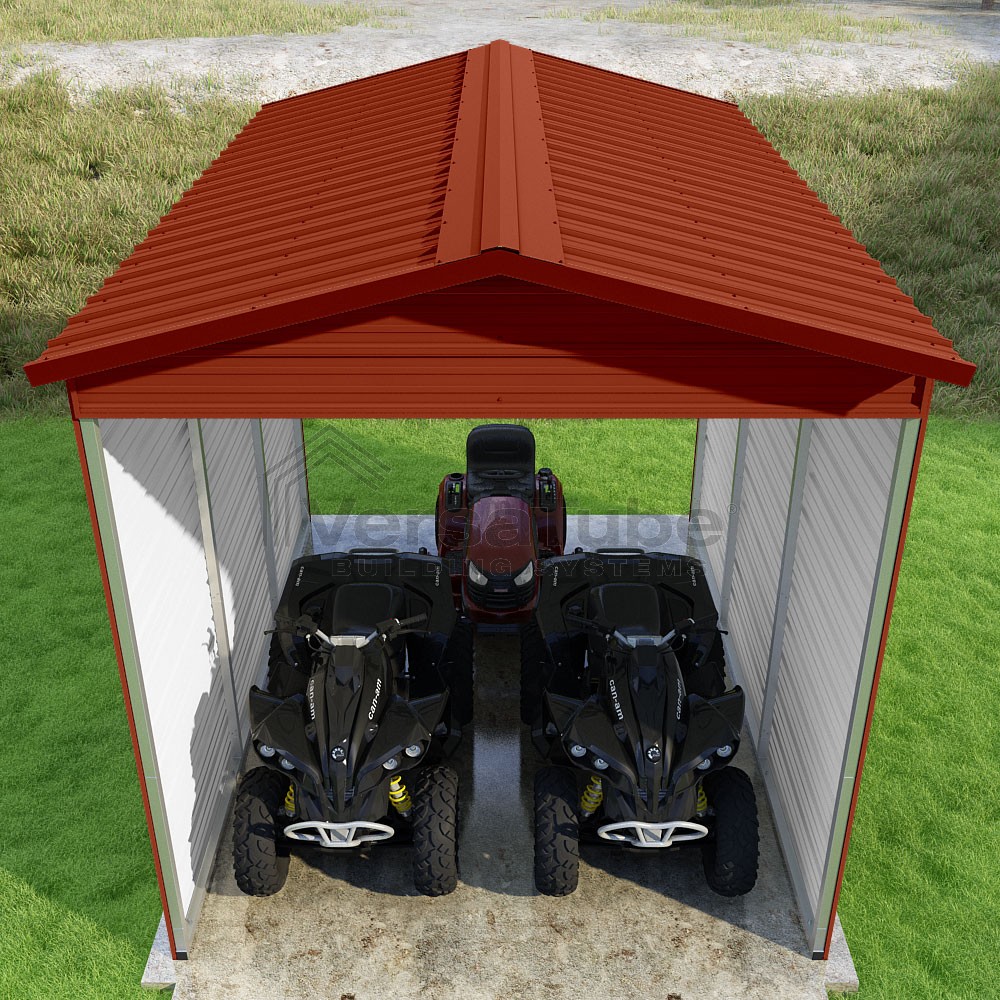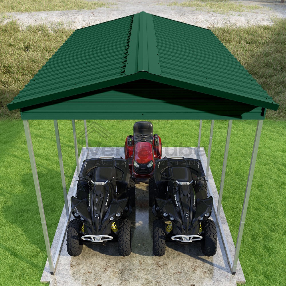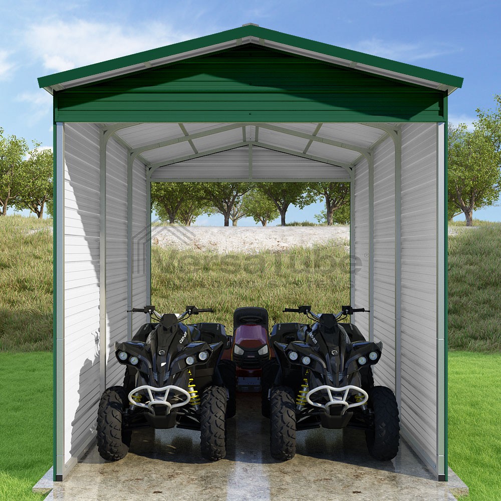 Pinnacle Series DIY carport kit features vertical sheet metal roof panels with ridge cap, gable and eave trim for an A-frame roof style and extended coverage on both ends.