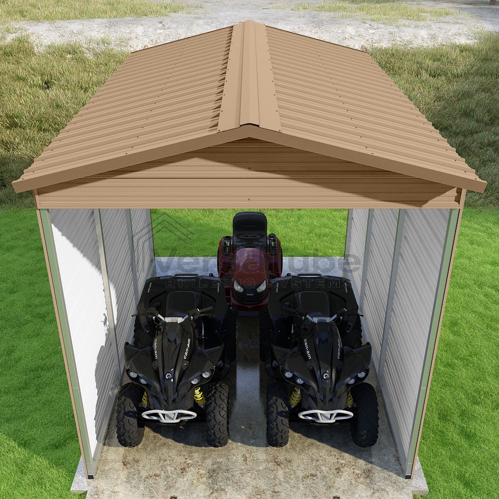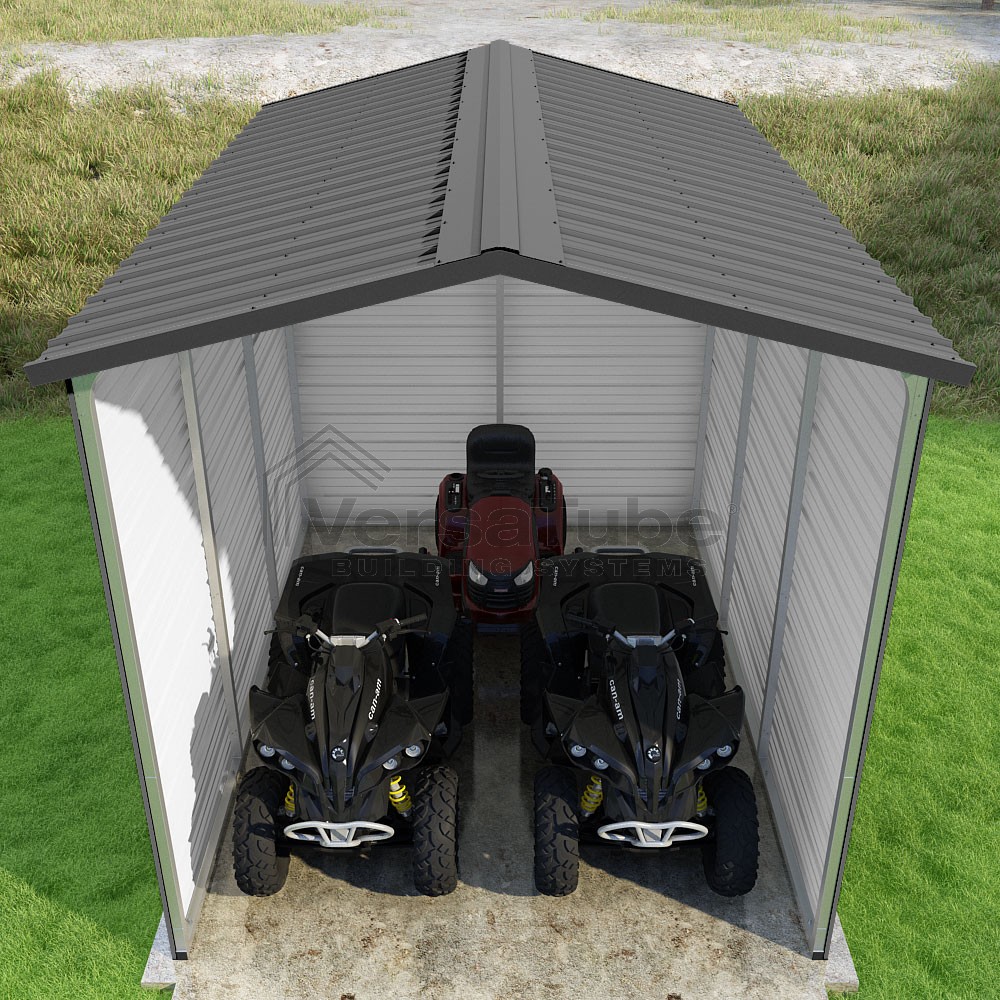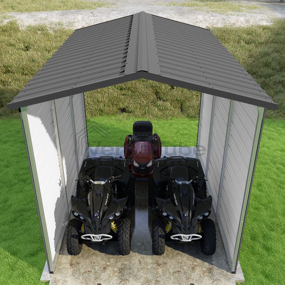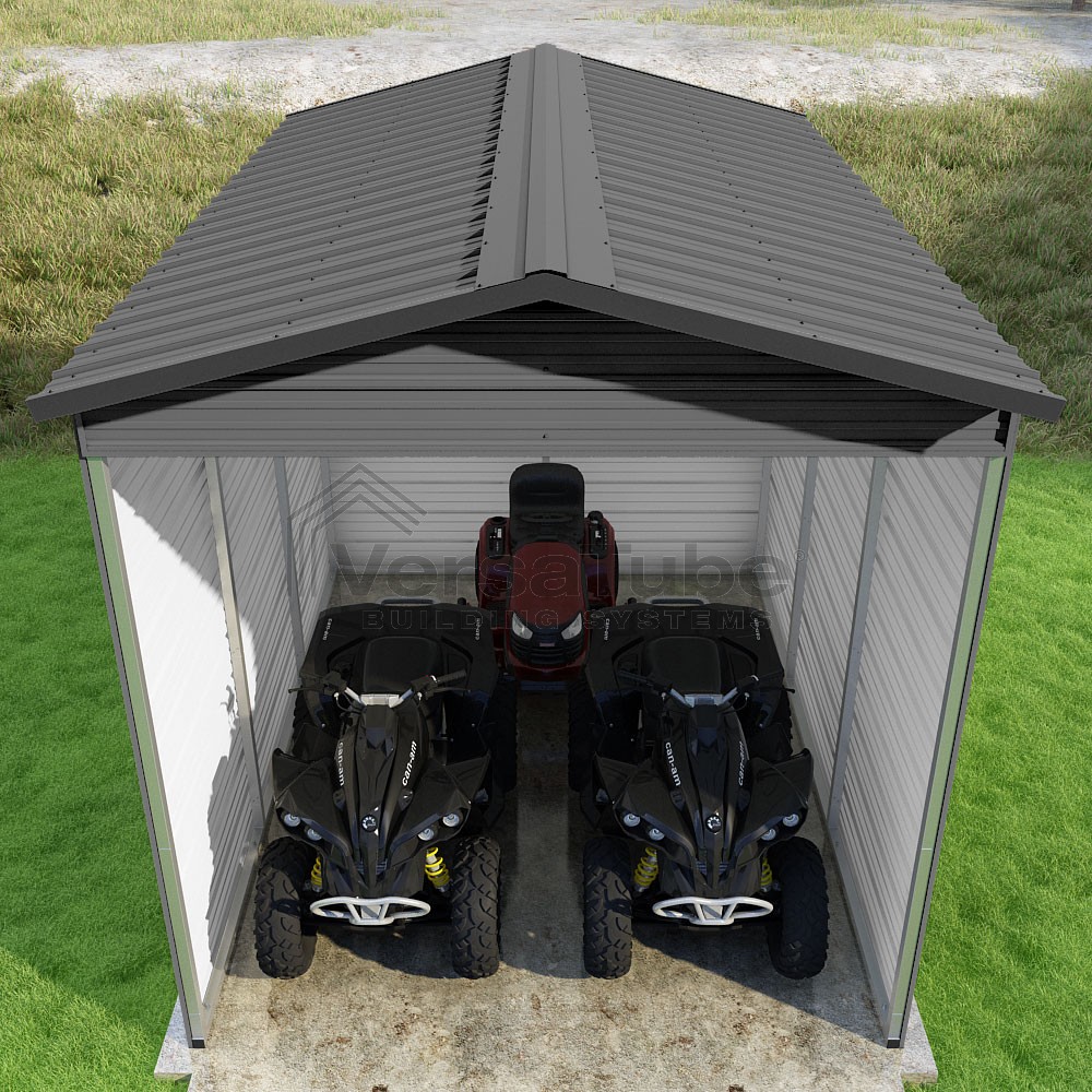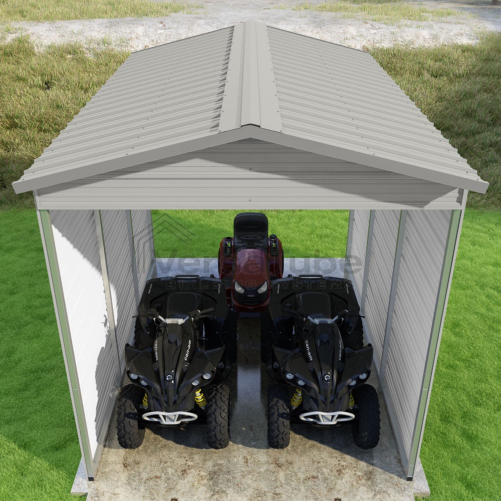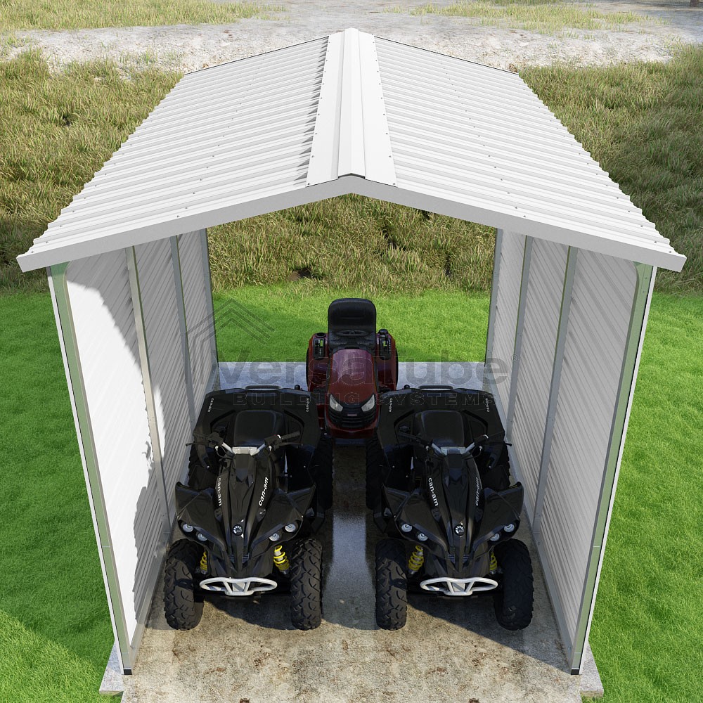 Pinnacle Series DIY carport kit features vertical sheet metal roof panels with ridge cap, gable and eave trim for an A-frame roof style and extended coverage on both ends.