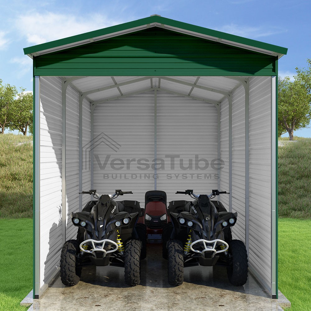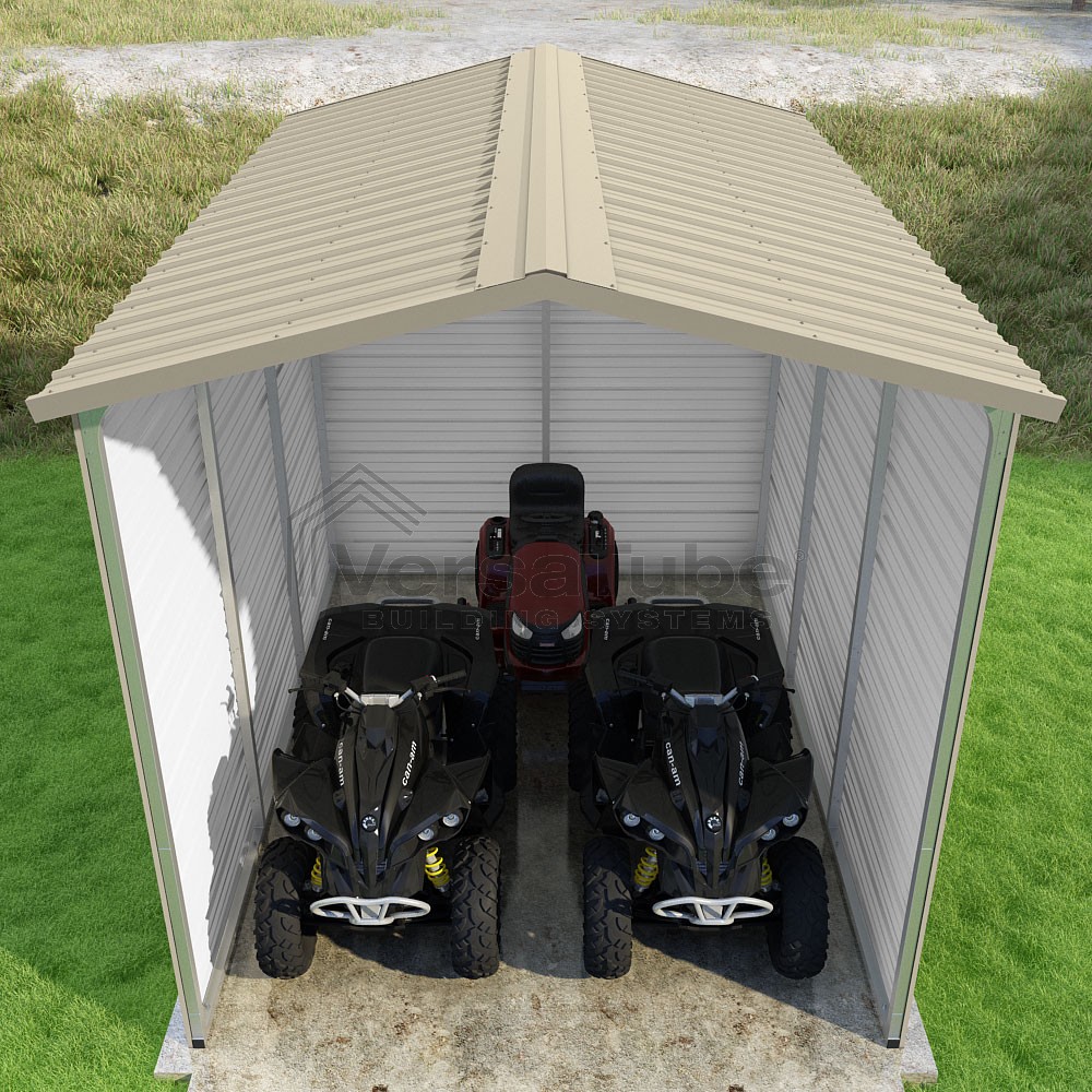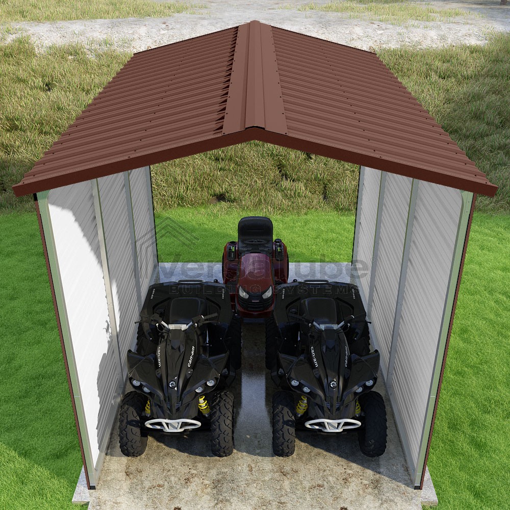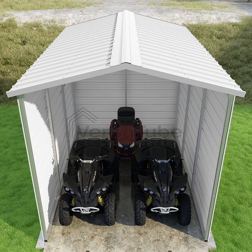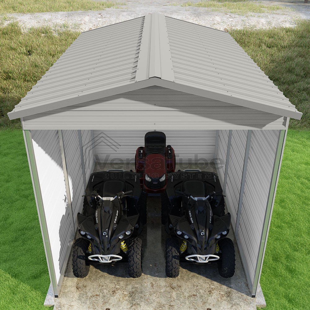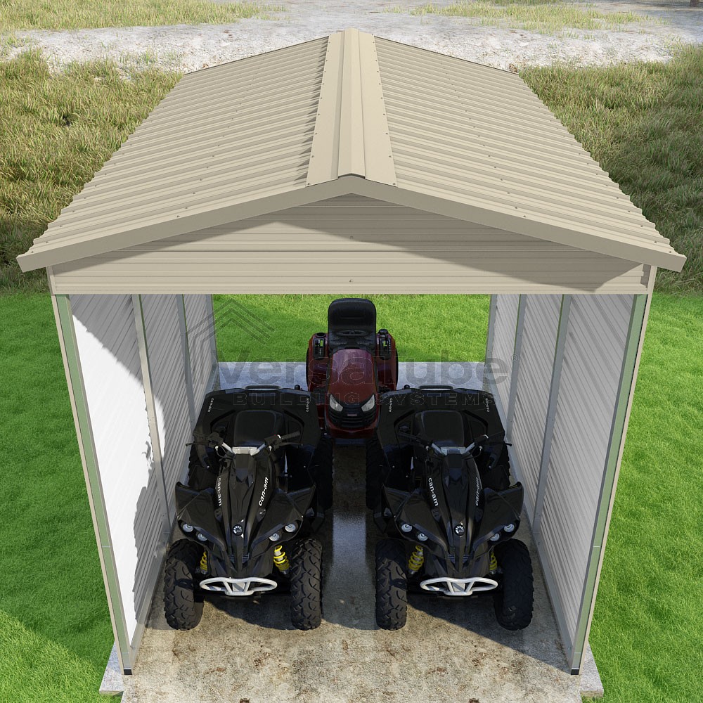 Pinnacle Series DIY carport kit features vertical sheet metal roof panels with ridge cap, gable and eave trim for an A-frame roof style and extended coverage on both ends.