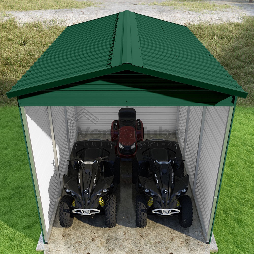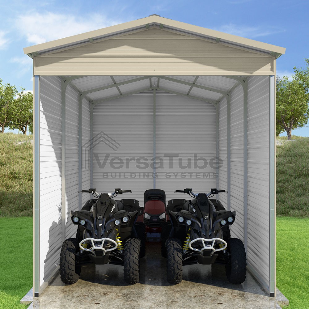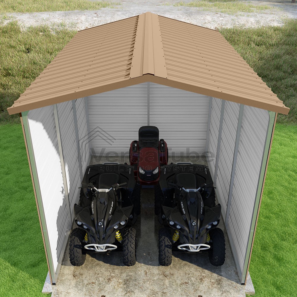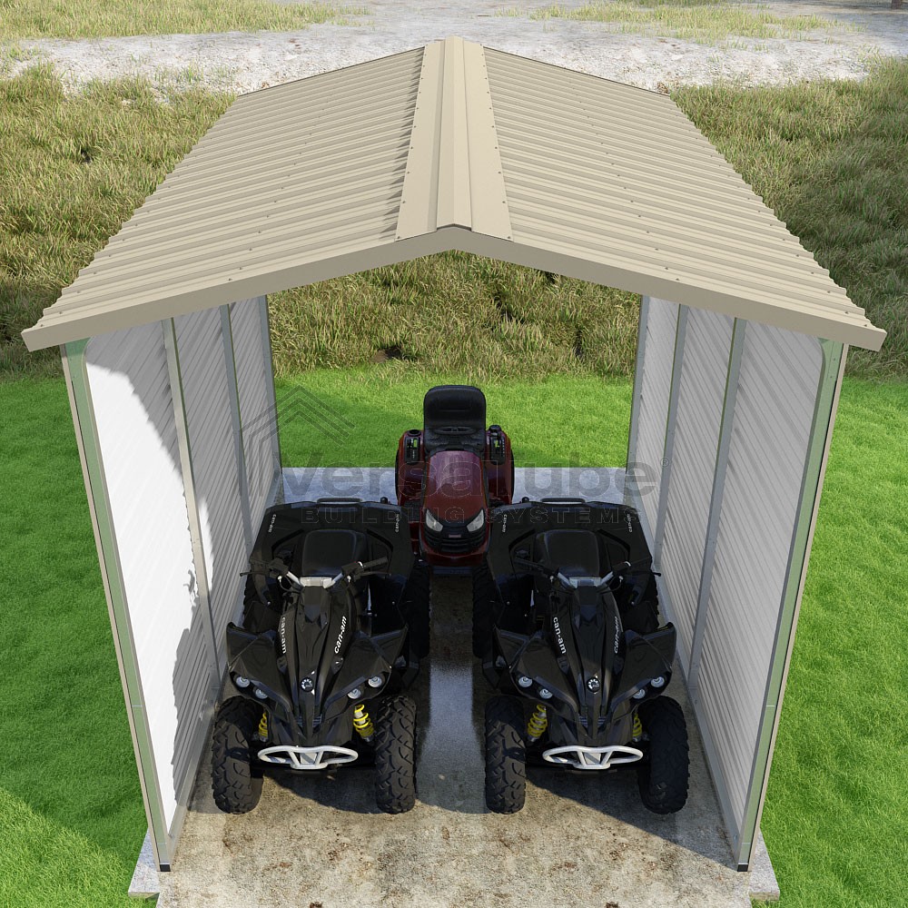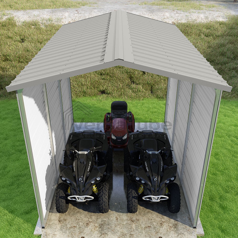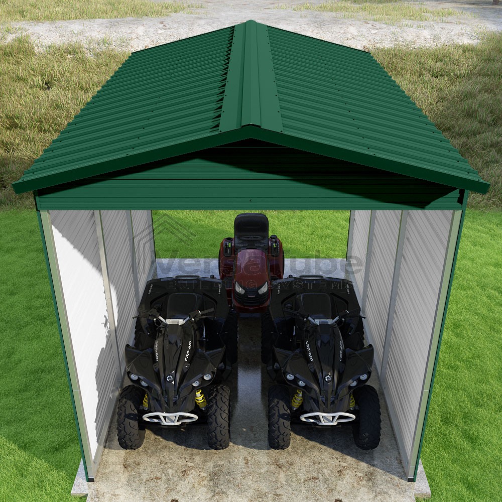 Pinnacle Series DIY carport kit features vertical sheet metal roof panels with ridge cap, gable and eave trim for an A-frame roof style and extended coverage on both ends.