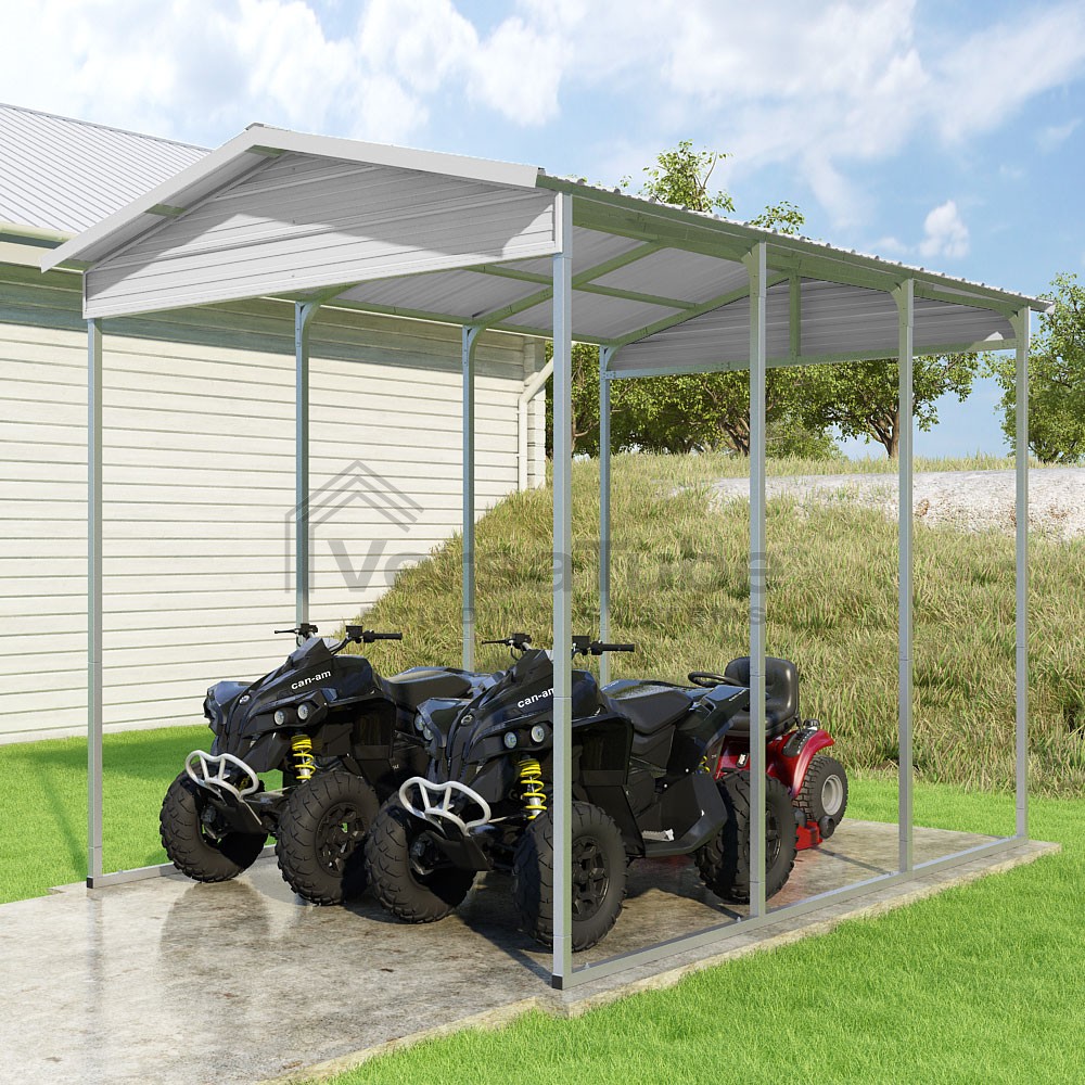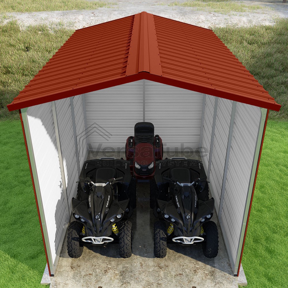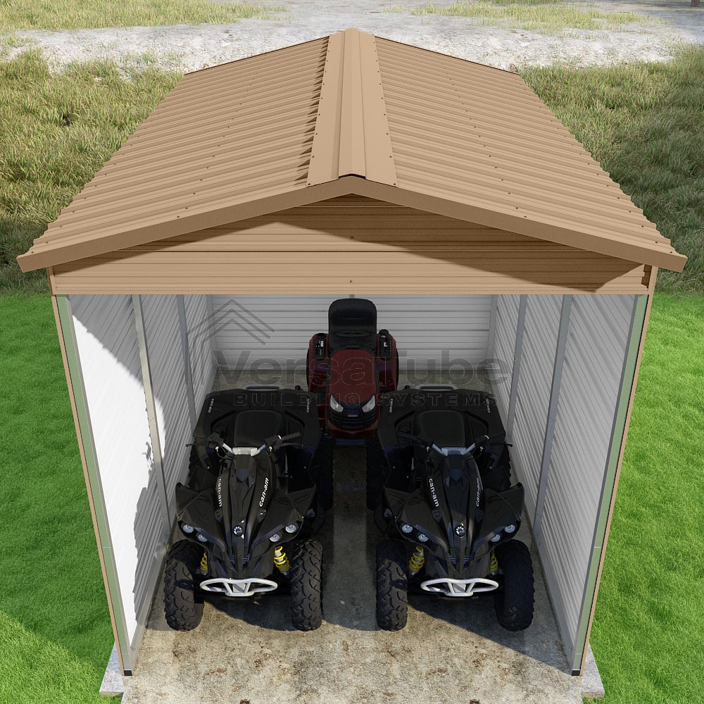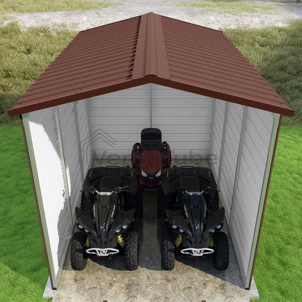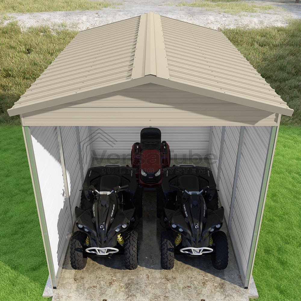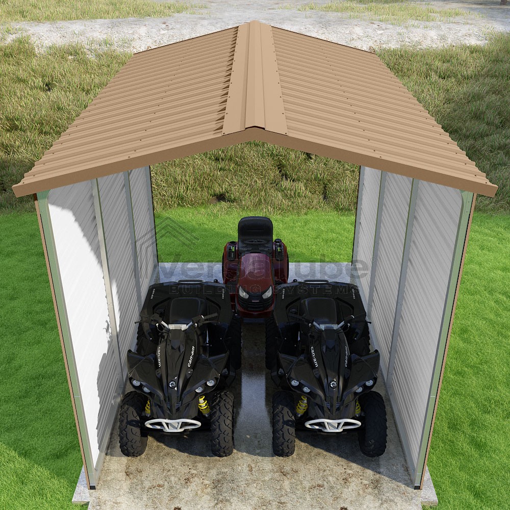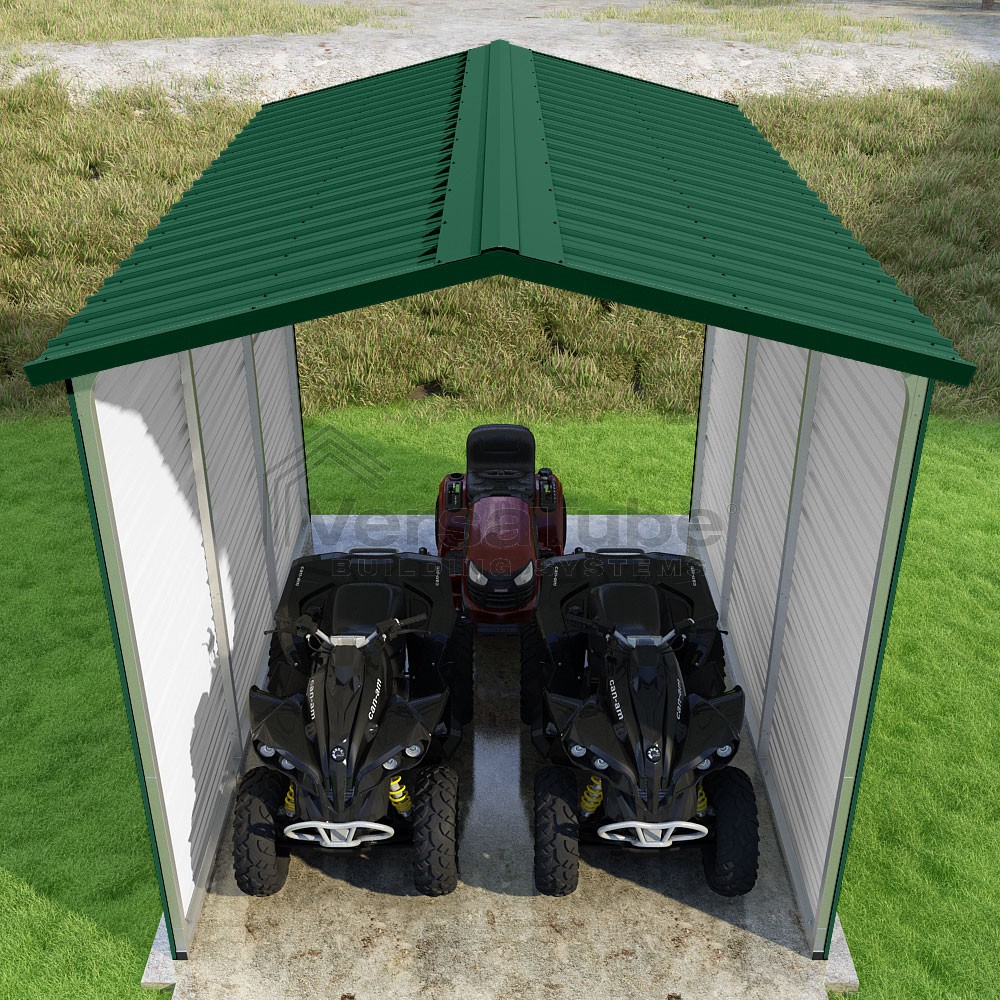 Pinnacle Series DIY carport kit features vertical sheet metal roof panels with ridge cap, gable and eave trim for an A-frame roof style and extended coverage on both ends.
