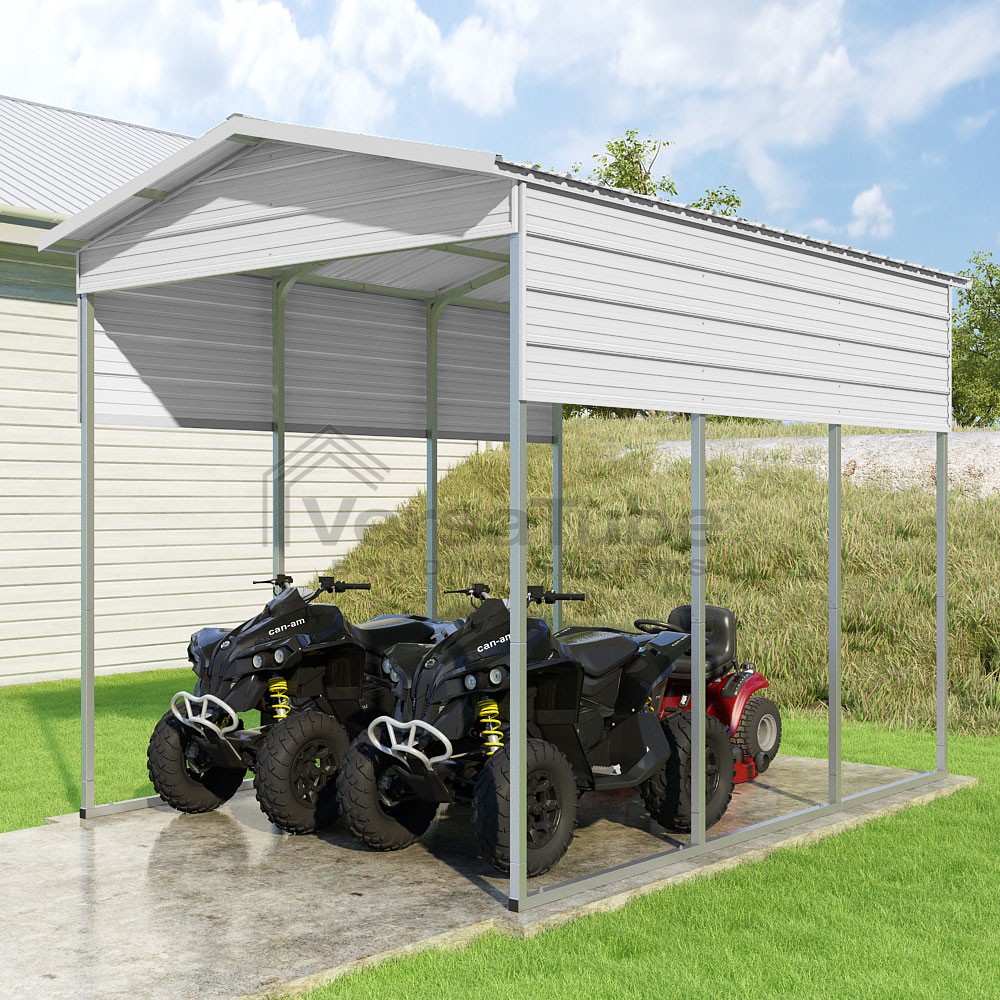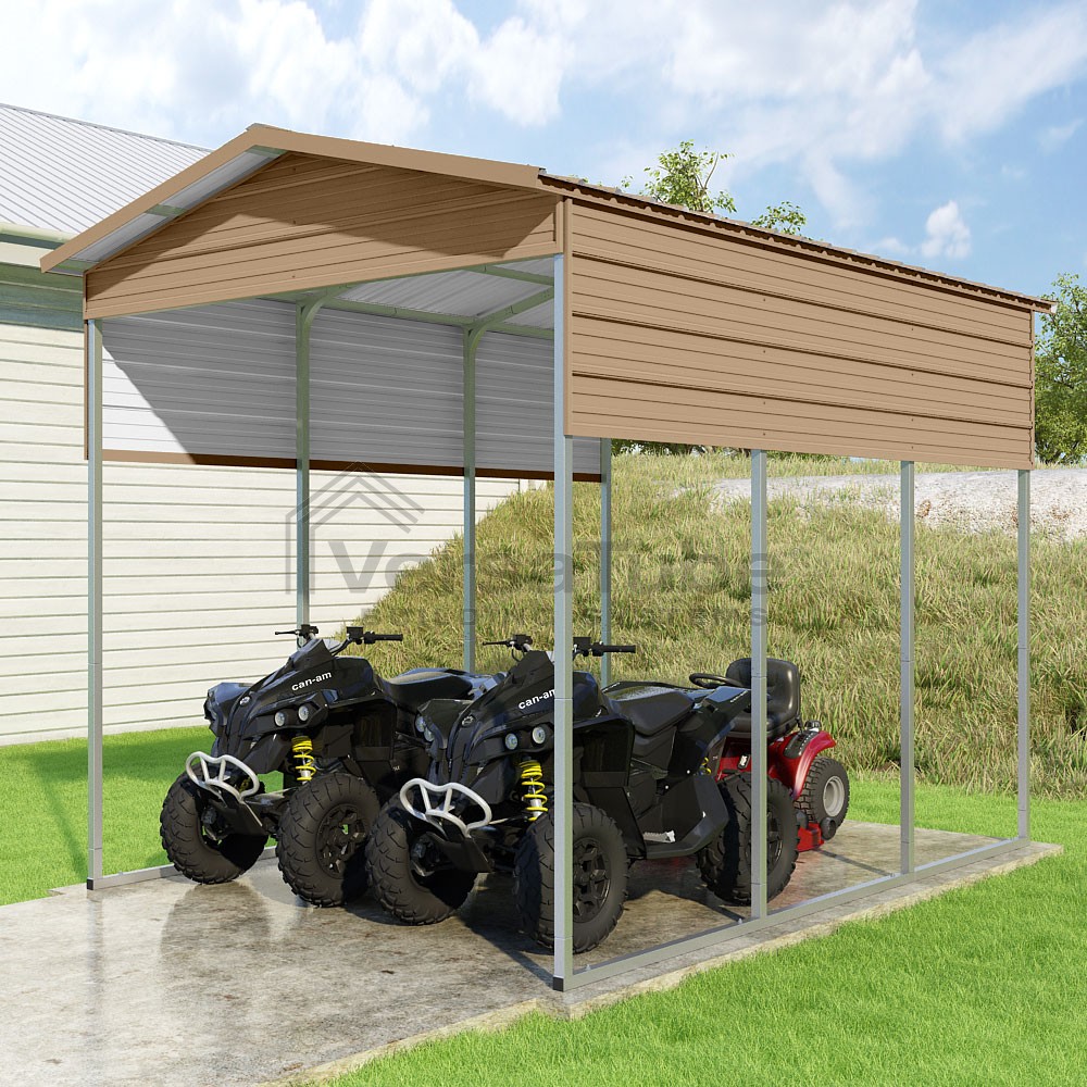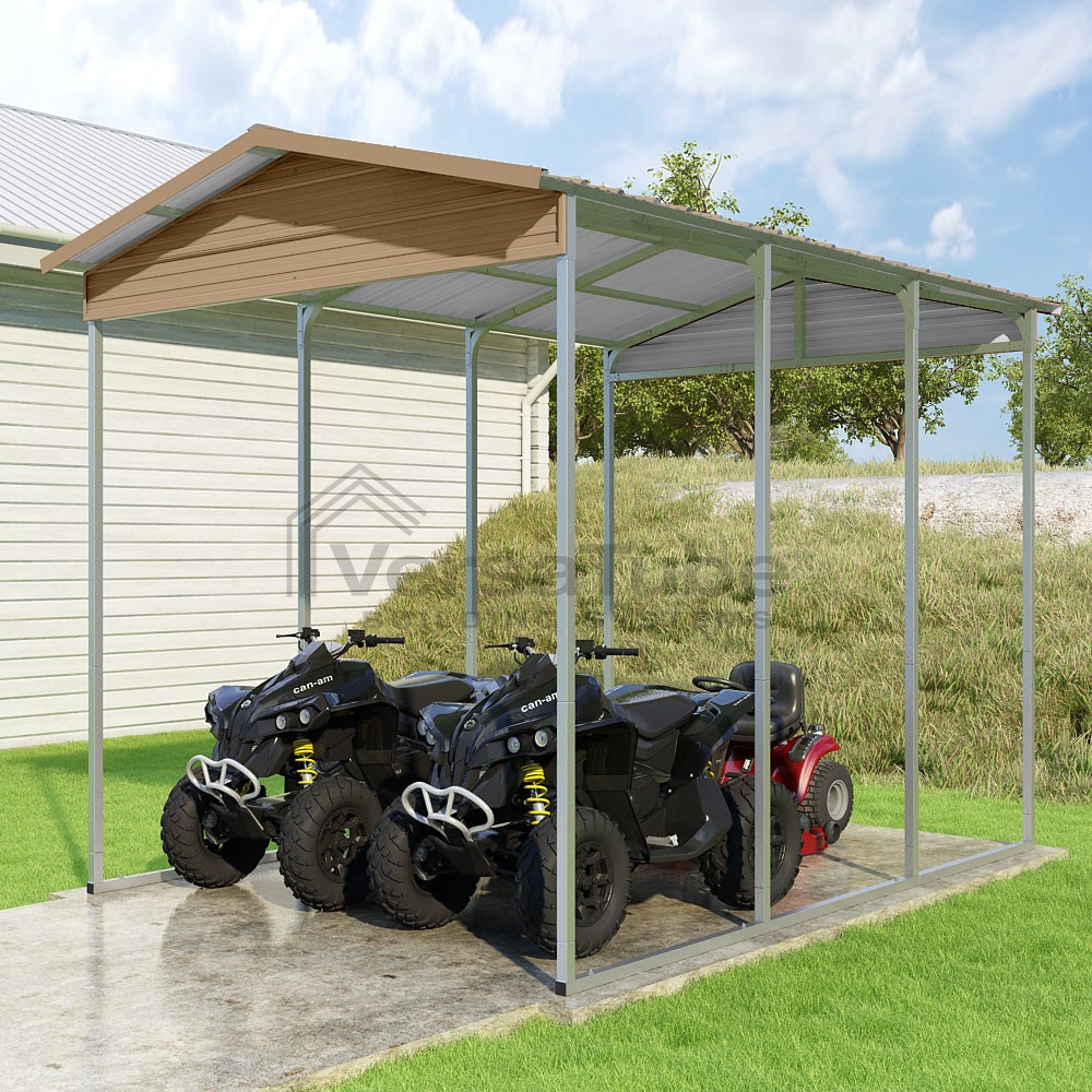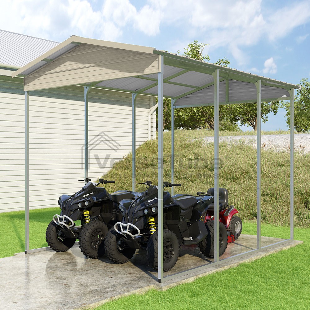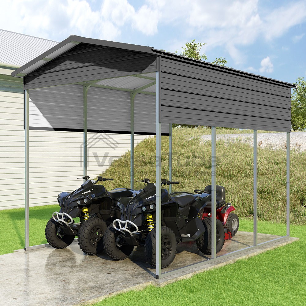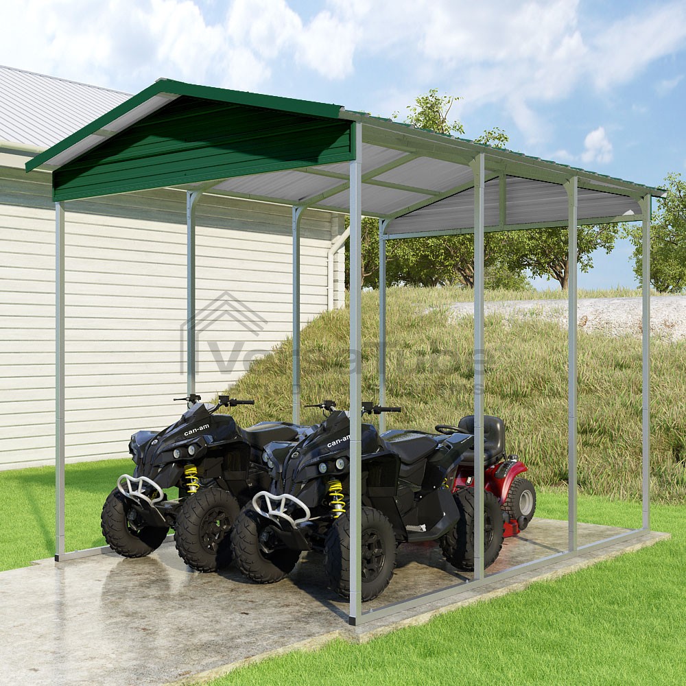 Pinnacle Series DIY carport kit features vertical sheet metal roof panels with ridge cap, gable and eave trim for an A-frame roof style and extended coverage on both ends.