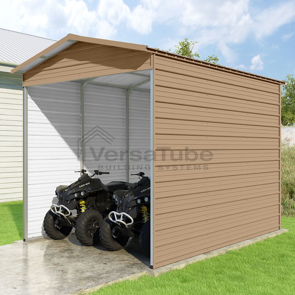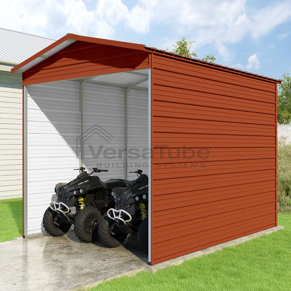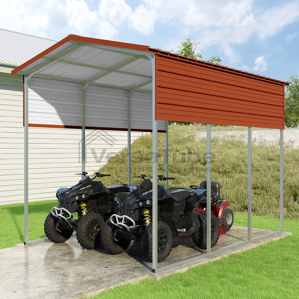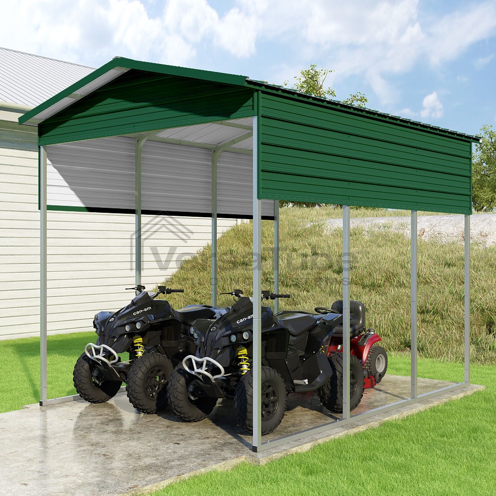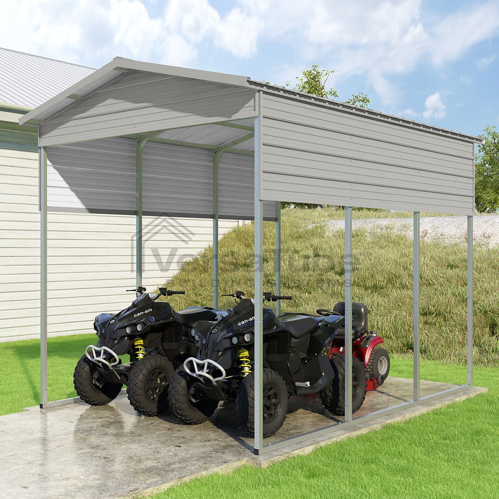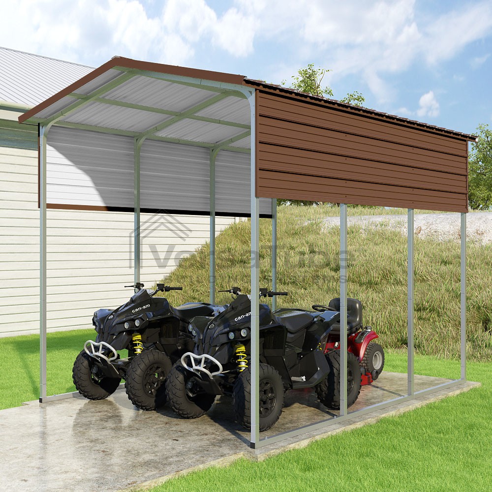 Pinnacle Series DIY carport kit features vertical sheet metal roof panels with ridge cap, gable and eave trim for an A-frame roof style and extended coverage on both ends.