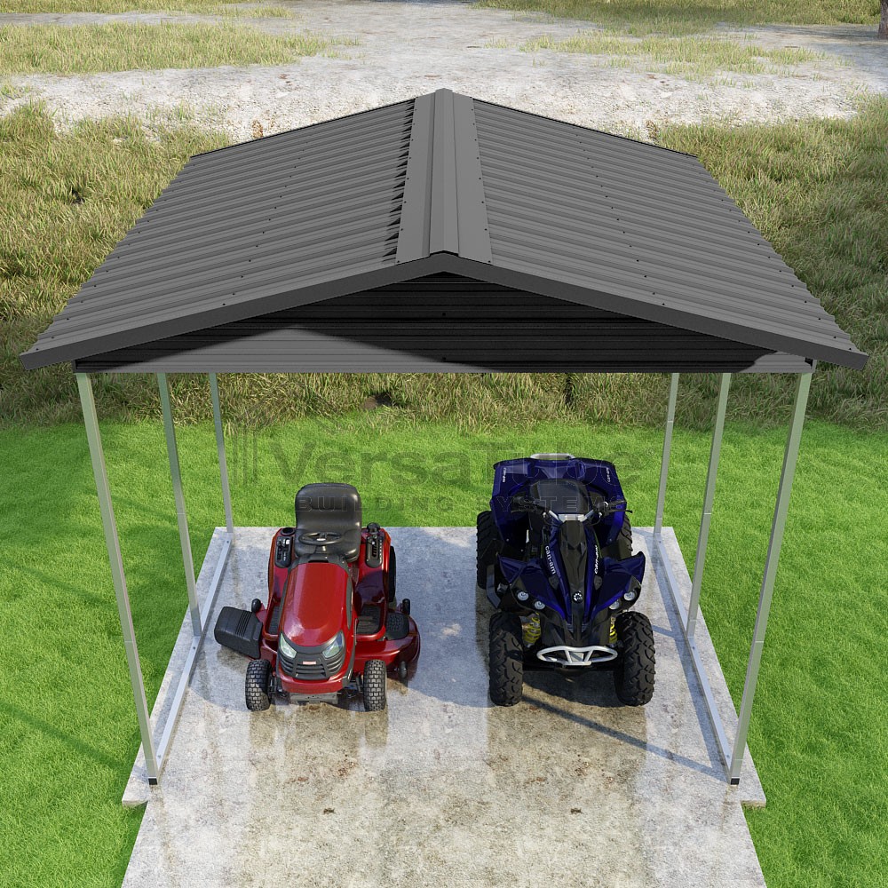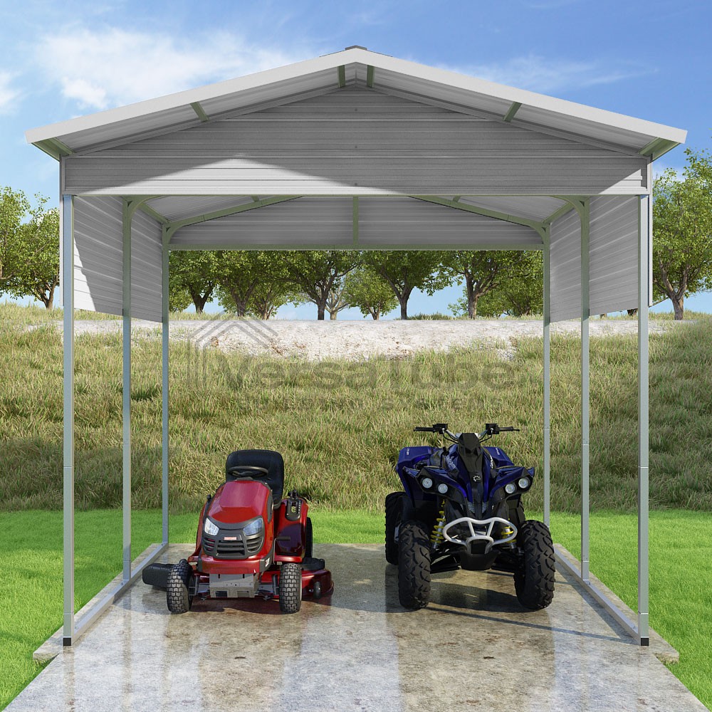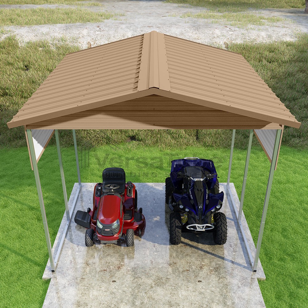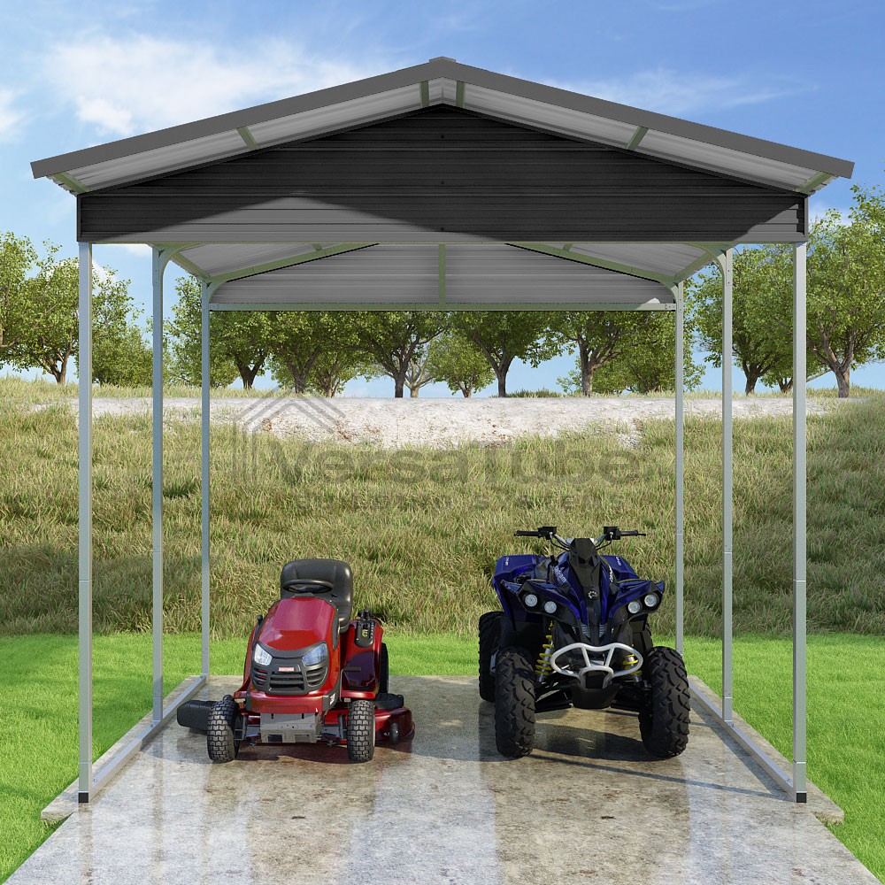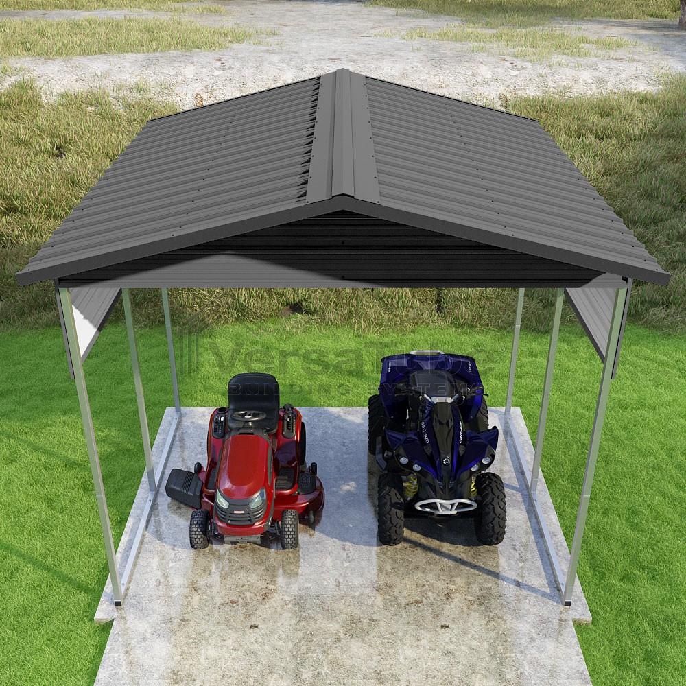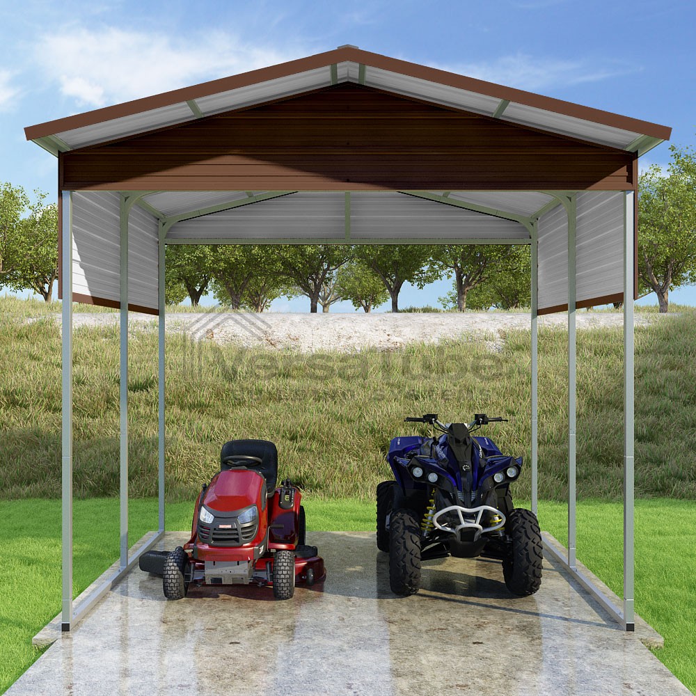 Pinnacle Series DIY carport kit features vertical sheet metal roof panels with ridge cap, gable and eave trim for an A-frame roof style and extended coverage on both ends.