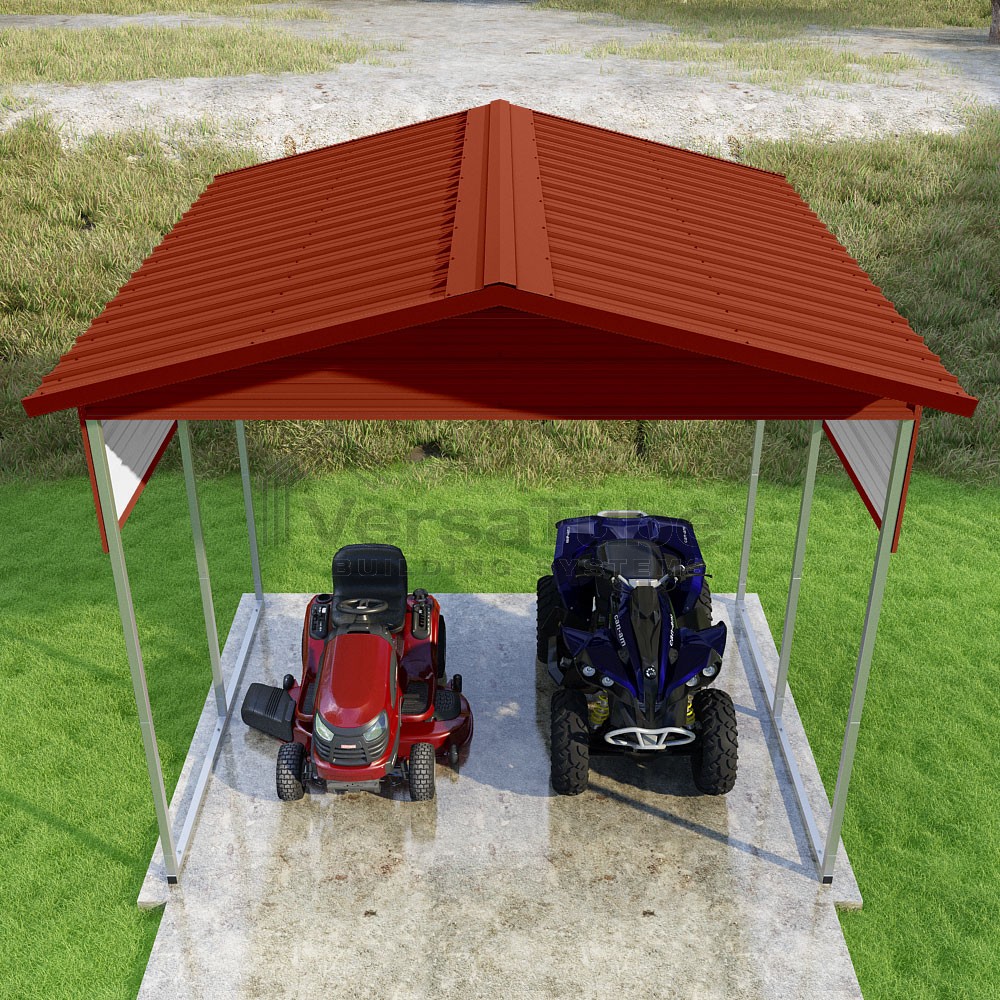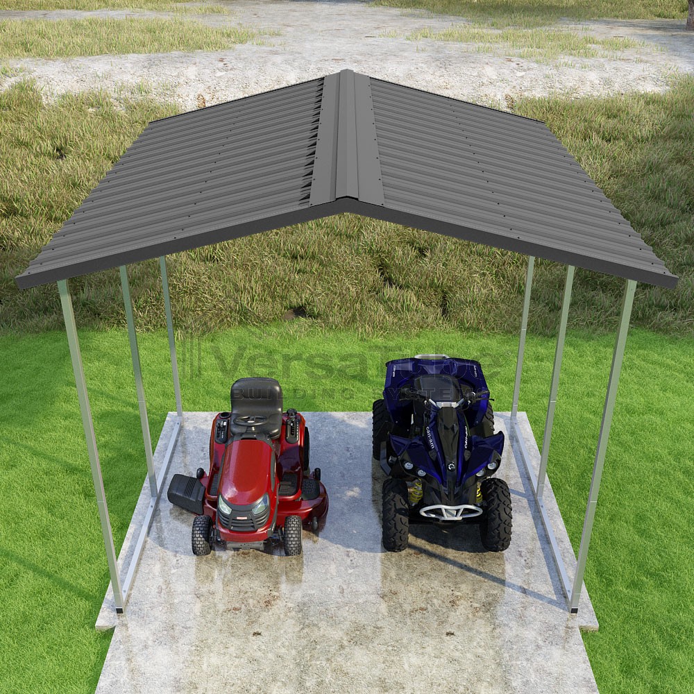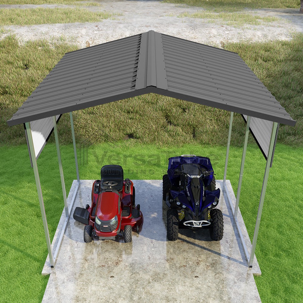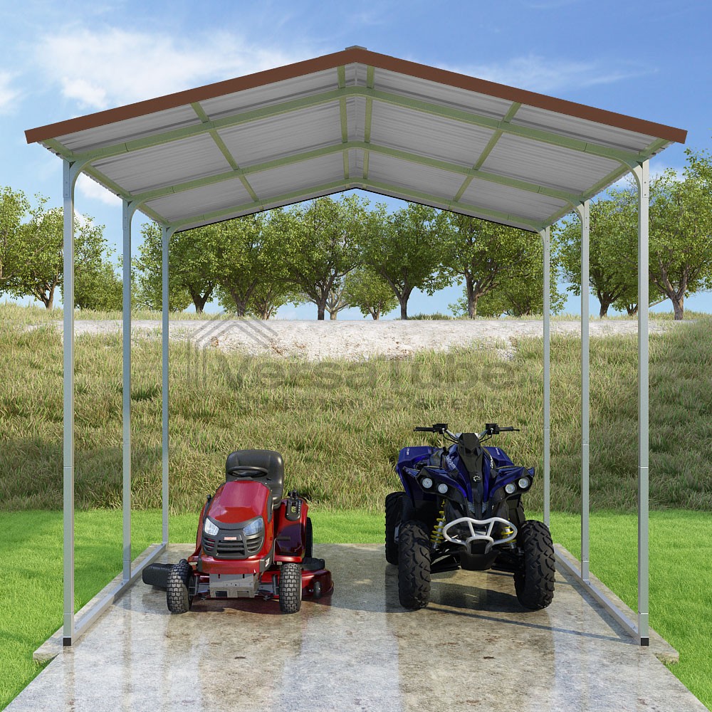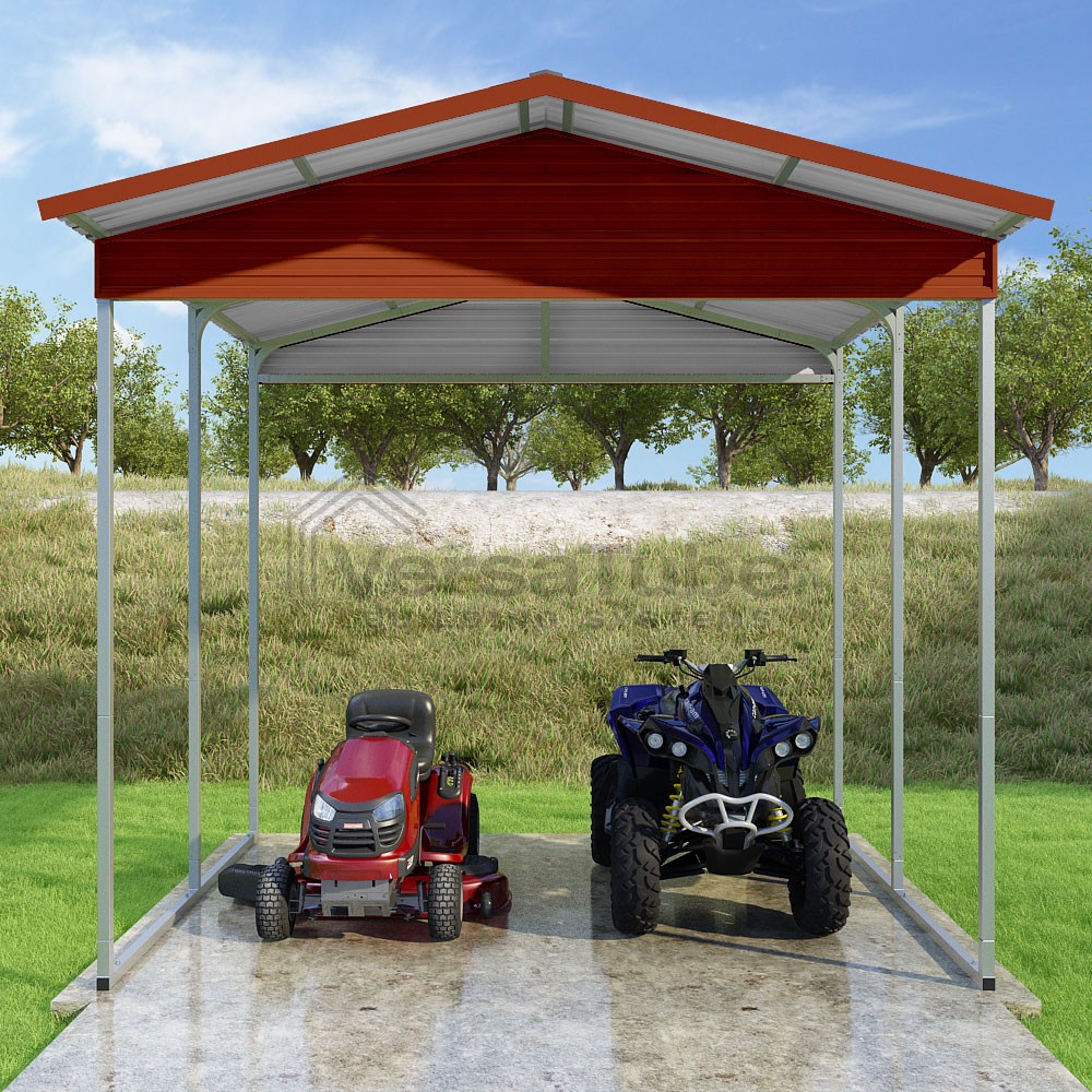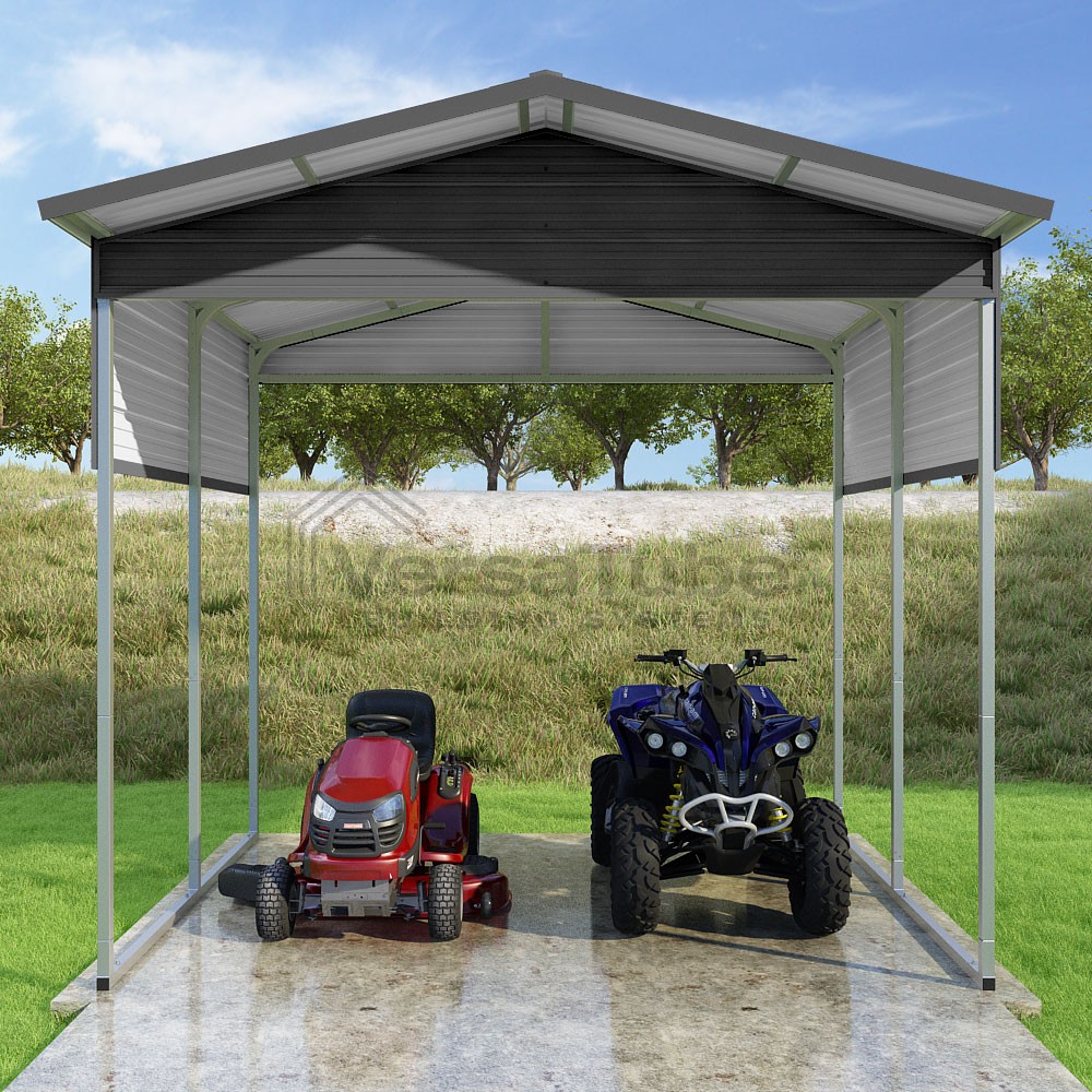 Pinnacle Series DIY carport kit features vertical sheet metal roof panels with ridge cap, gable and eave trim for an A-frame roof style and extended coverage on both ends.