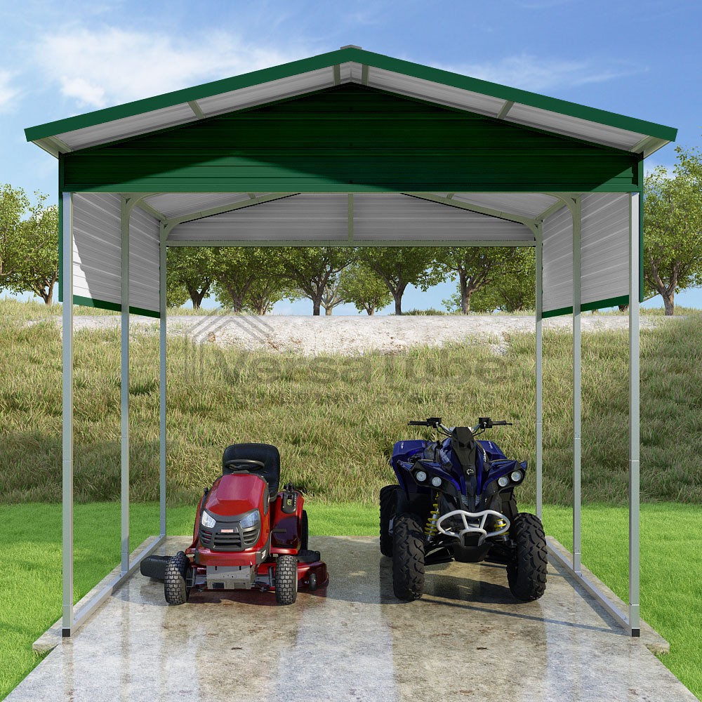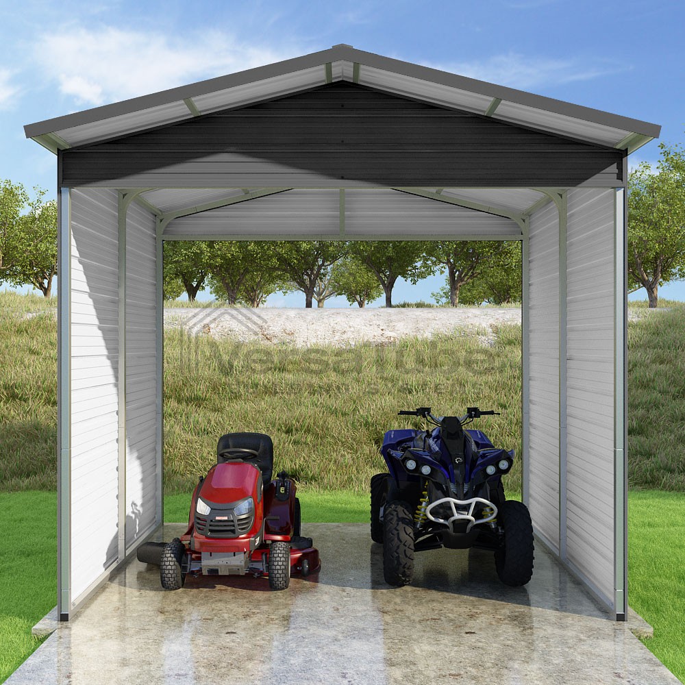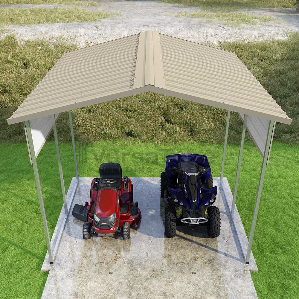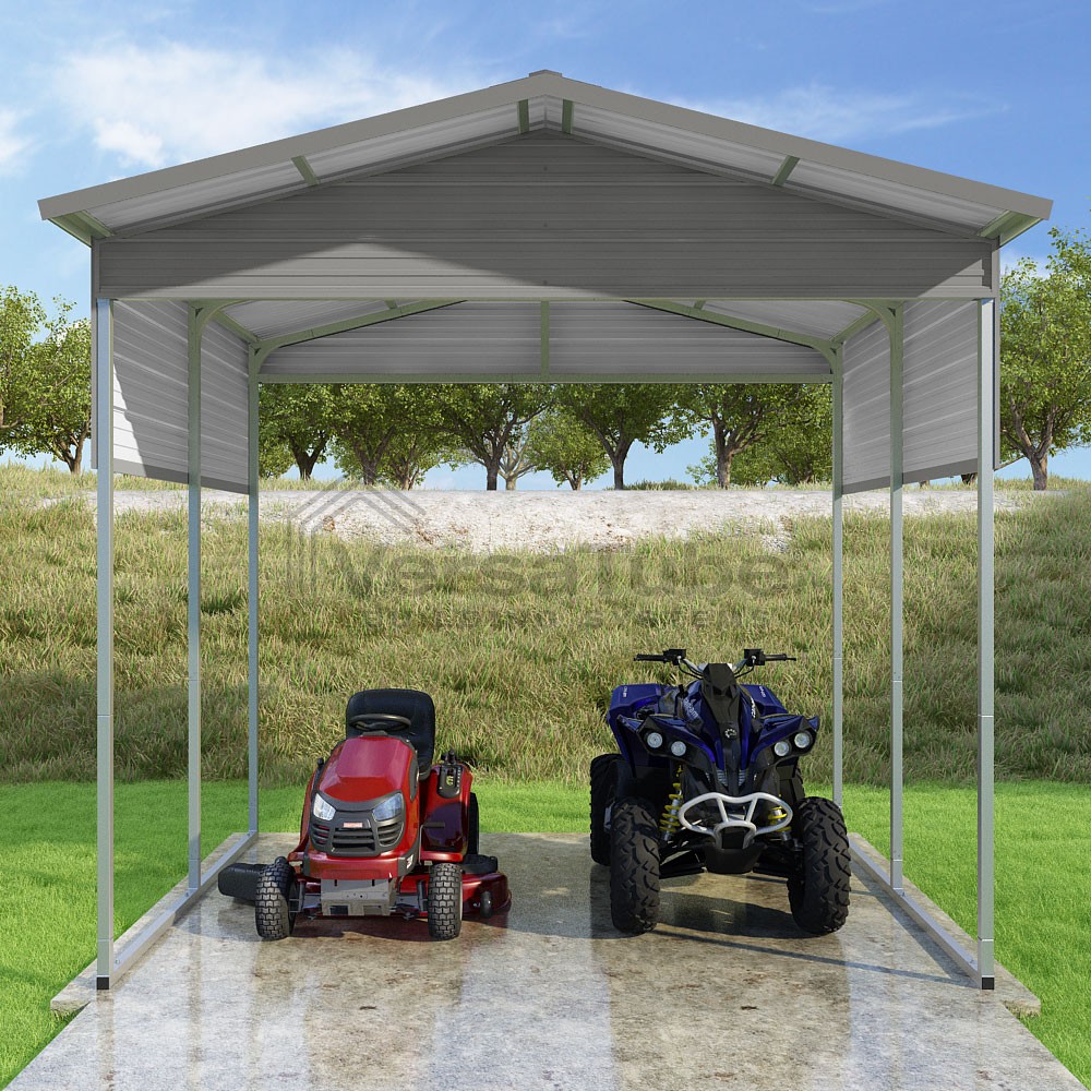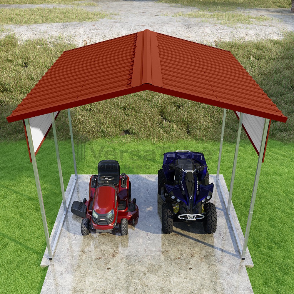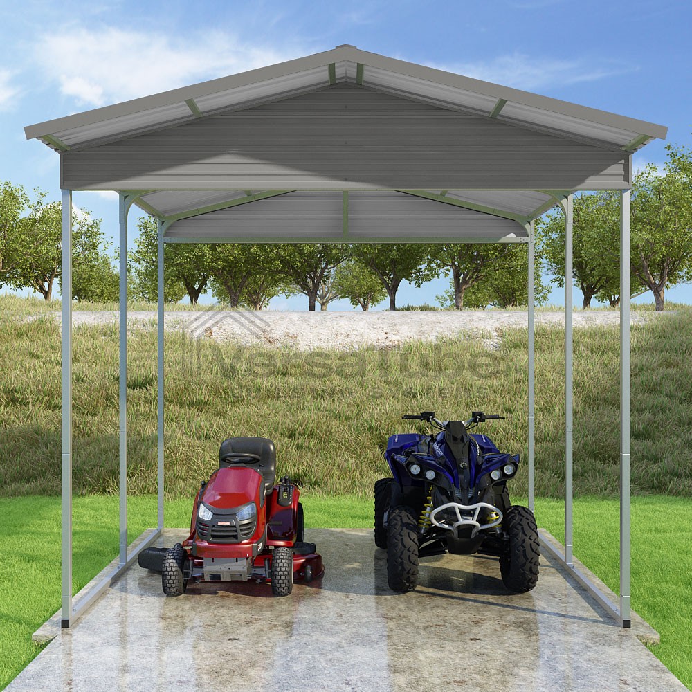 Pinnacle Series DIY carport kit features vertical sheet metal roof panels with ridge cap, gable and eave trim for an A-frame roof style and extended coverage on both ends.