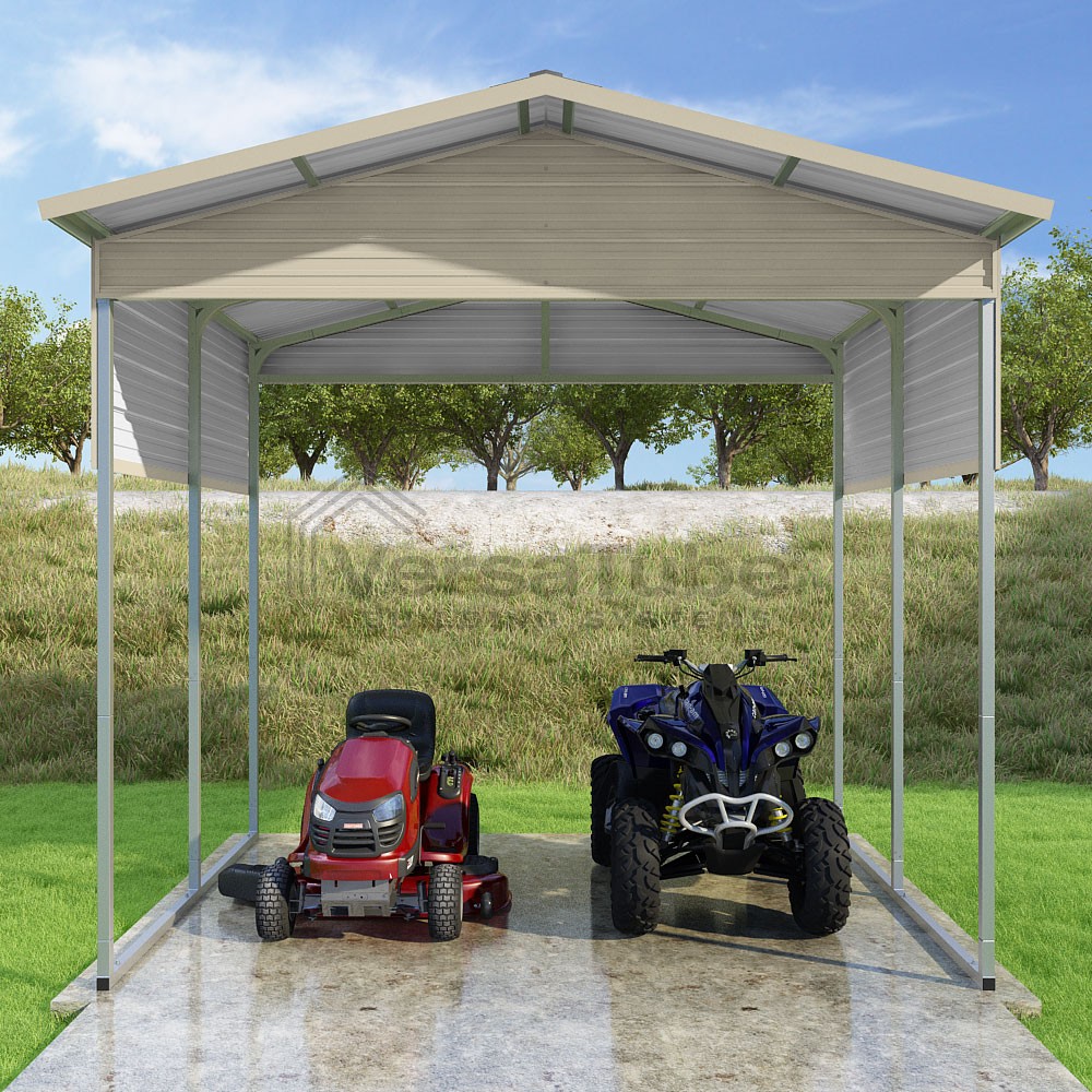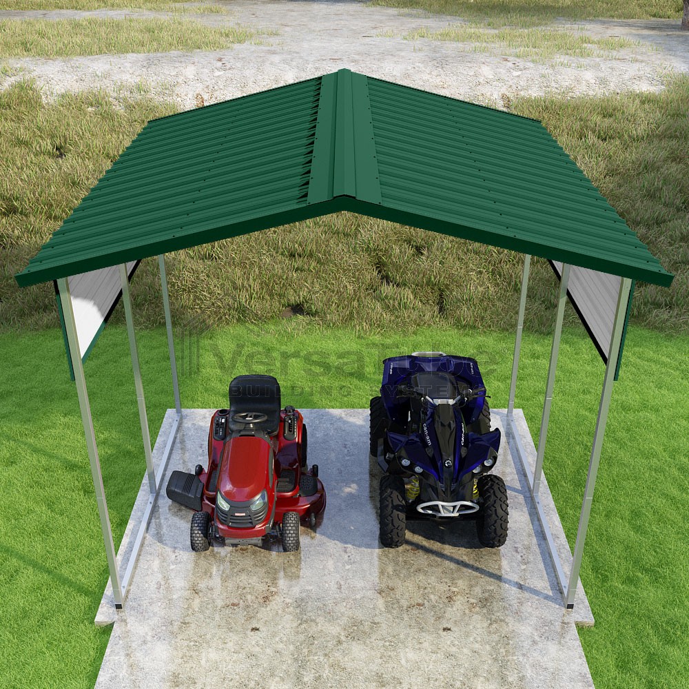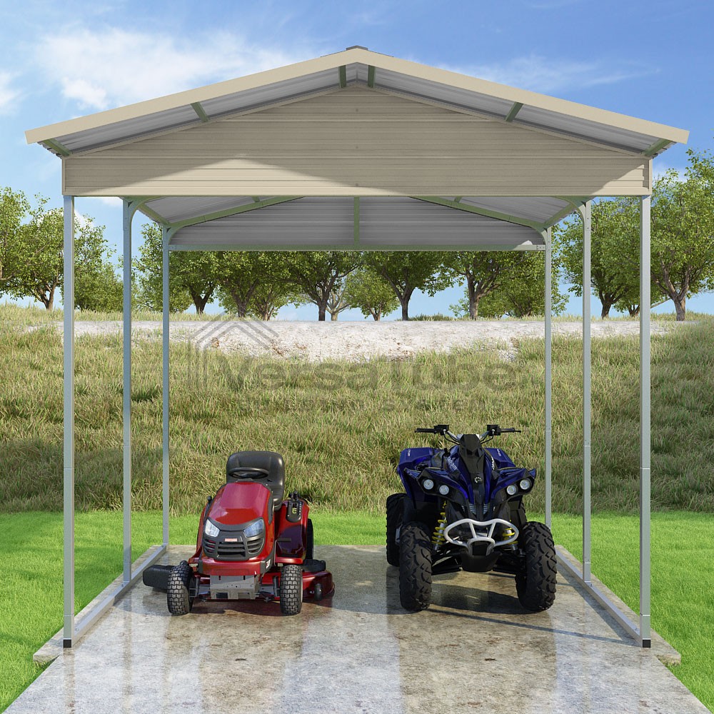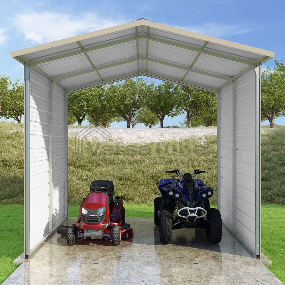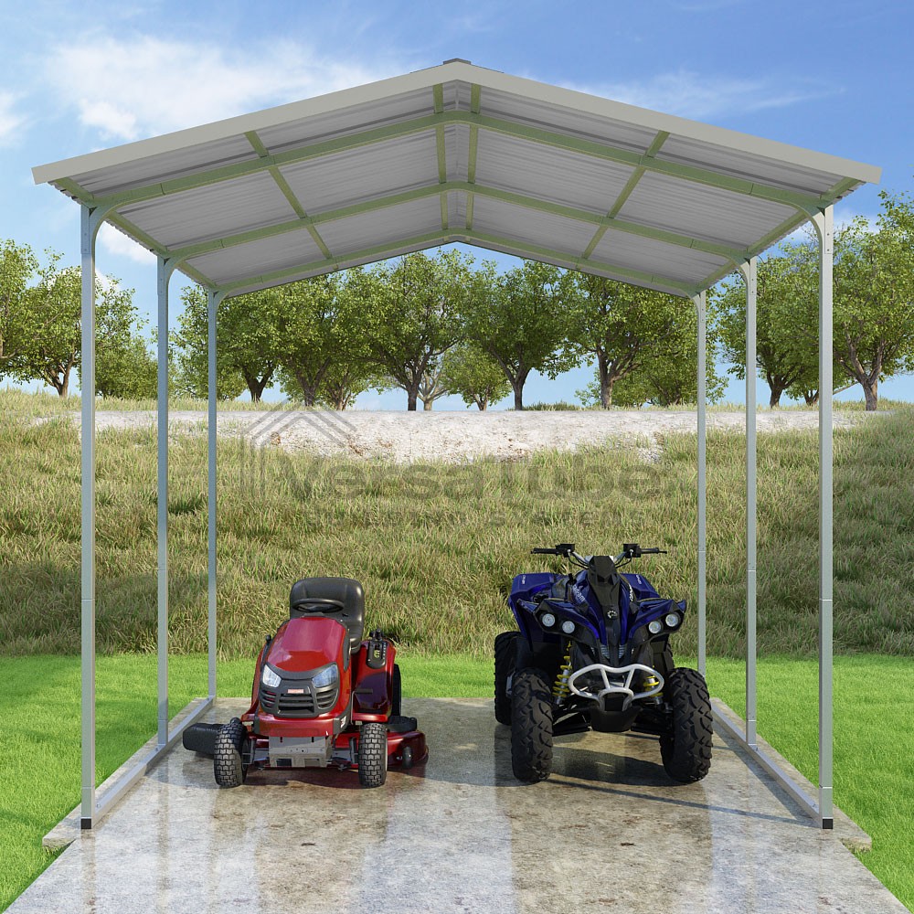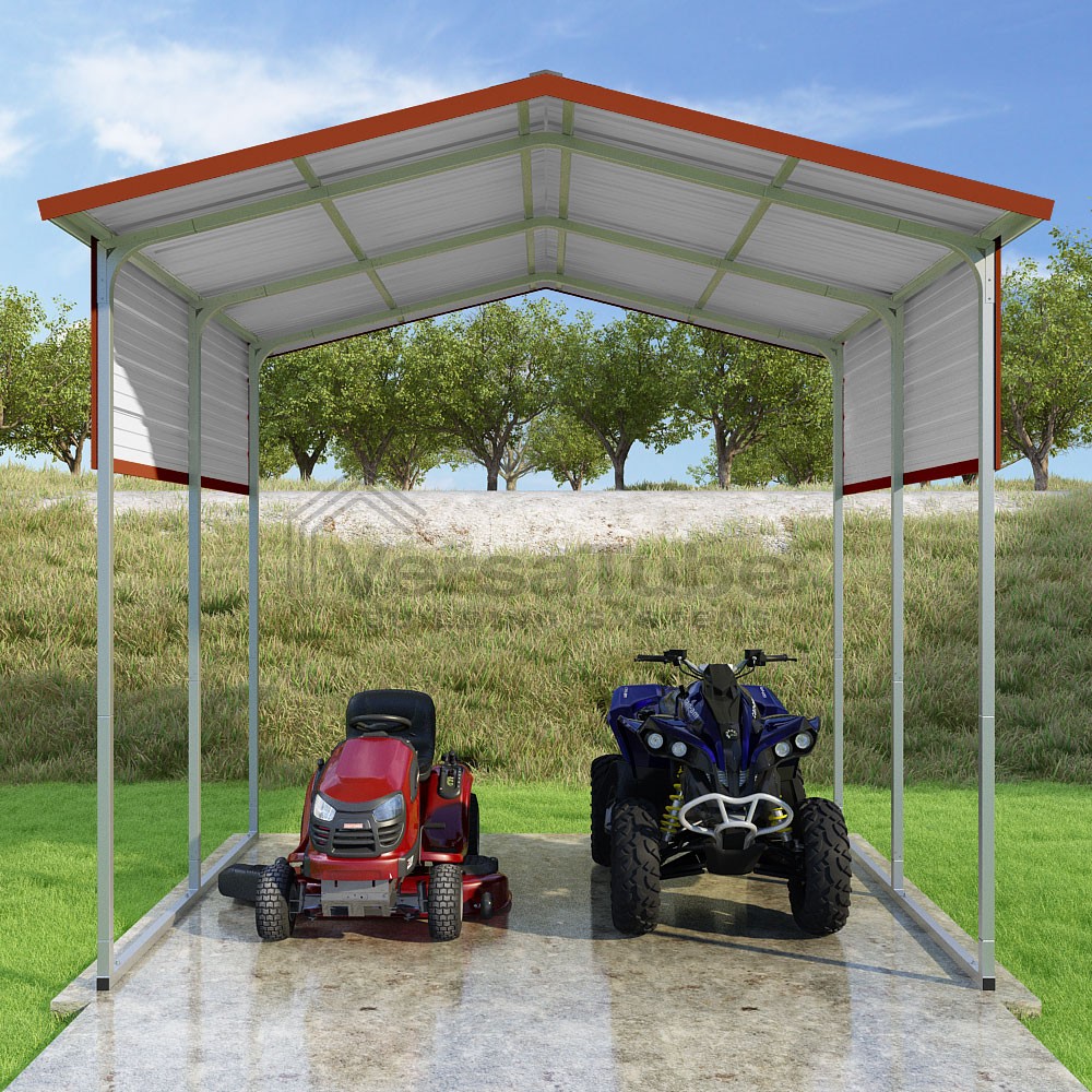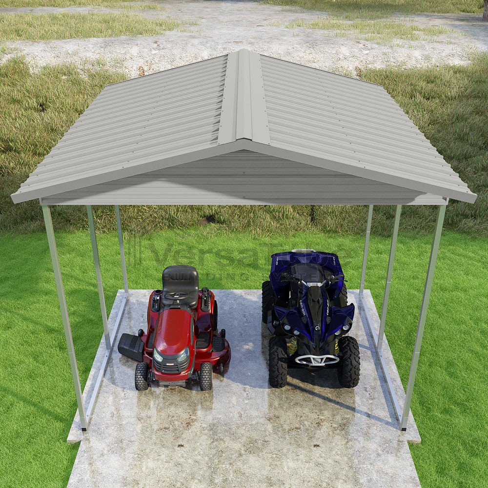 Pinnacle Series DIY carport kit features vertical sheet metal roof panels with ridge cap, gable and eave trim for an A-frame roof style and extended coverage on both ends.
