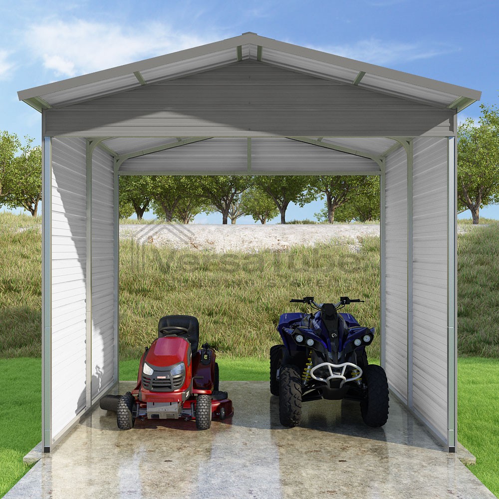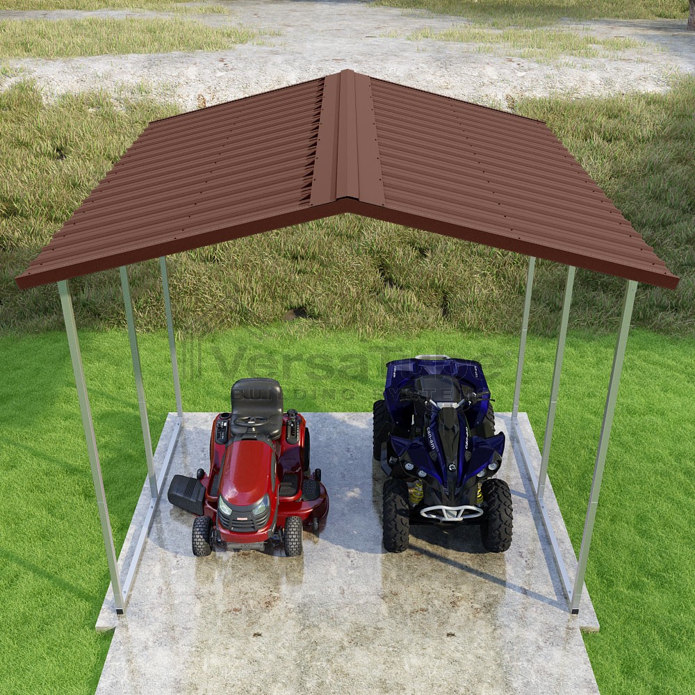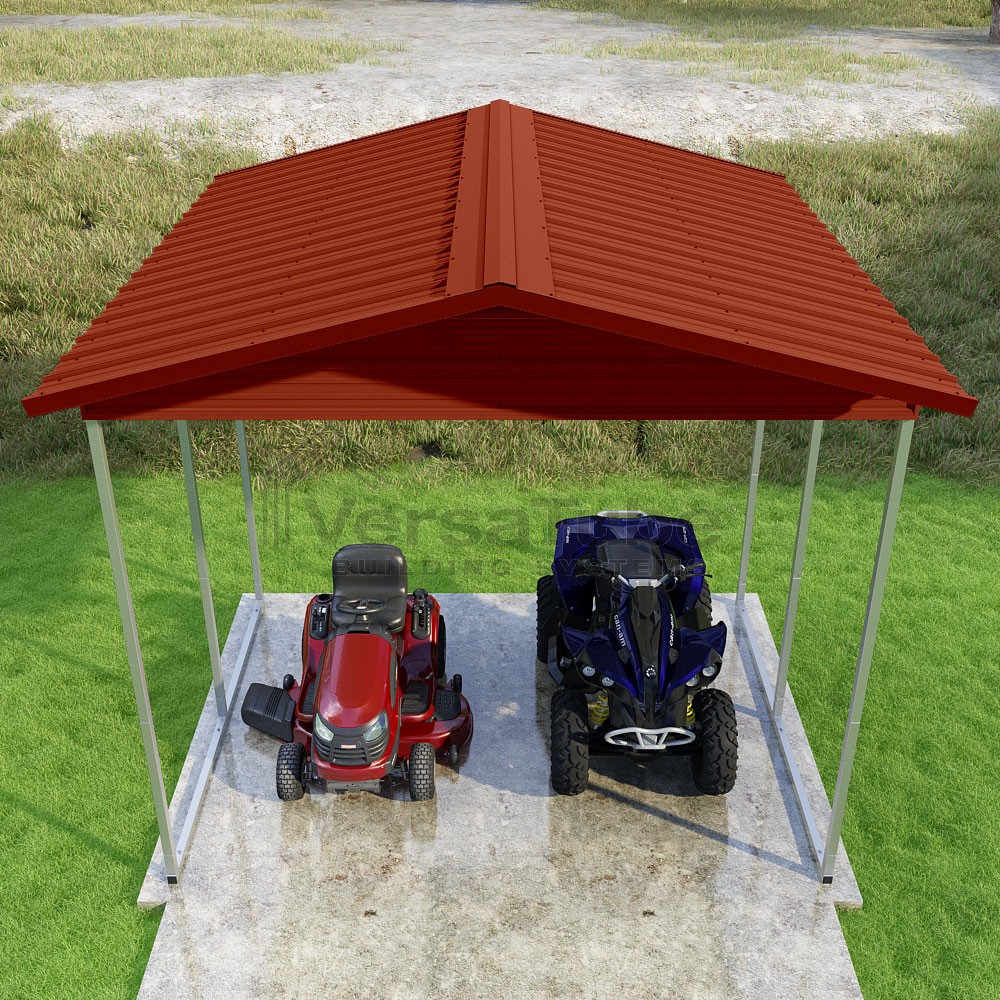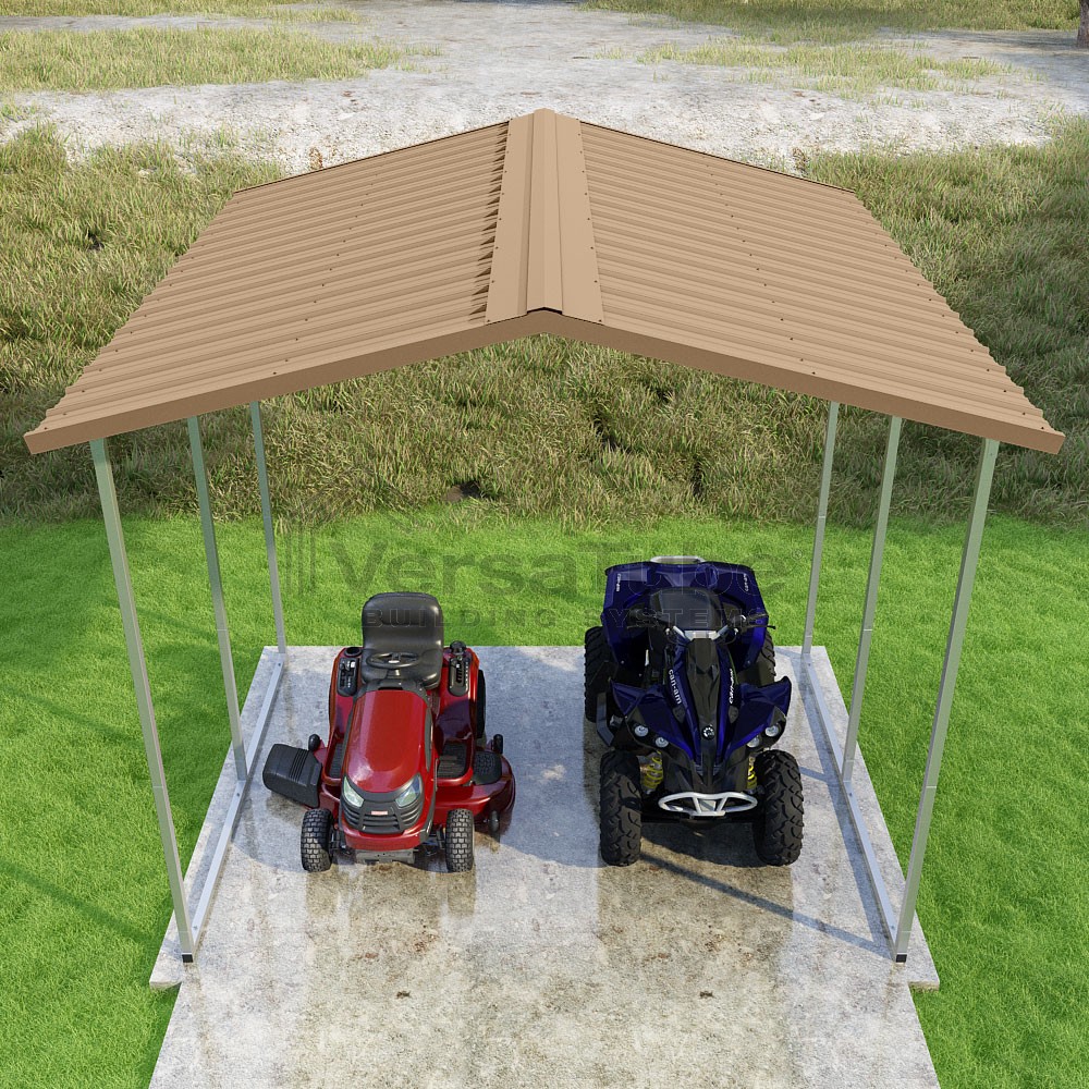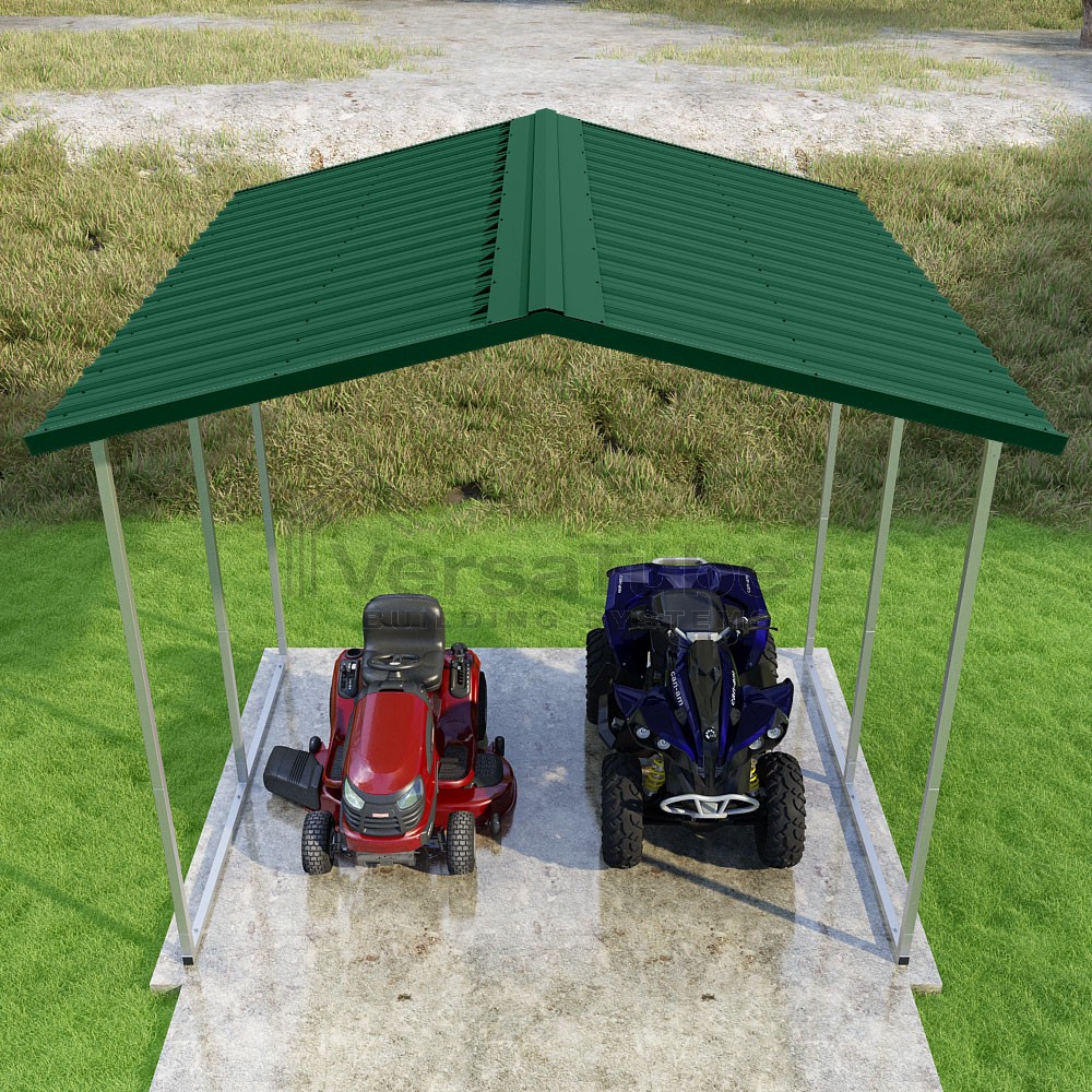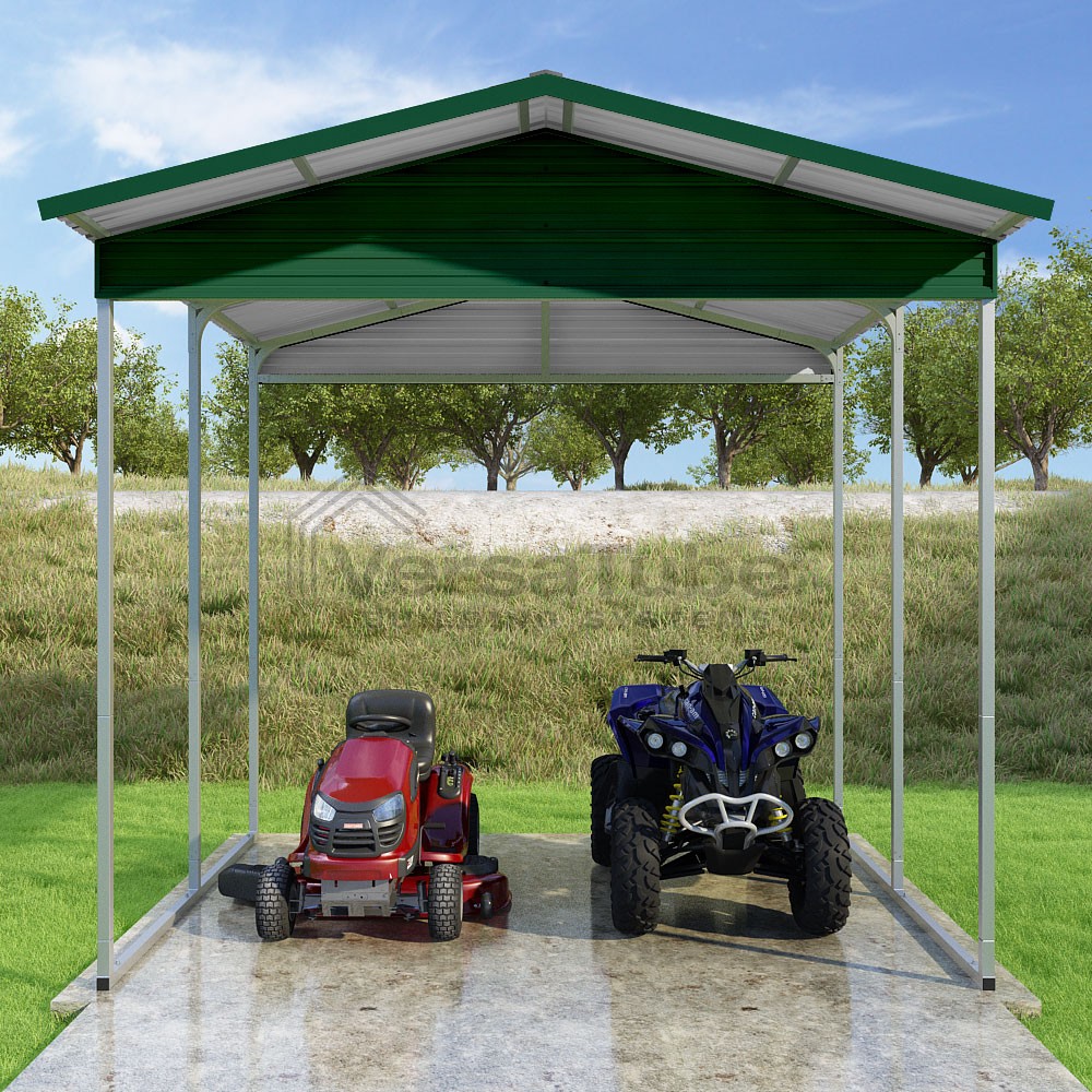 Pinnacle Series DIY carport kit features vertical sheet metal roof panels with ridge cap, gable and eave trim for an A-frame roof style and extended coverage on both ends.