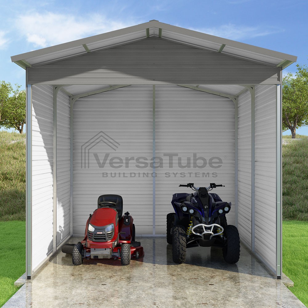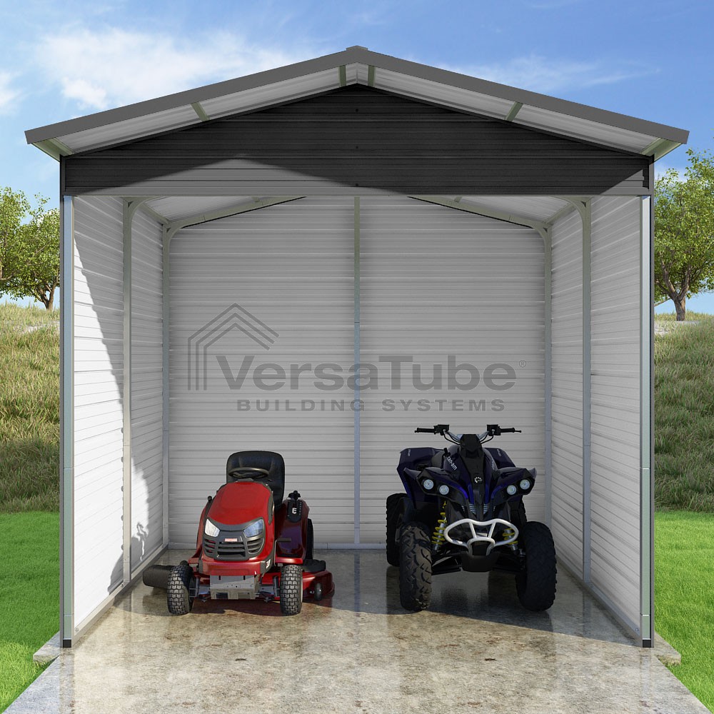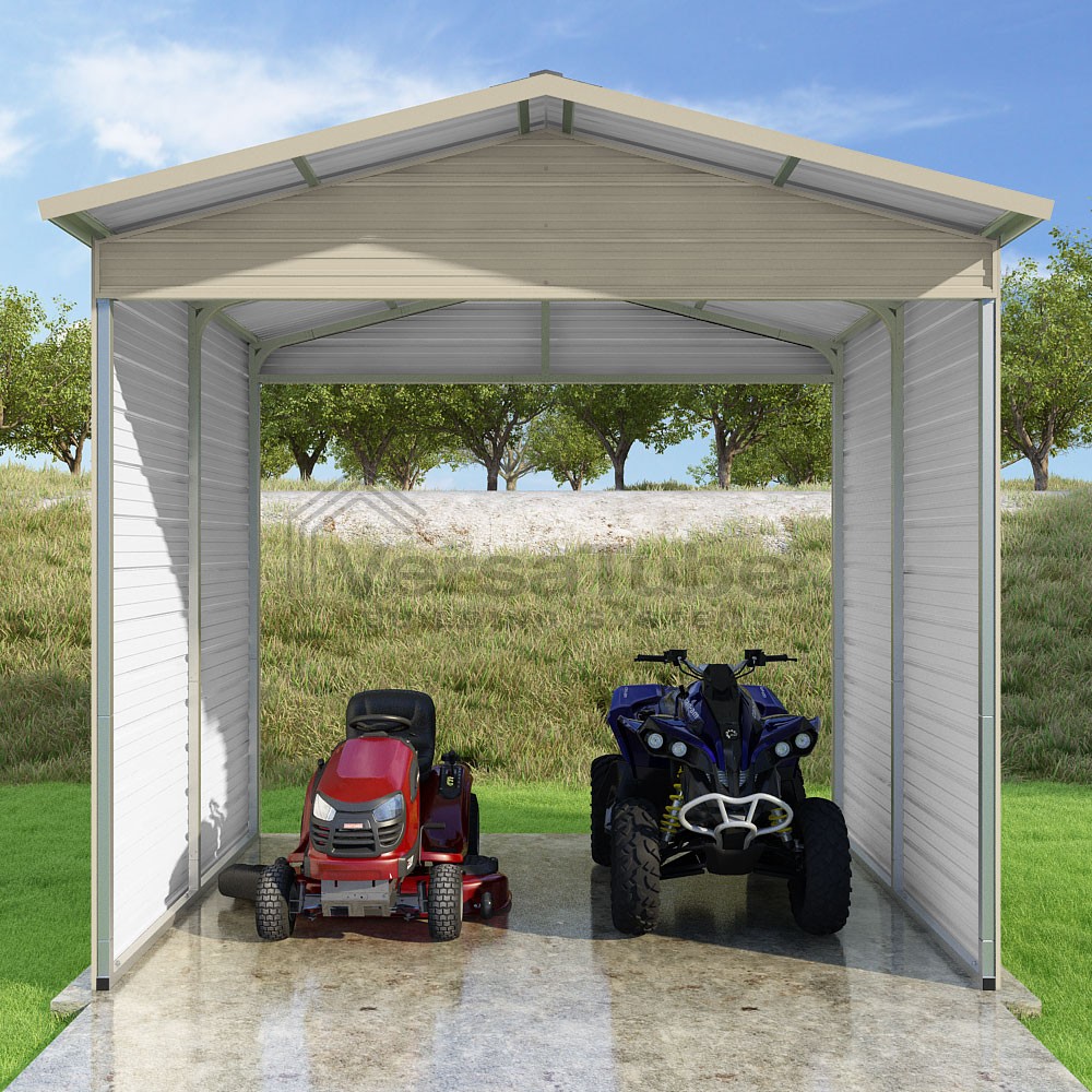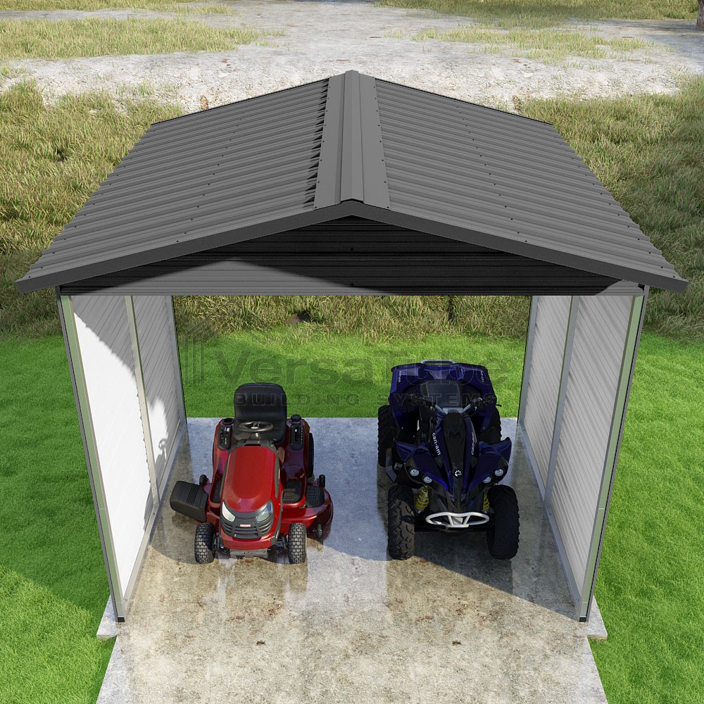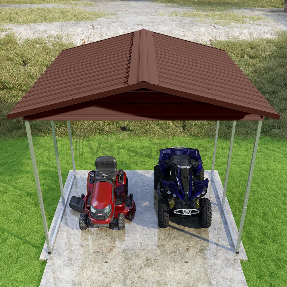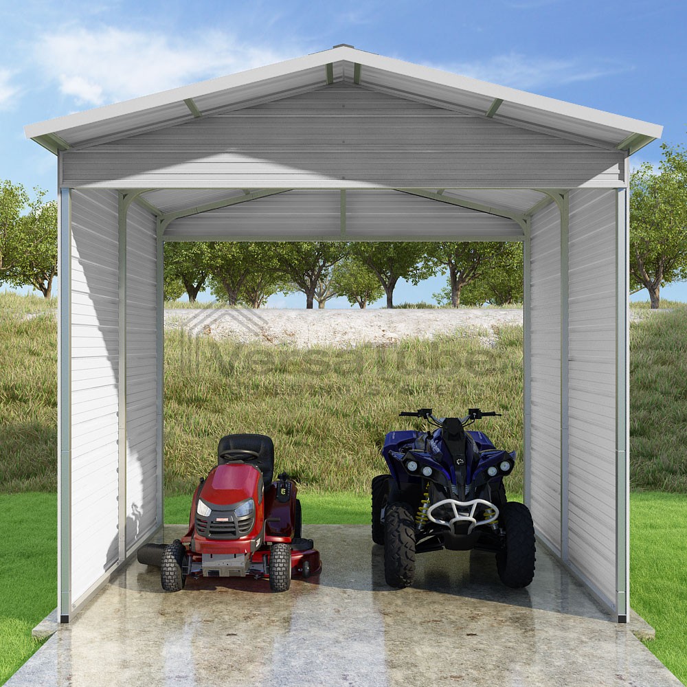 Pinnacle Series DIY carport kit features vertical sheet metal roof panels with ridge cap, gable and eave trim for an A-frame roof style and extended coverage on both ends.