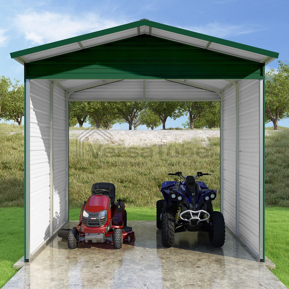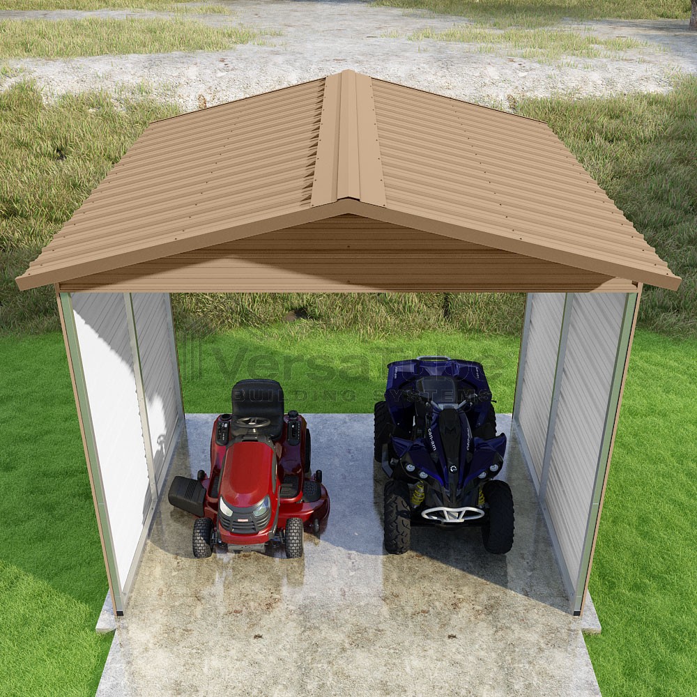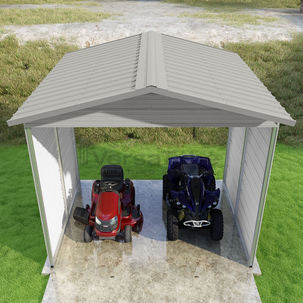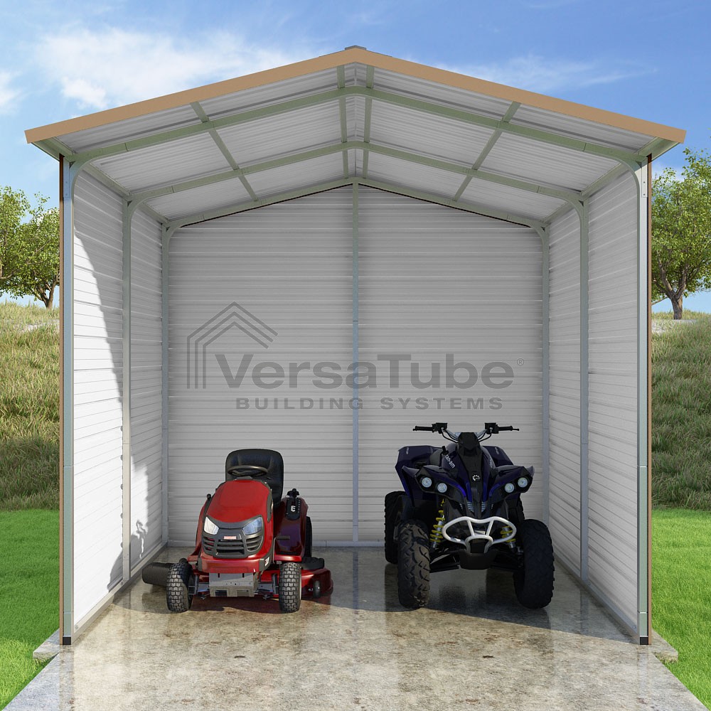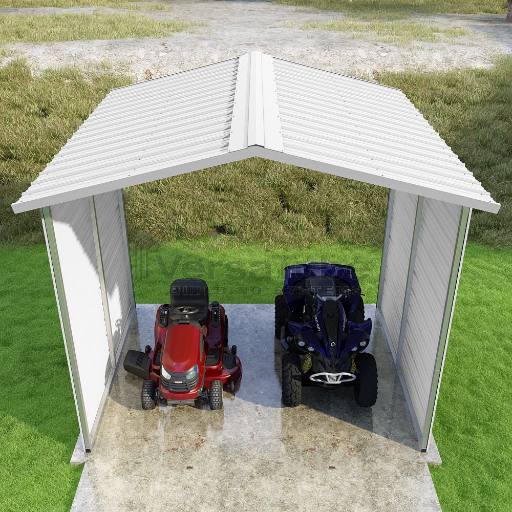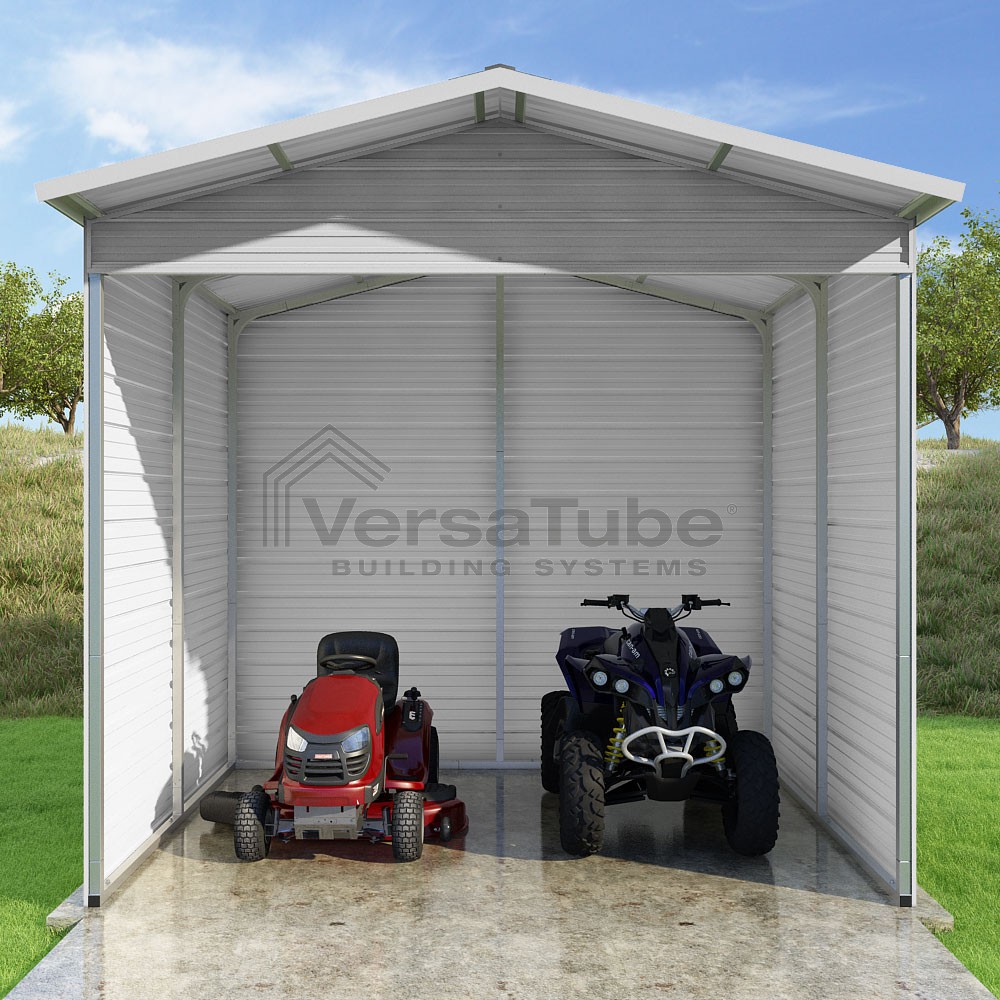 Pinnacle Series DIY carport kit features vertical sheet metal roof panels with ridge cap, gable and eave trim for an A-frame roof style and extended coverage on both ends.