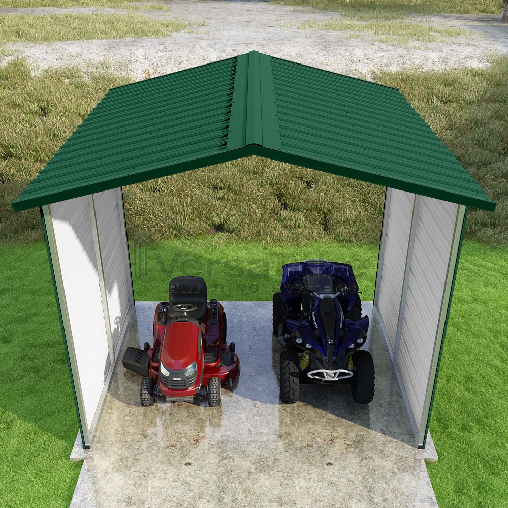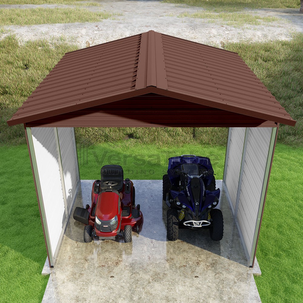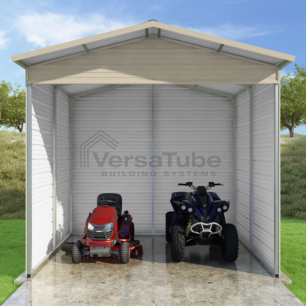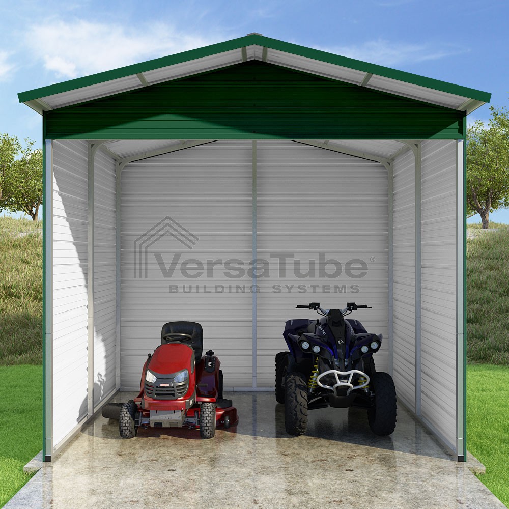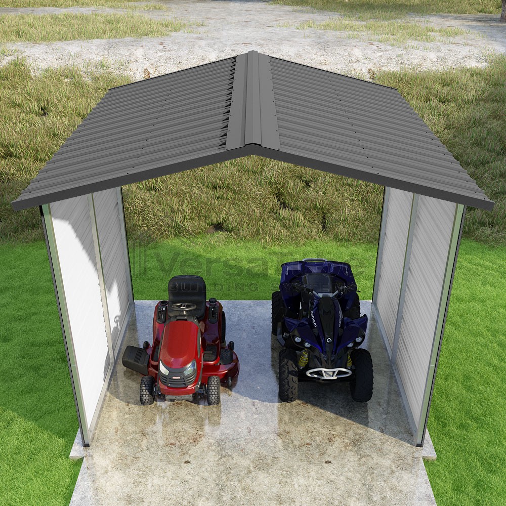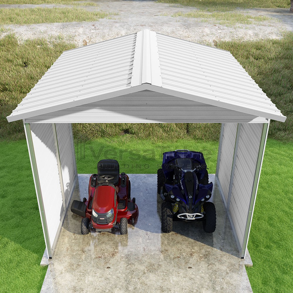 Pinnacle Series DIY carport kit features vertical sheet metal roof panels with ridge cap, gable and eave trim for an A-frame roof style and extended coverage on both ends.