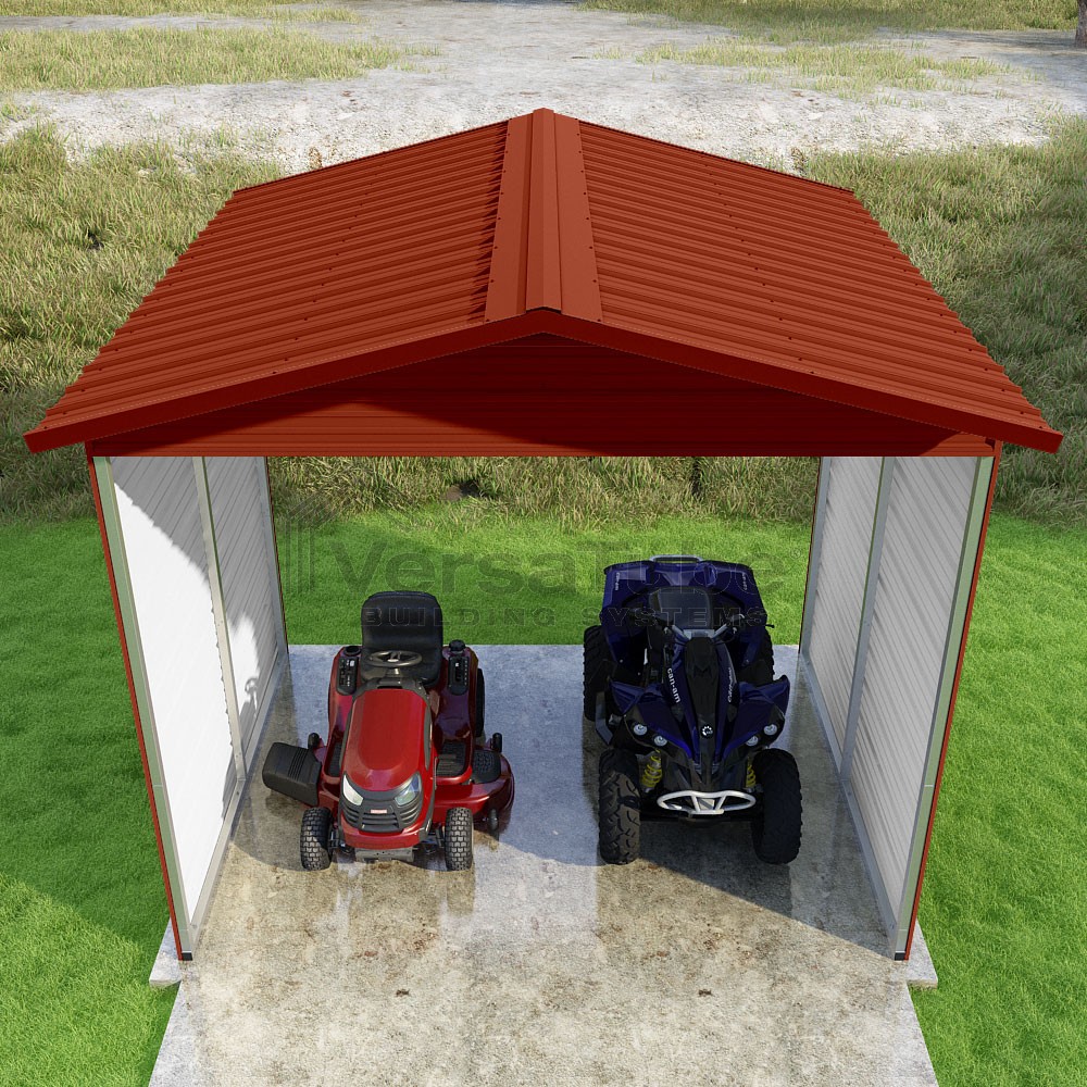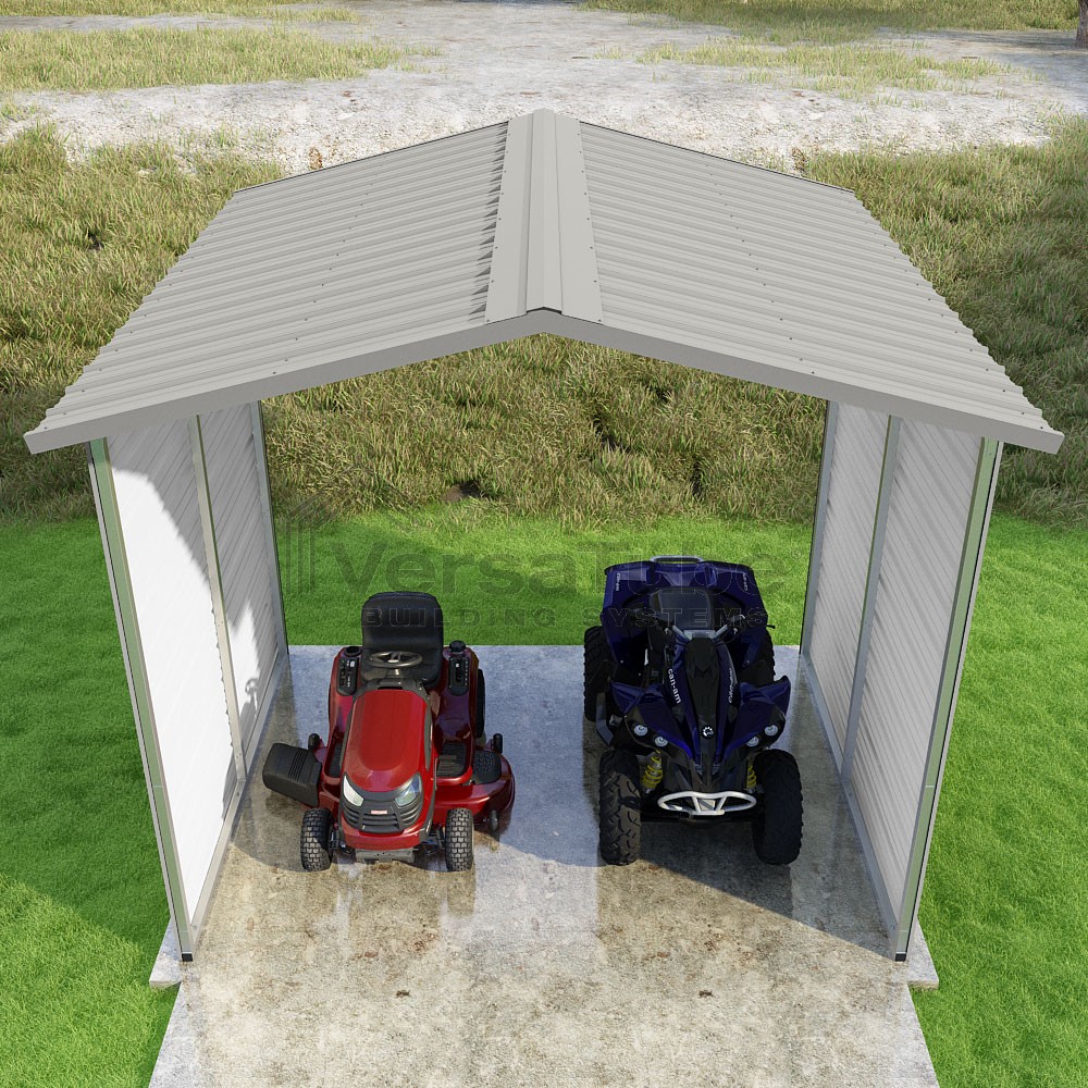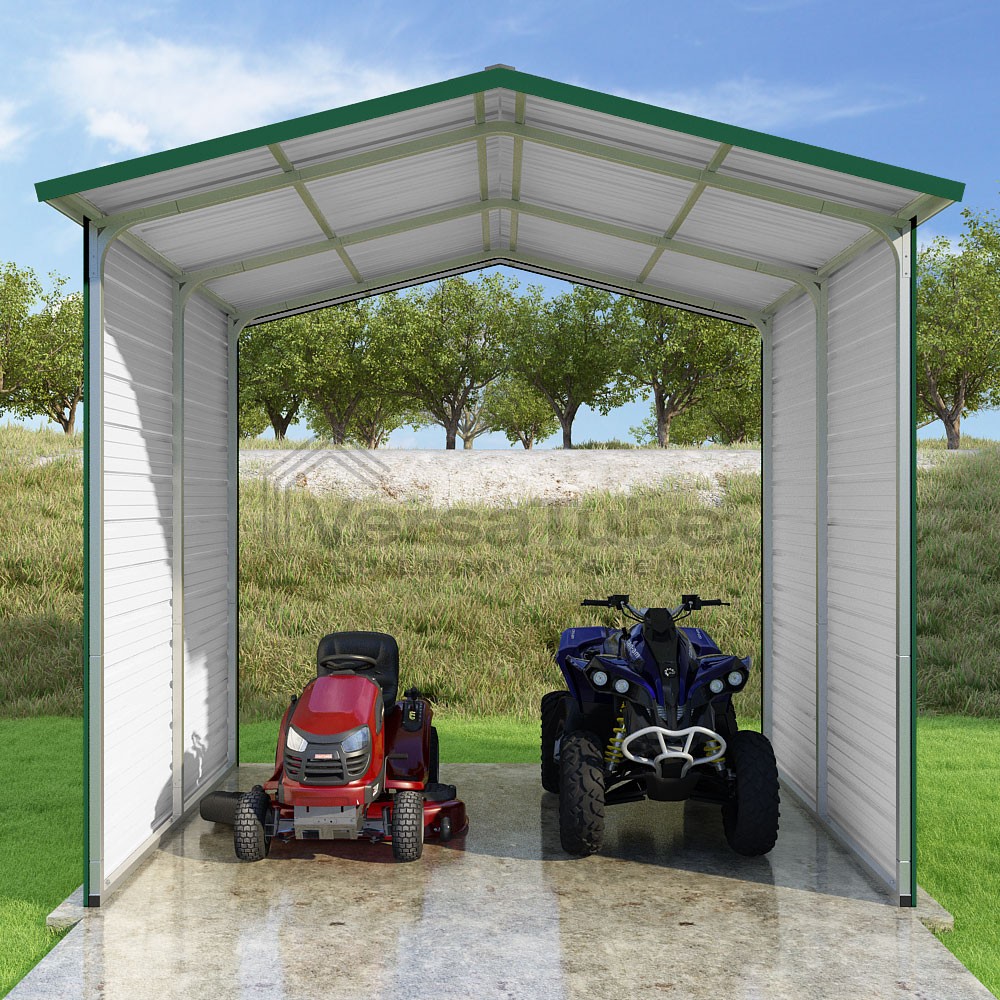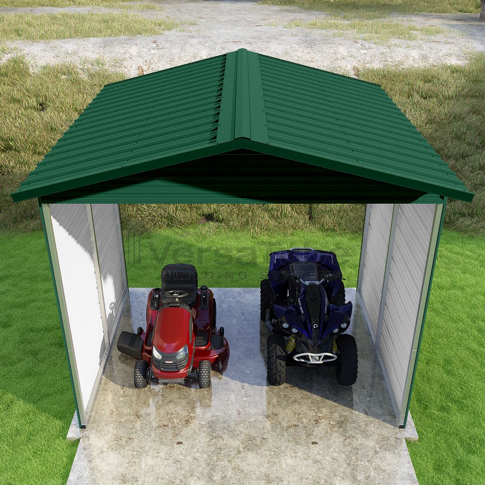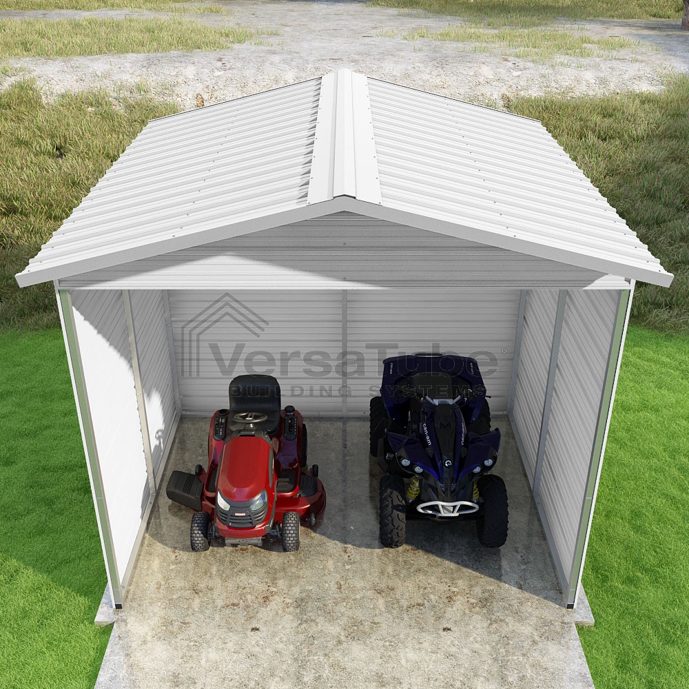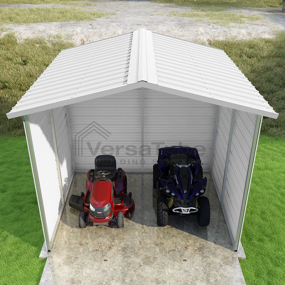 Pinnacle Series DIY carport kit features vertical sheet metal roof panels with ridge cap, gable and eave trim for an A-frame roof style and extended coverage on both ends.