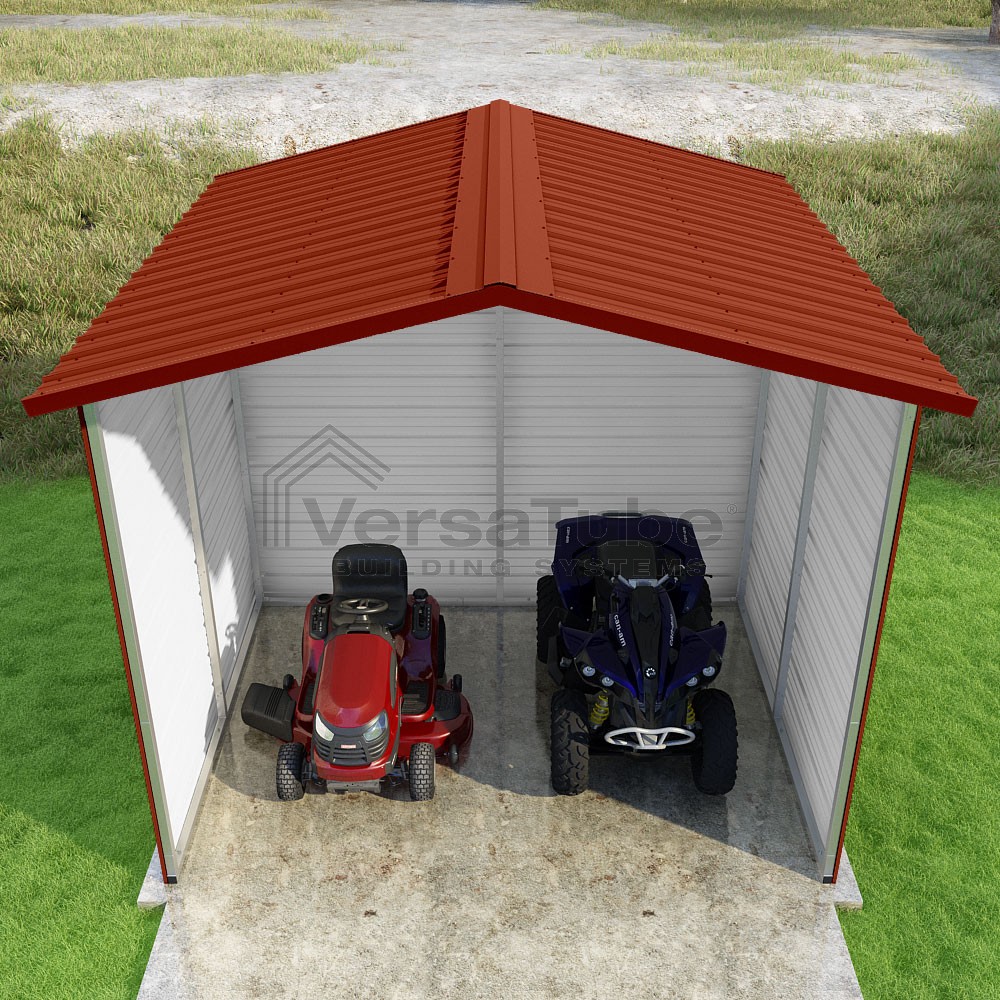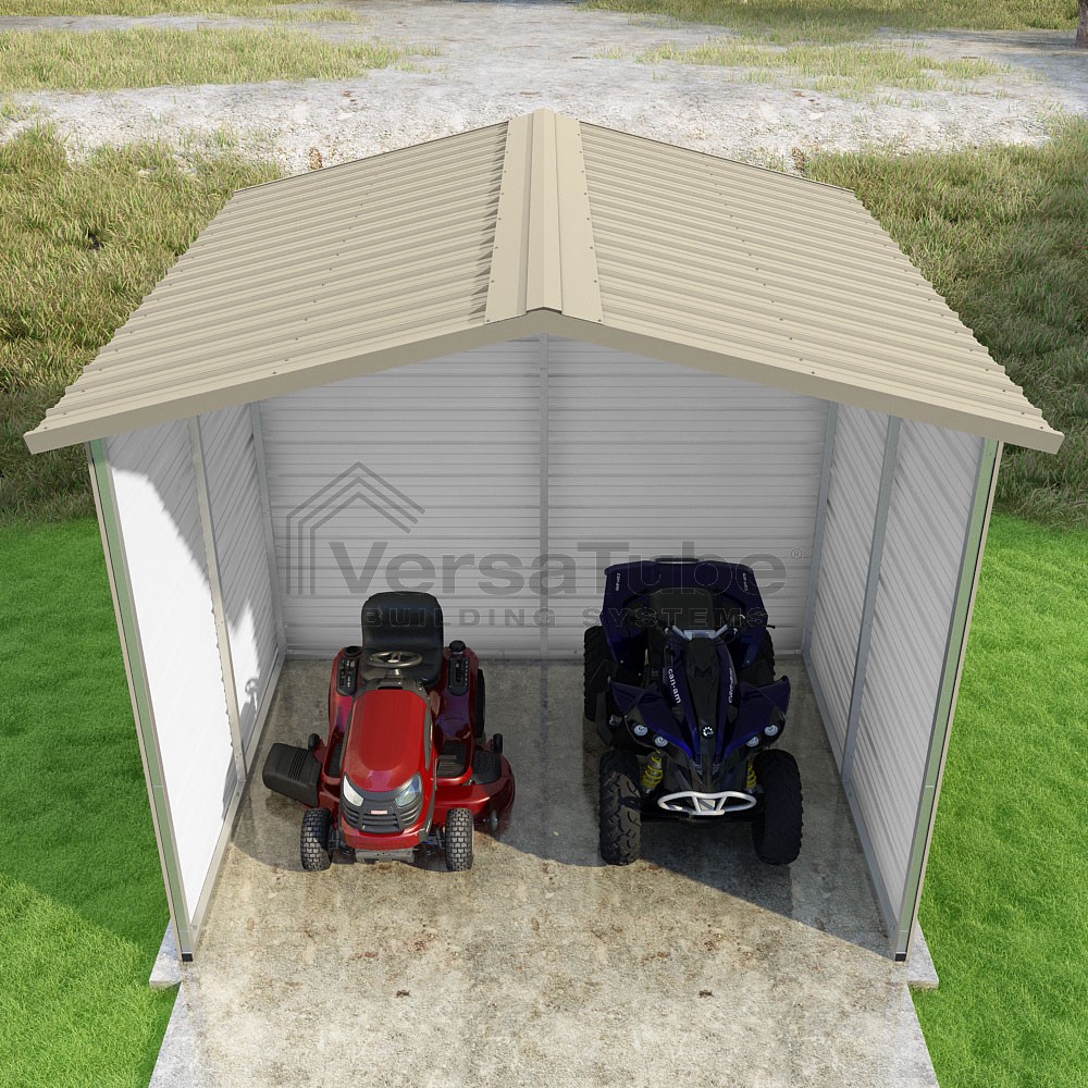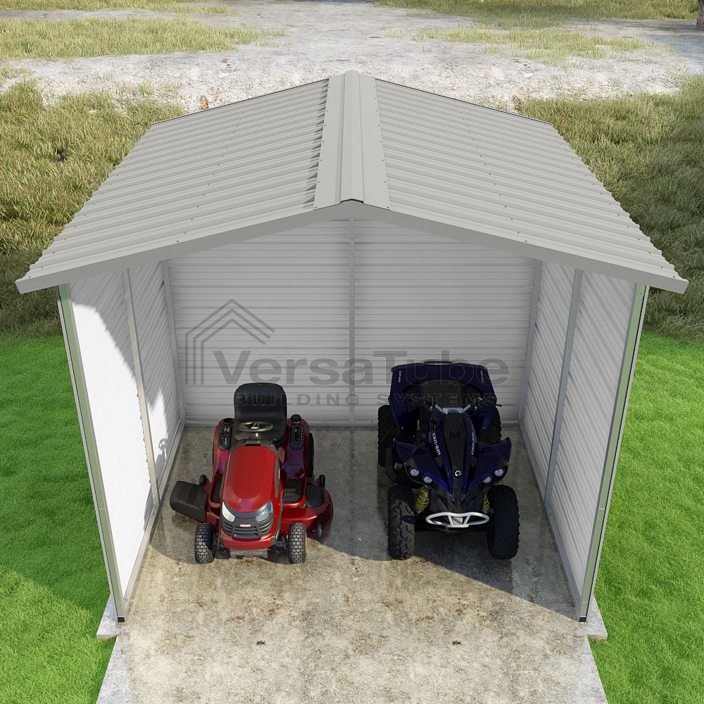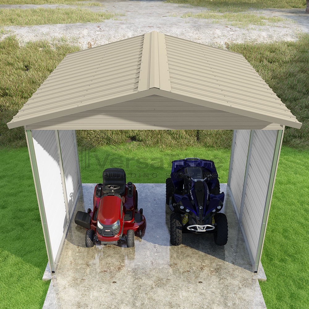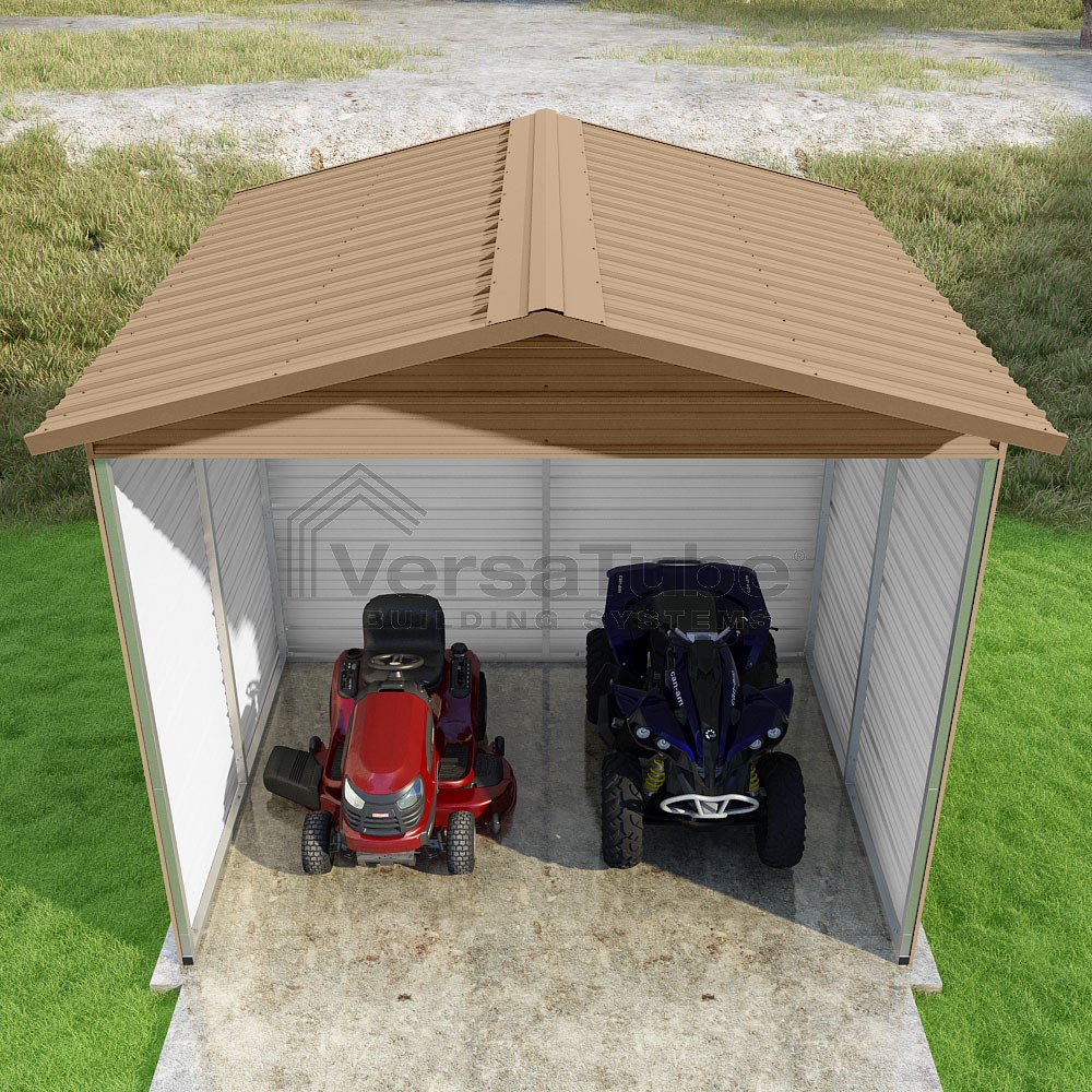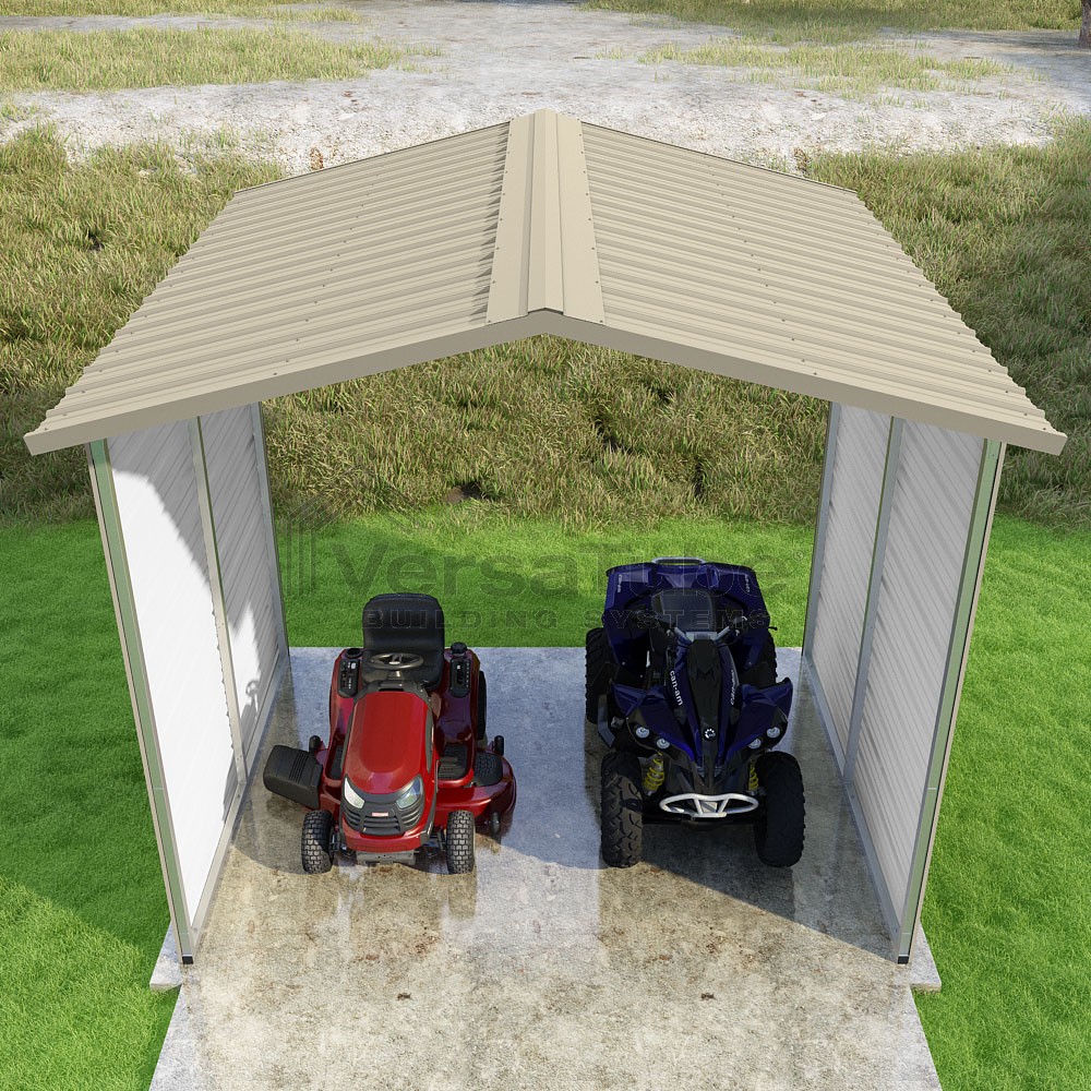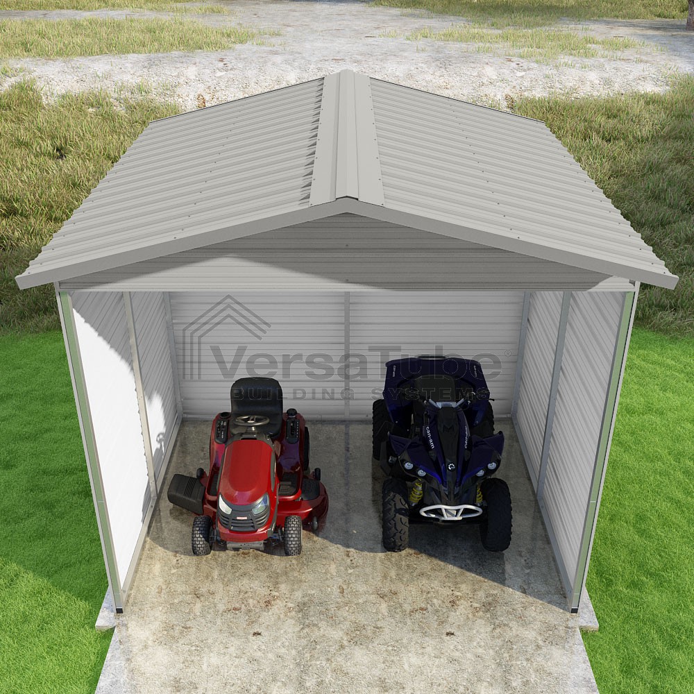 Pinnacle Series DIY carport kit features vertical sheet metal roof panels with ridge cap, gable and eave trim for an A-frame roof style and extended coverage on both ends.