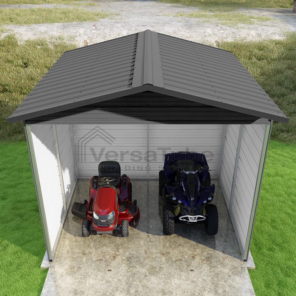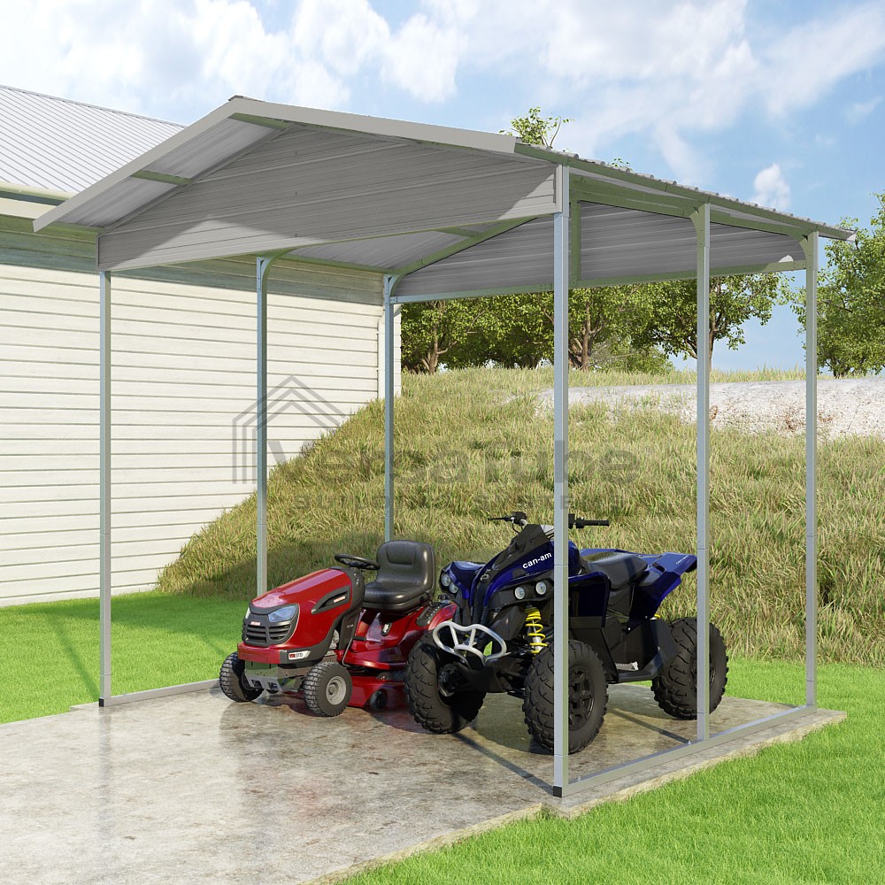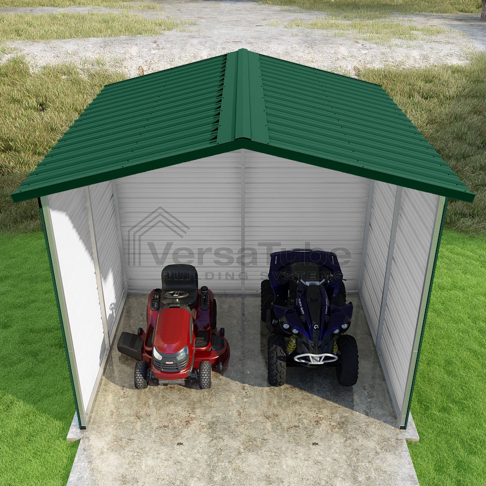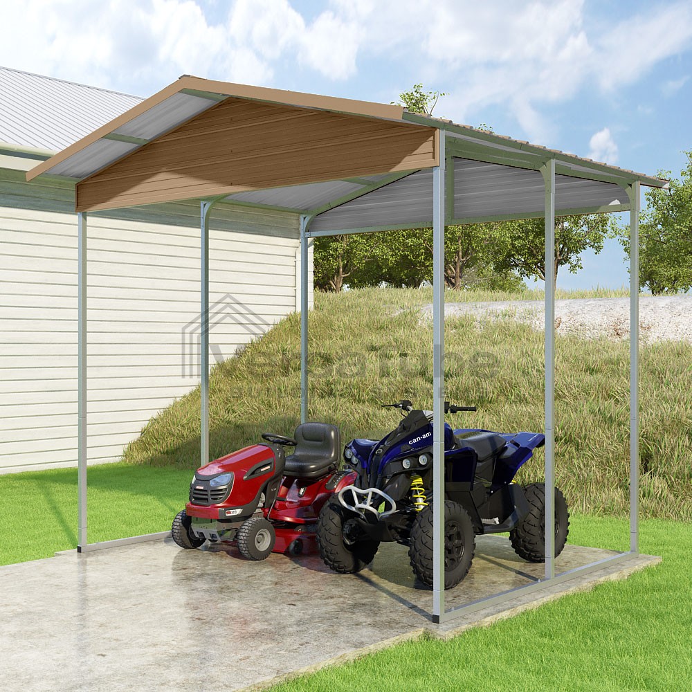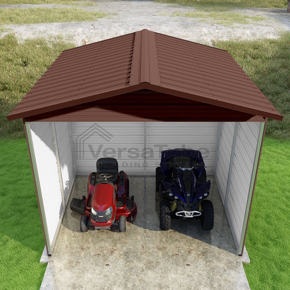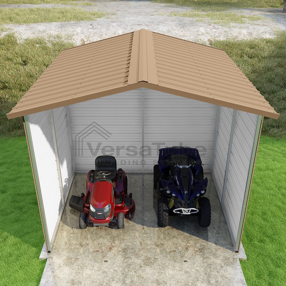 Pinnacle Series DIY carport kit features vertical sheet metal roof panels with ridge cap, gable and eave trim for an A-frame roof style and extended coverage on both ends.