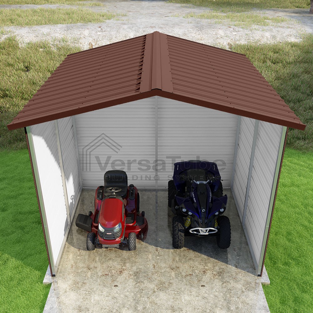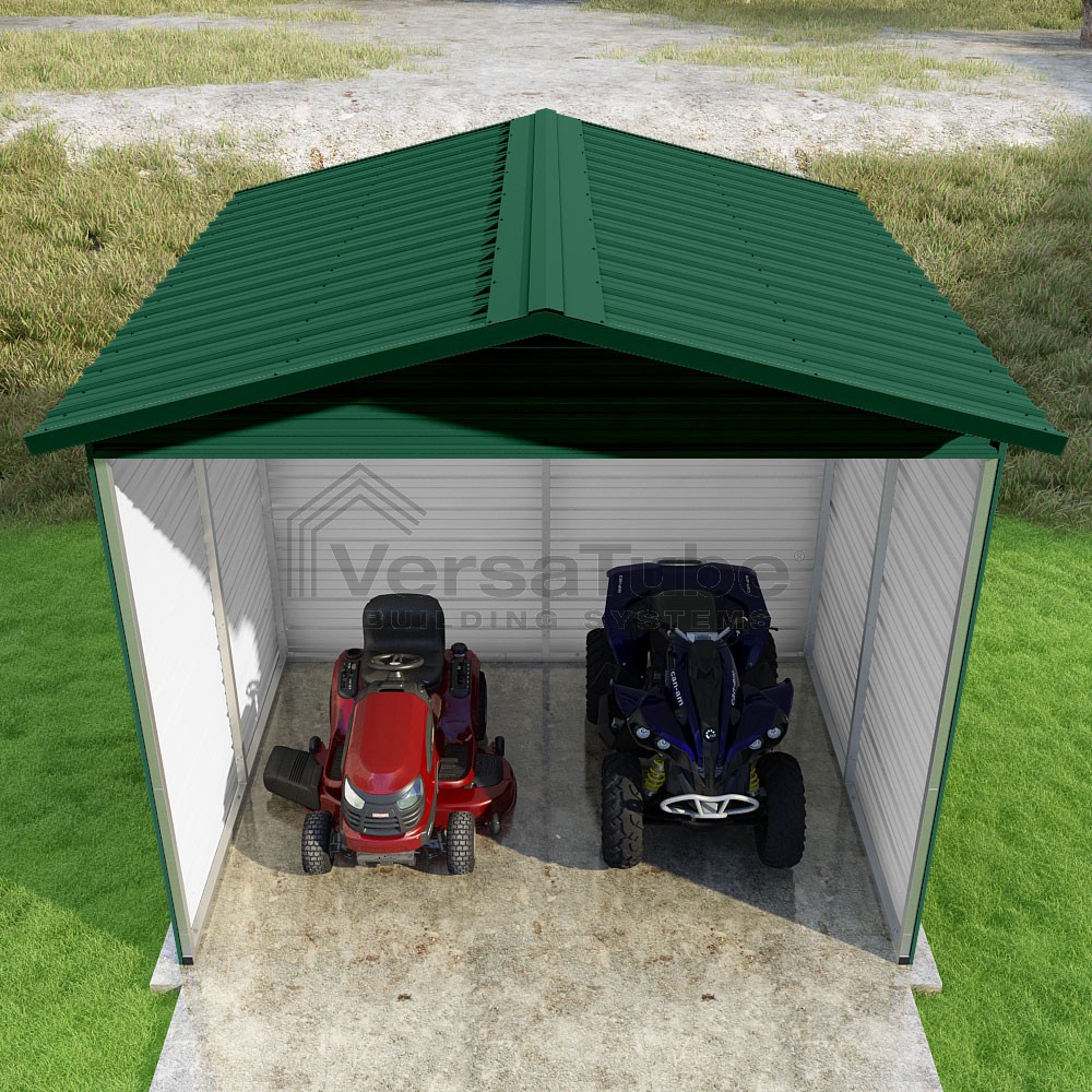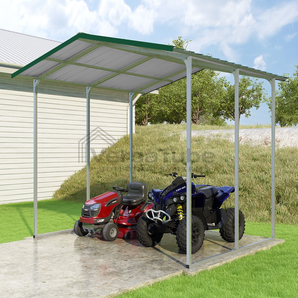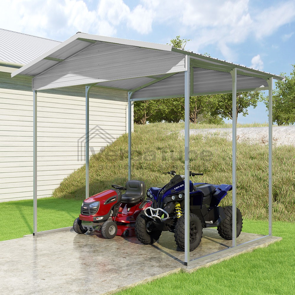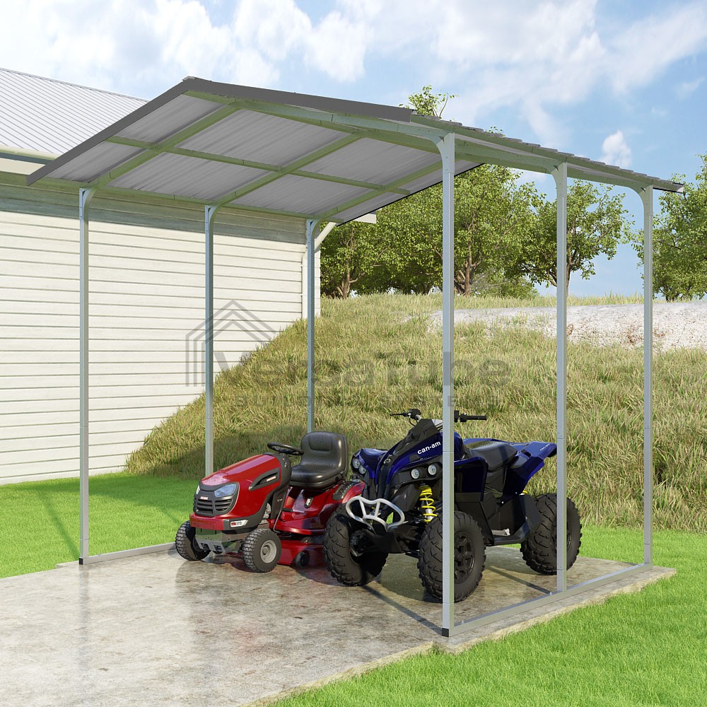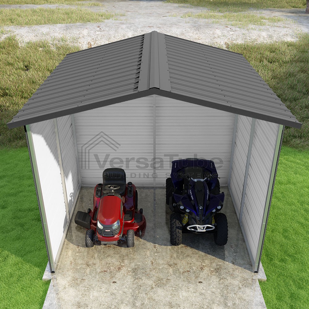 Pinnacle Series DIY carport kit features vertical sheet metal roof panels with ridge cap, gable and eave trim for an A-frame roof style and extended coverage on both ends.