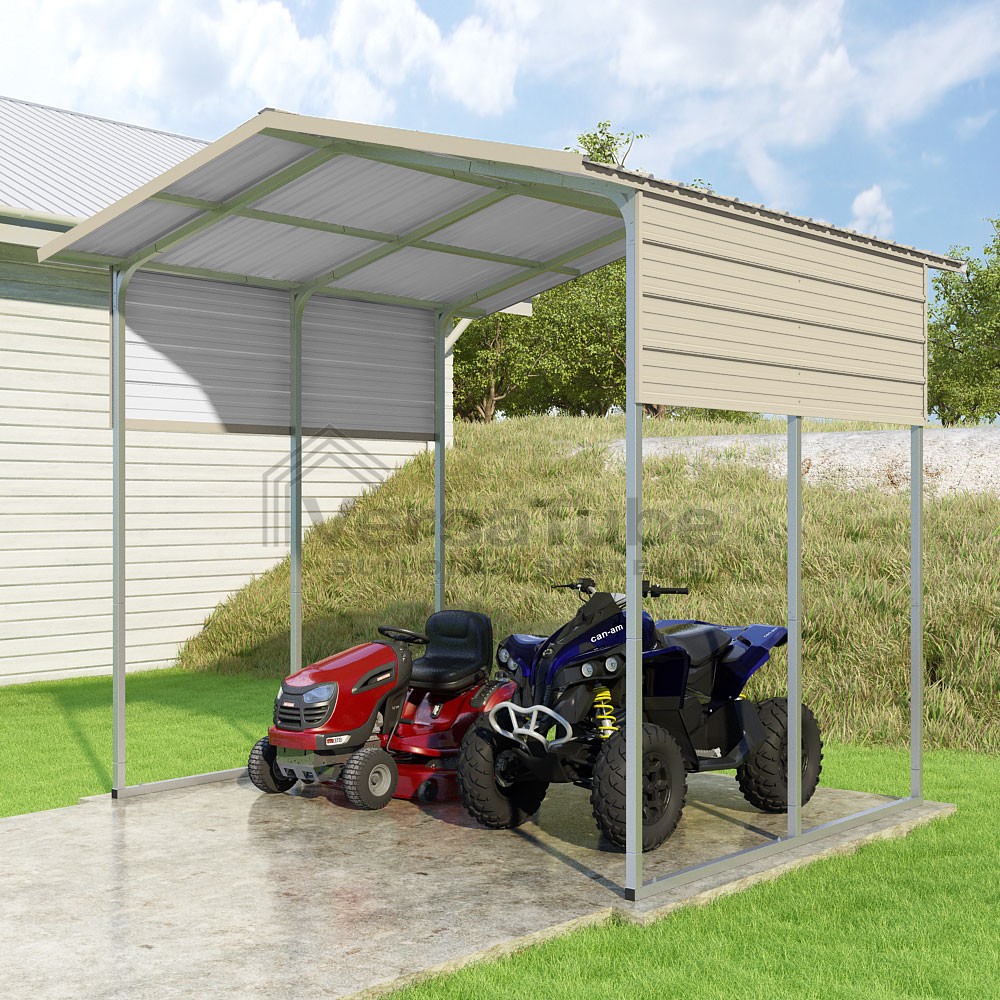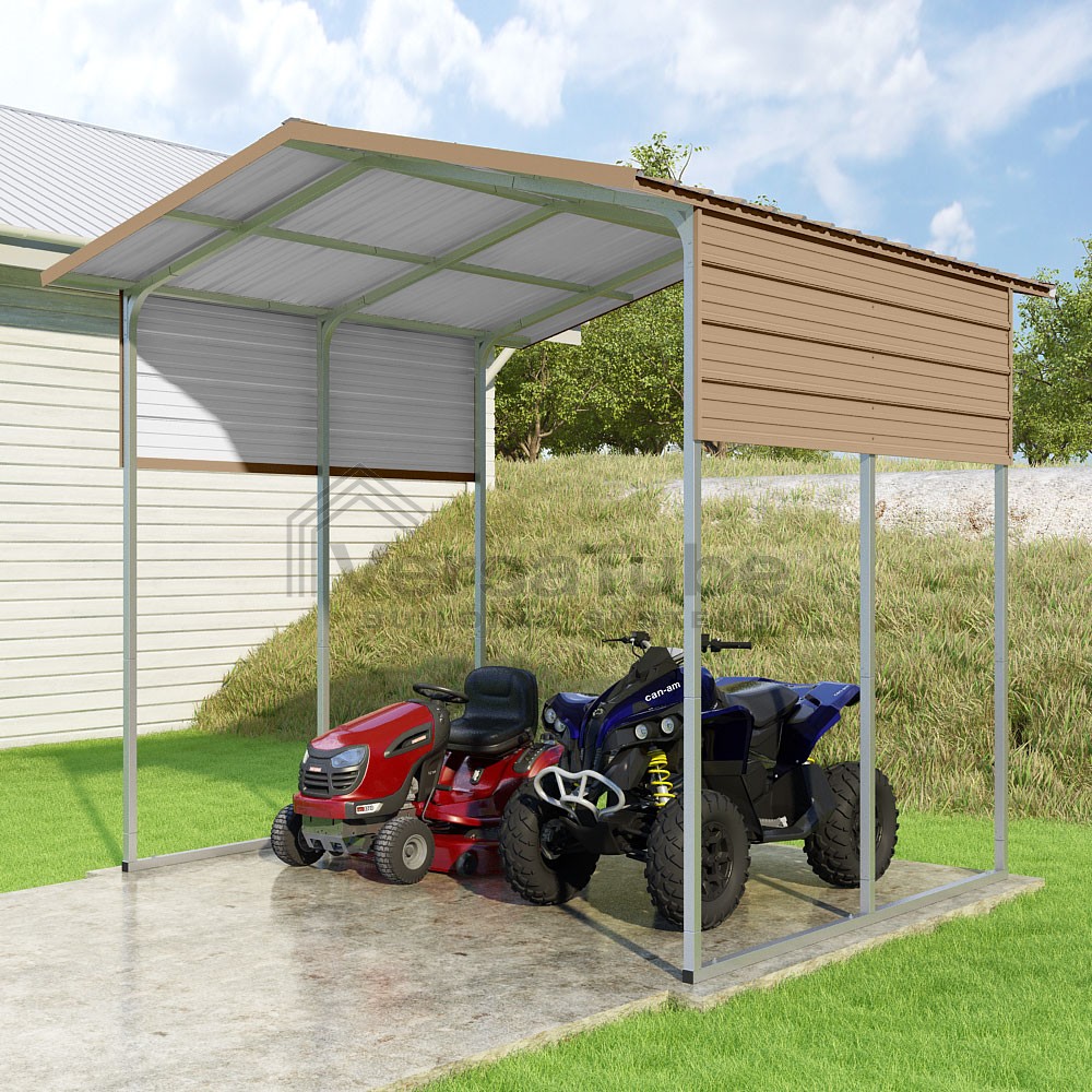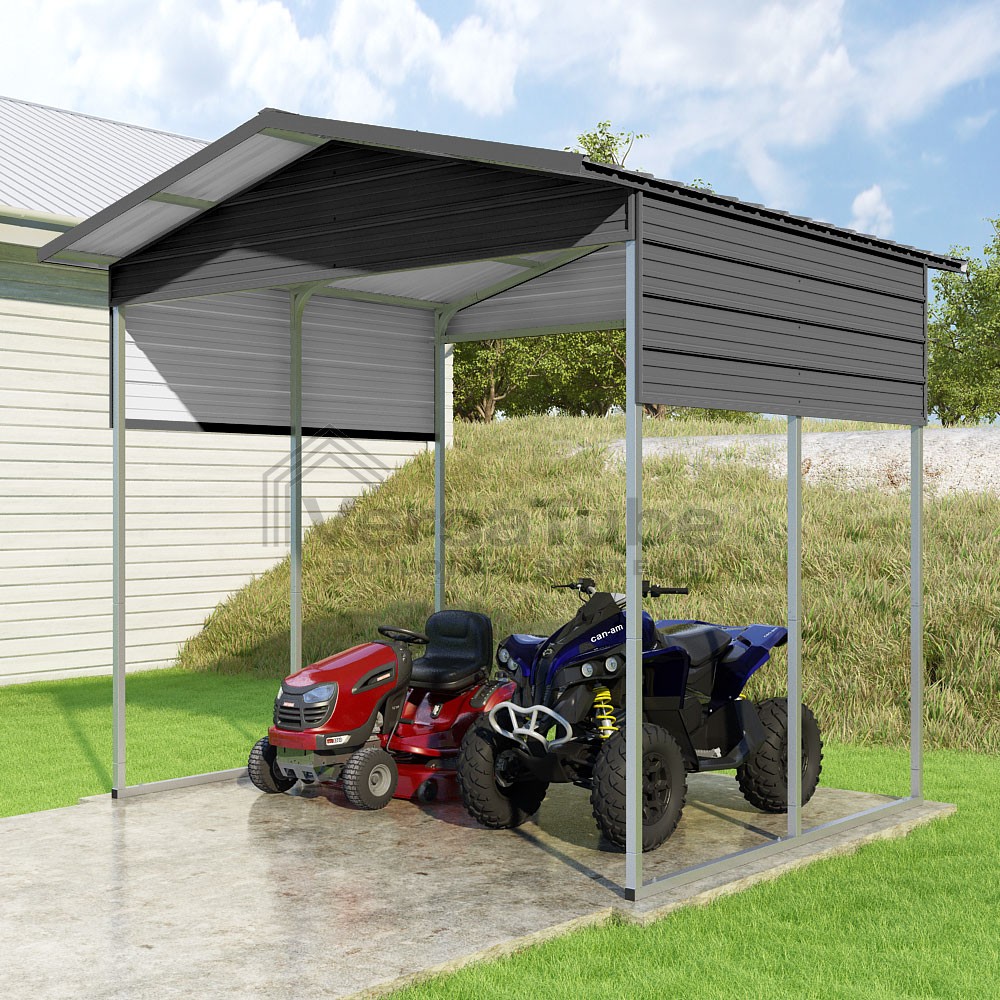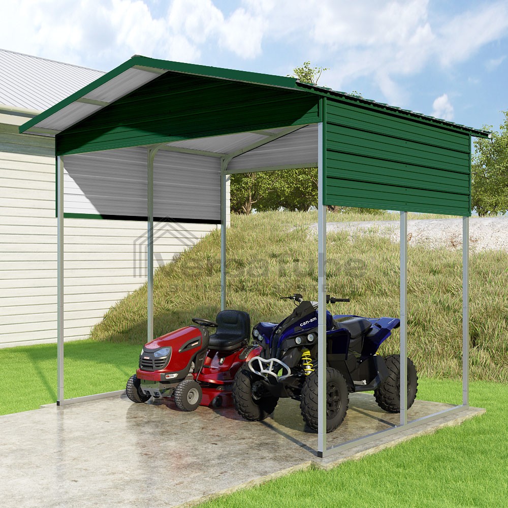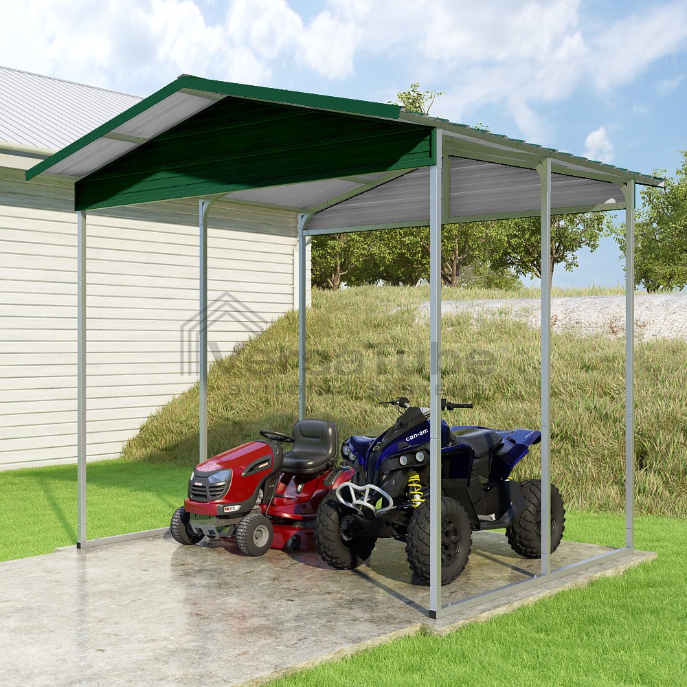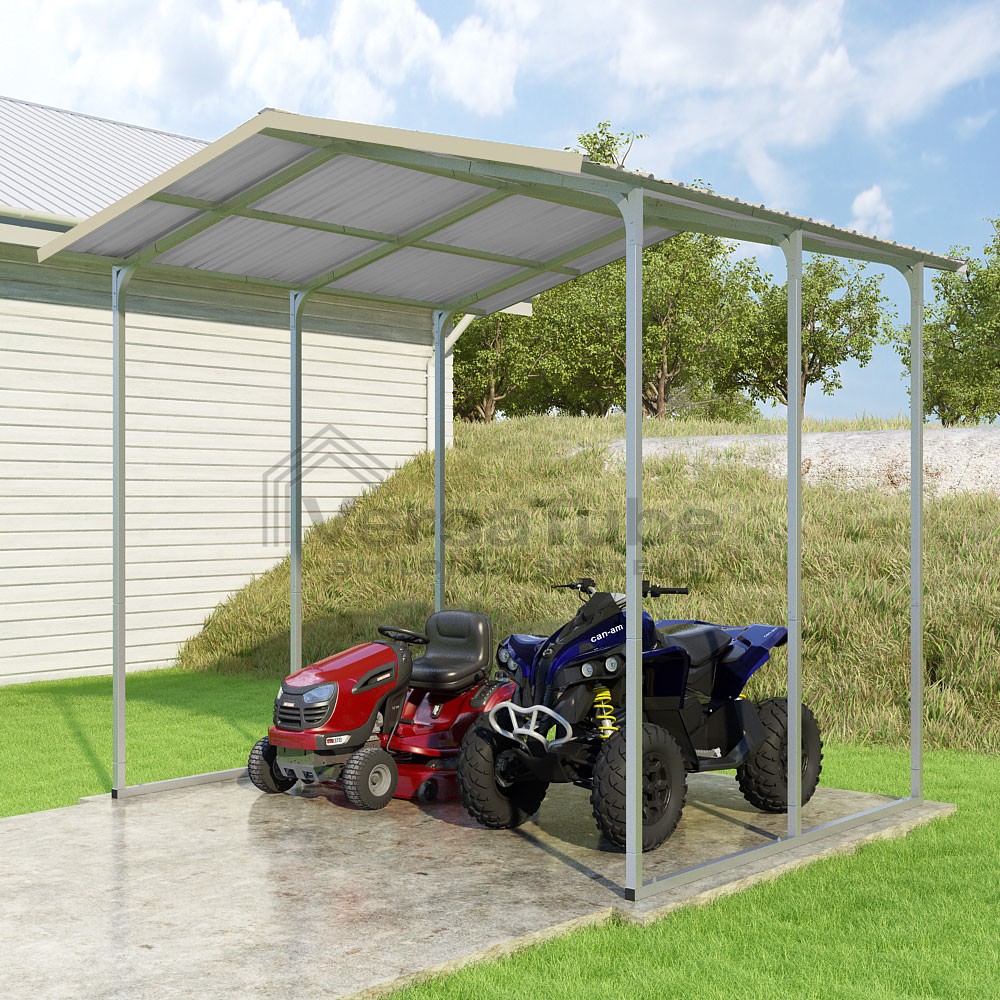 Pinnacle Series DIY carport kit features vertical sheet metal roof panels with ridge cap, gable and eave trim for an A-frame roof style and extended coverage on both ends.