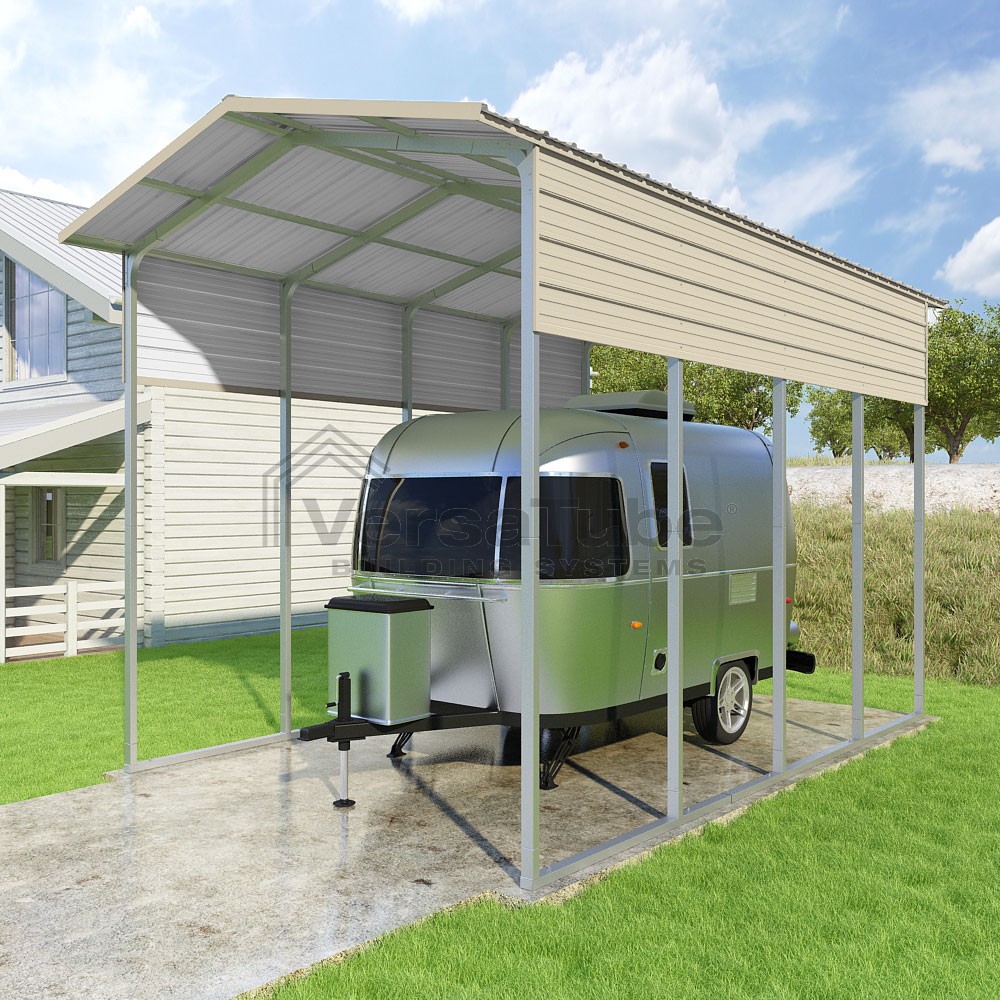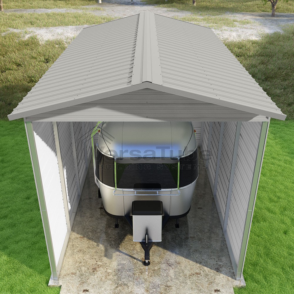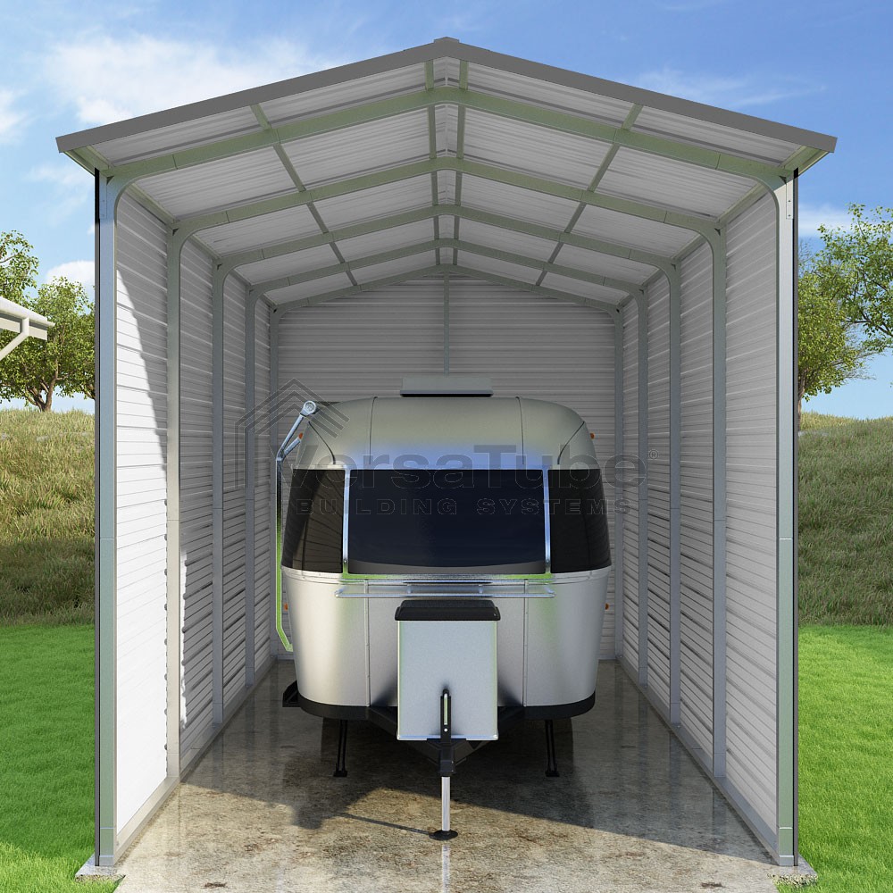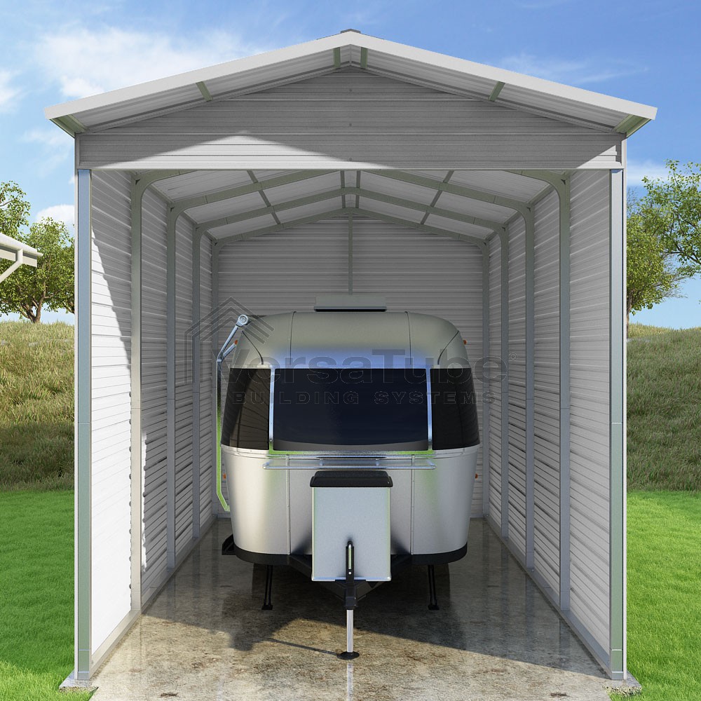 Pinnacle Series DIY carport kit features vertical sheet metal roof panels with ridge cap, gable and eave trim for an A-frame roof style and extended coverage on both ends.