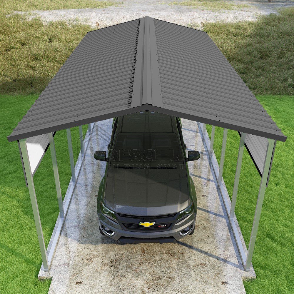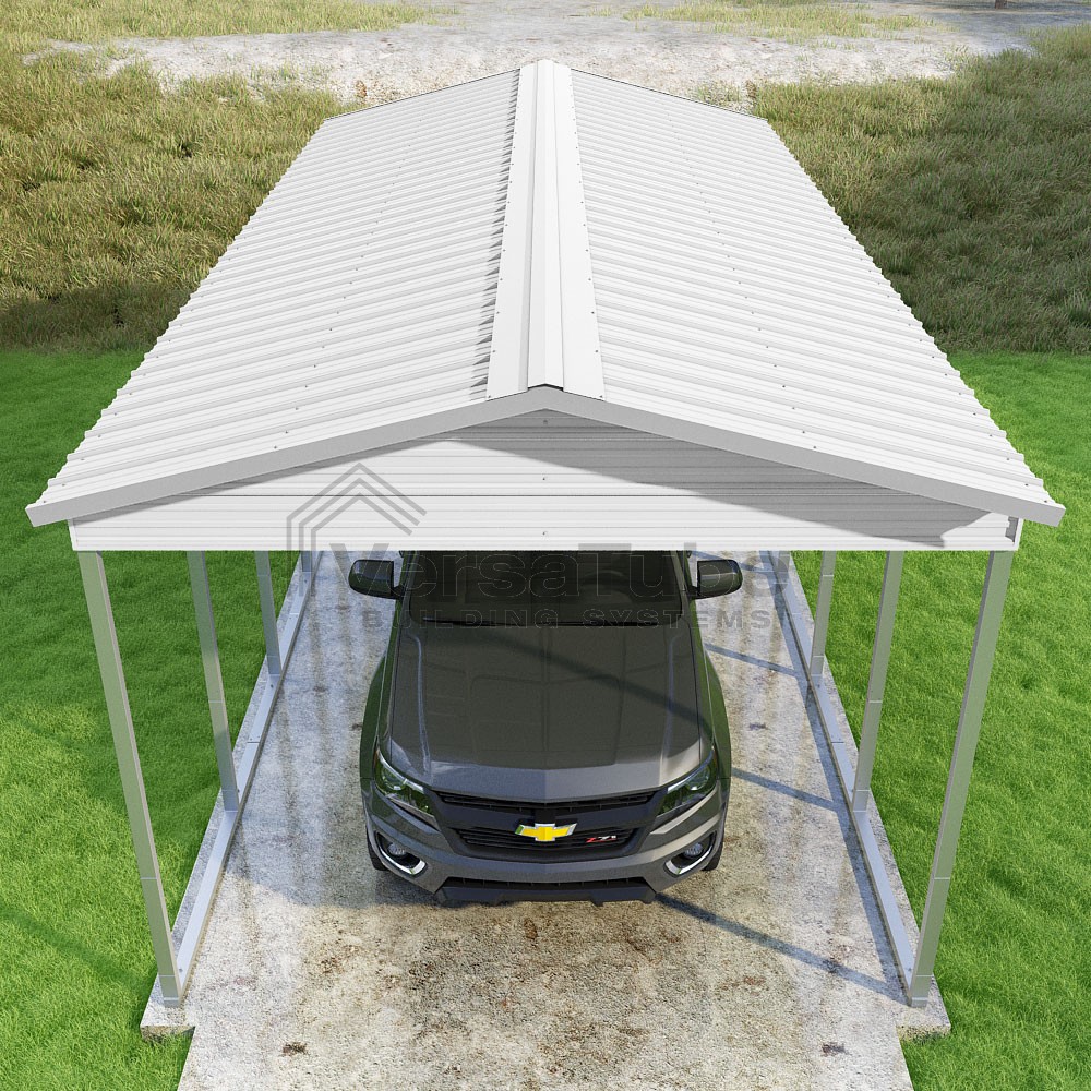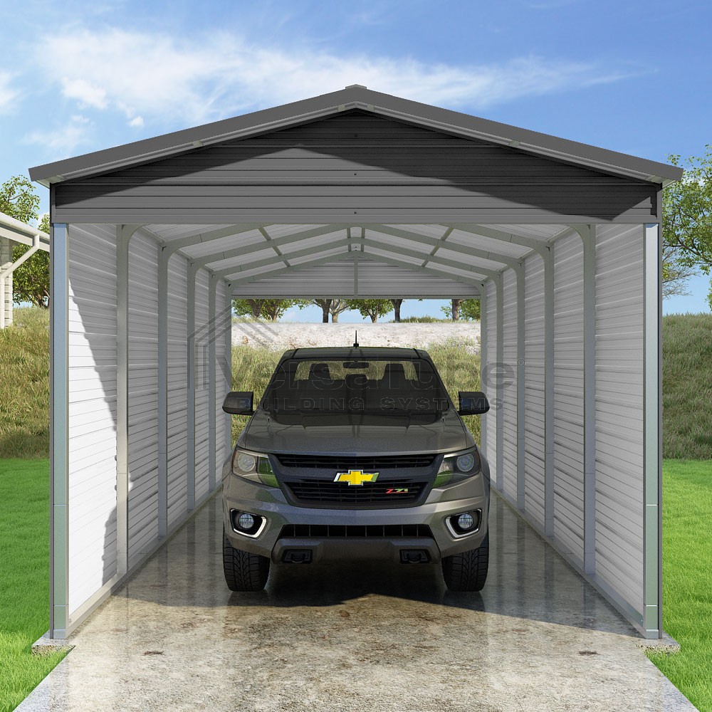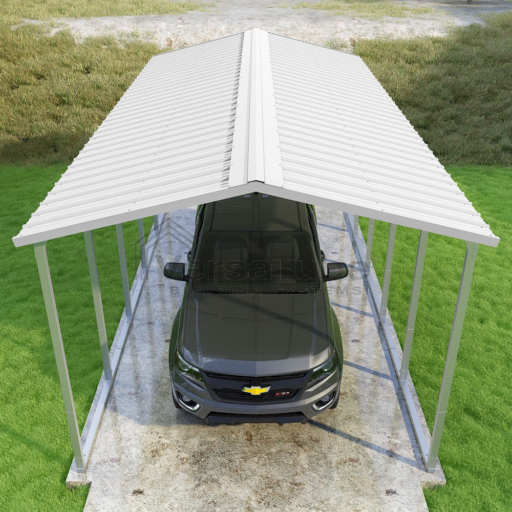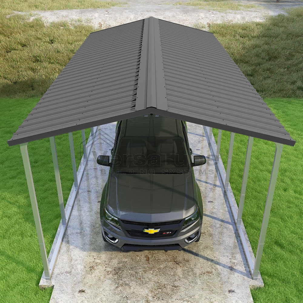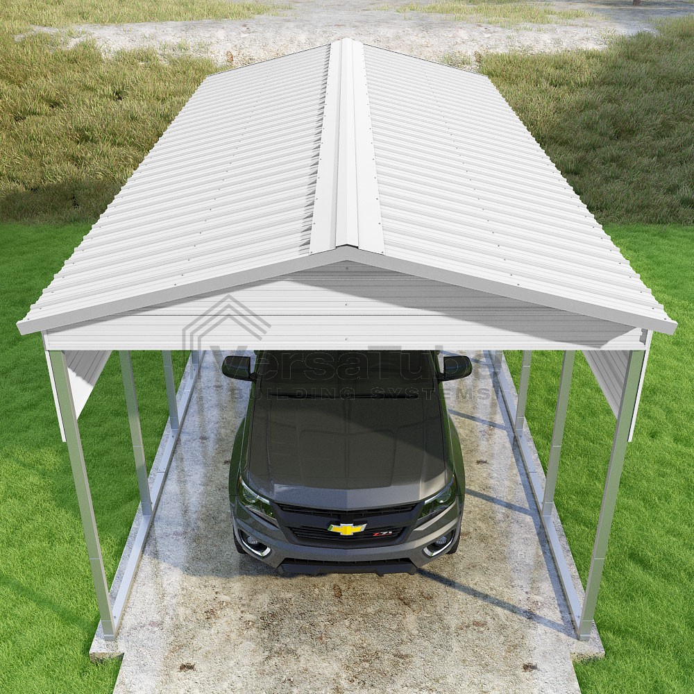 Pinnacle Series DIY carport kit features vertical sheet metal roof panels with ridge cap, gable and eave trim for an A-frame roof style and extended coverage on both ends.