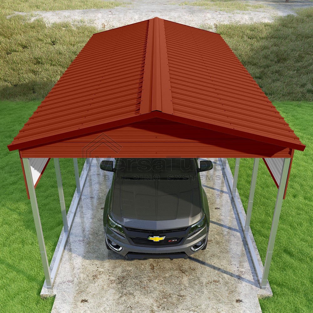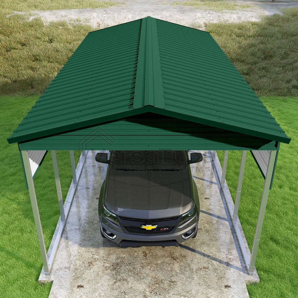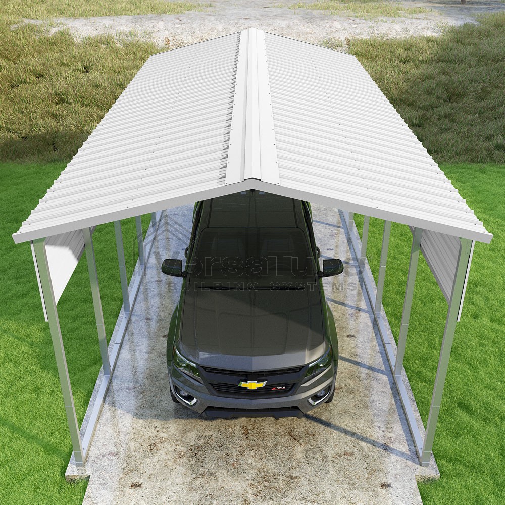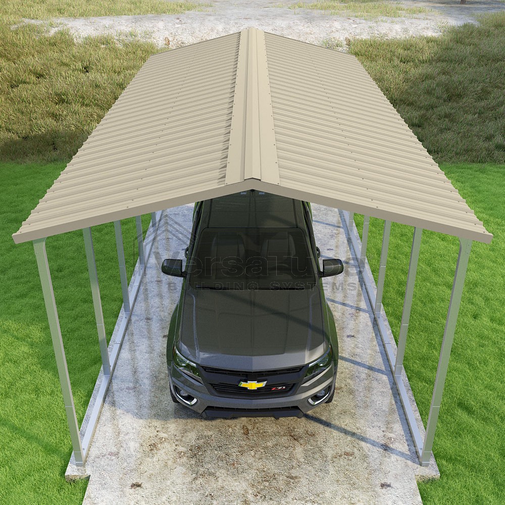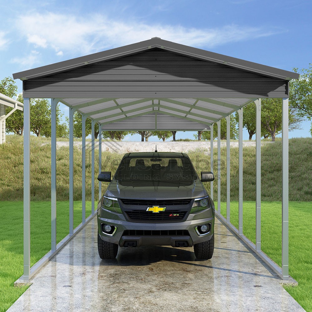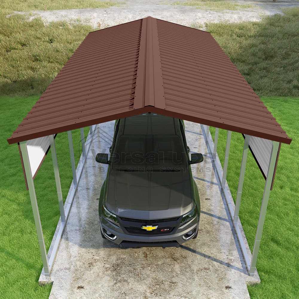 Pinnacle Series DIY carport kit features vertical sheet metal roof panels with ridge cap, gable and eave trim for an A-frame roof style and extended coverage on both ends.
