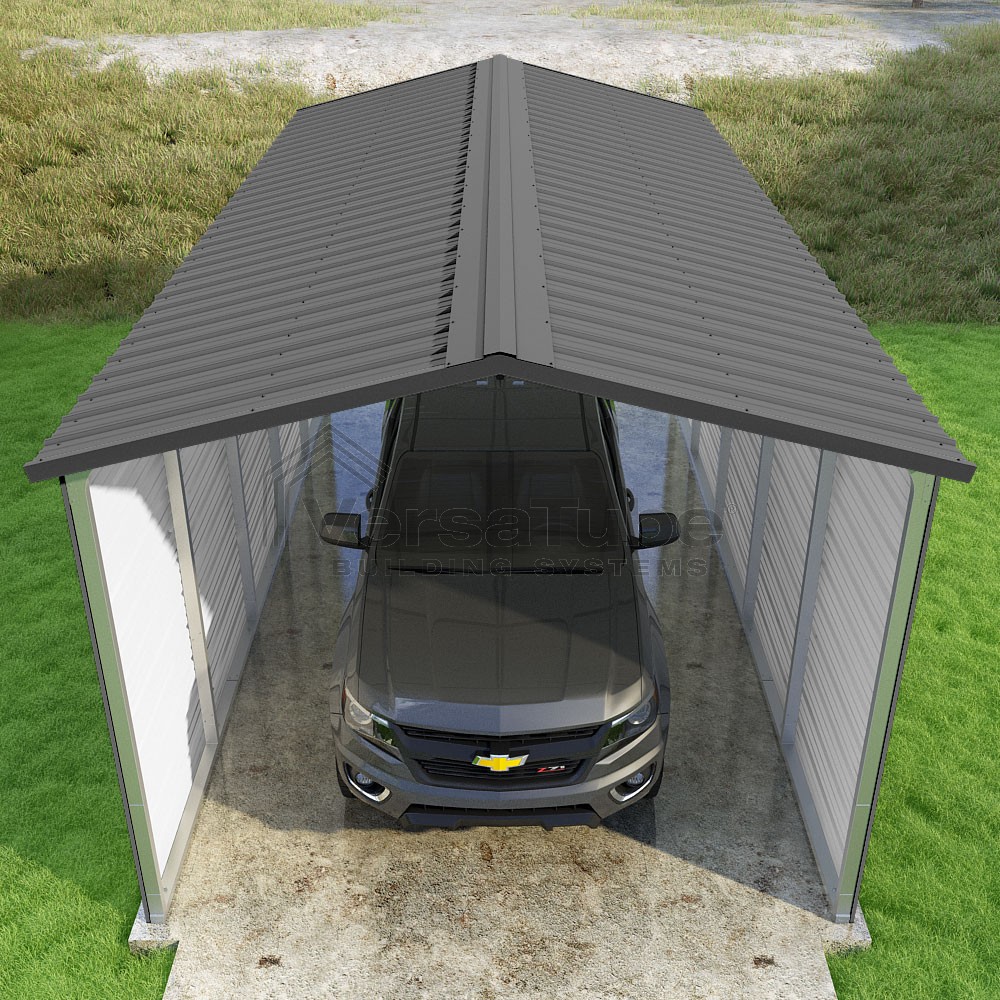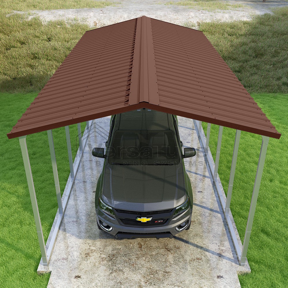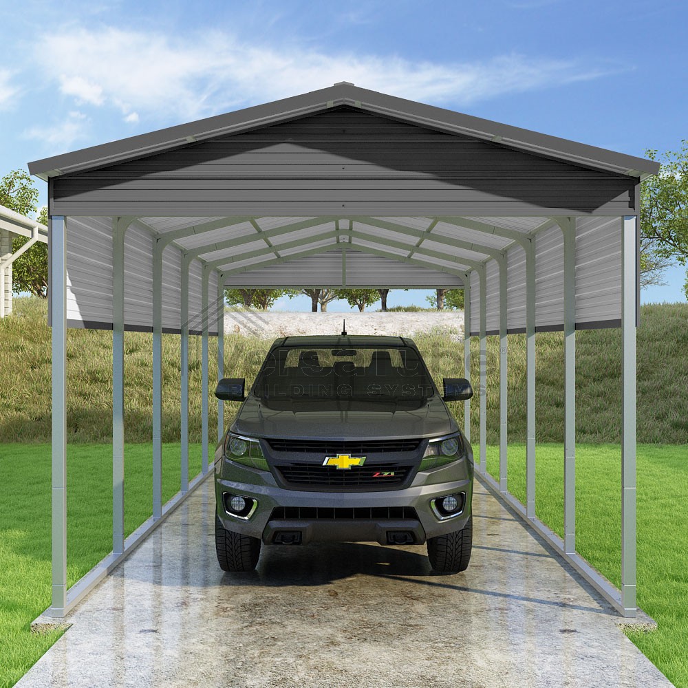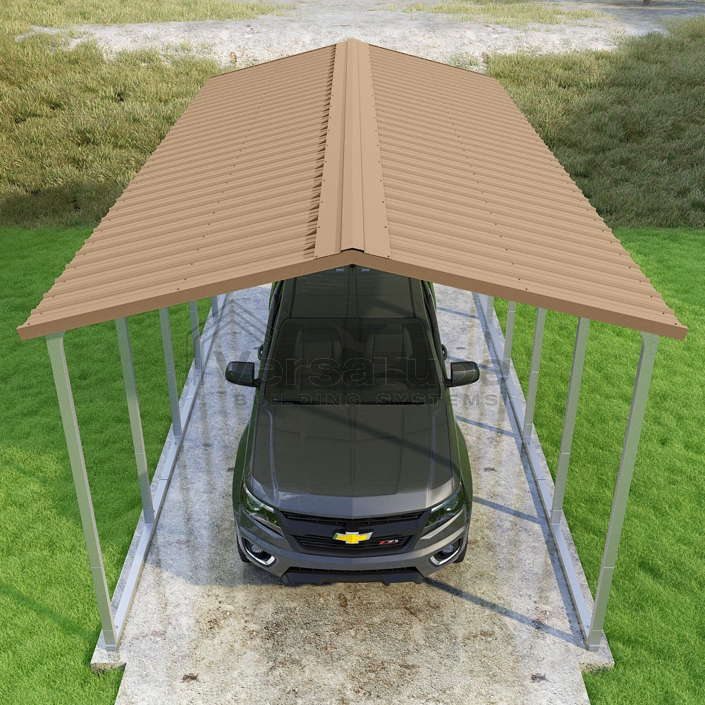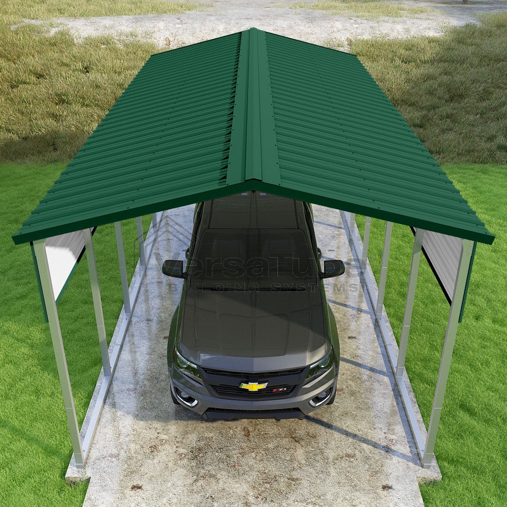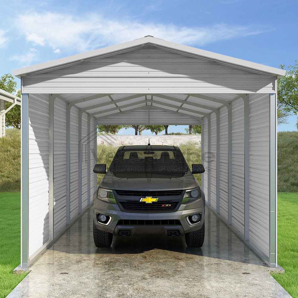 Pinnacle Series DIY carport kit features vertical sheet metal roof panels with ridge cap, gable and eave trim for an A-frame roof style and extended coverage on both ends.