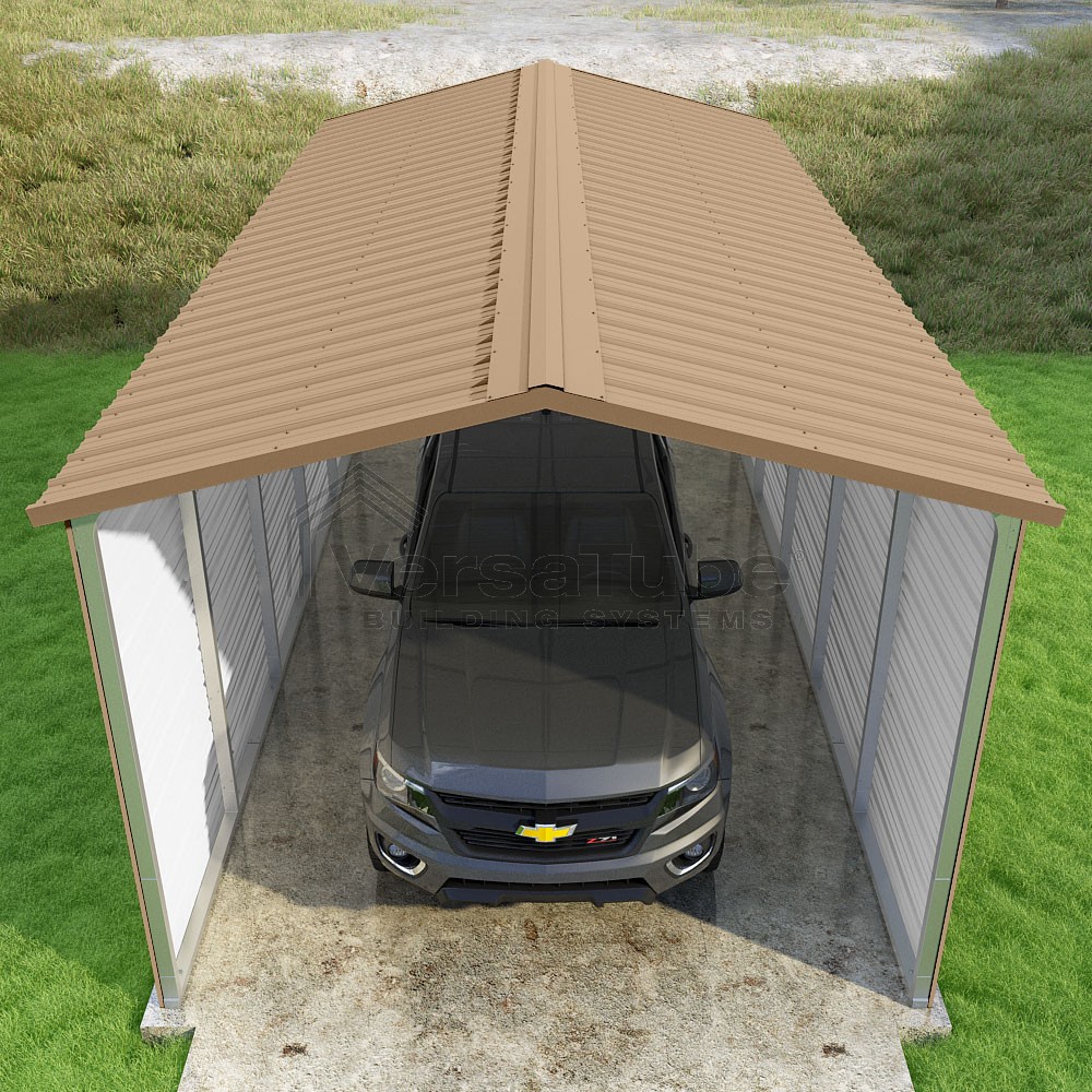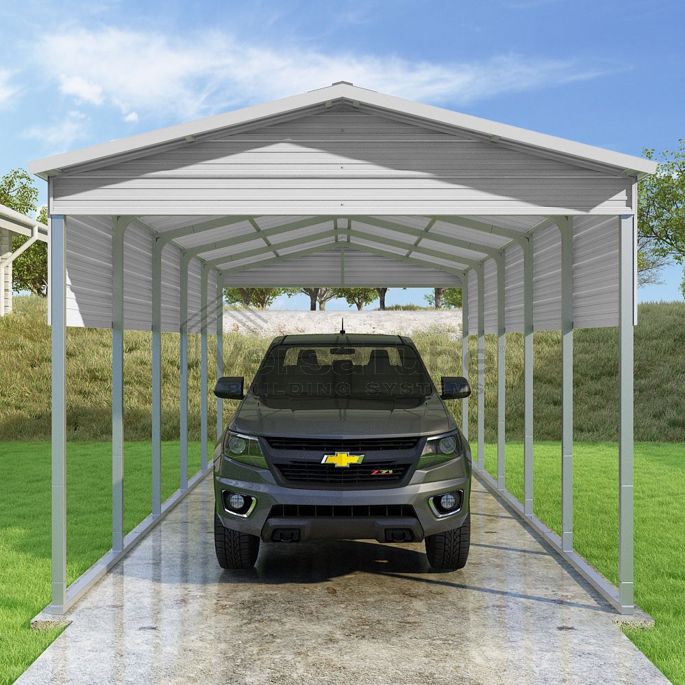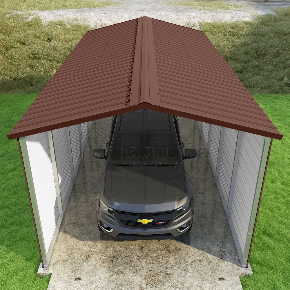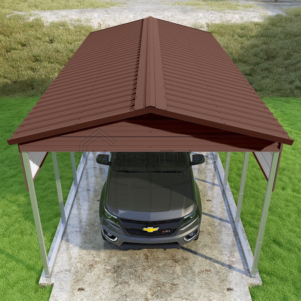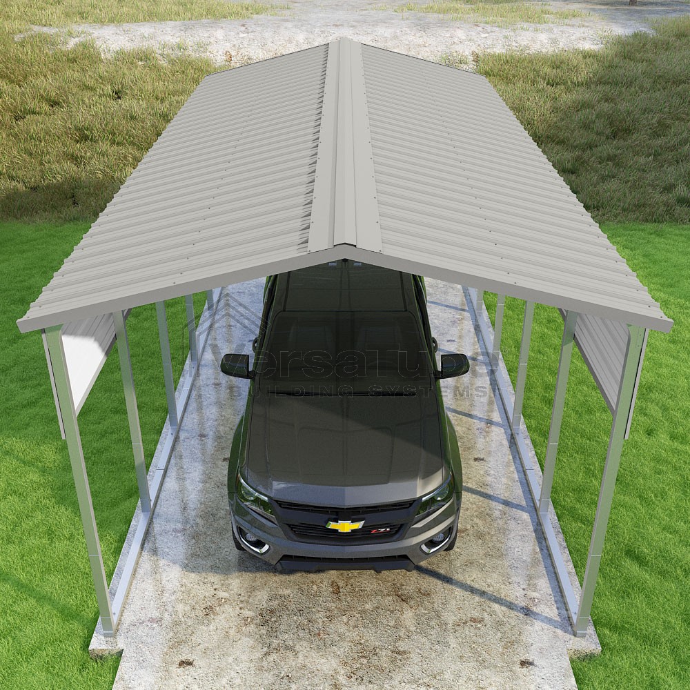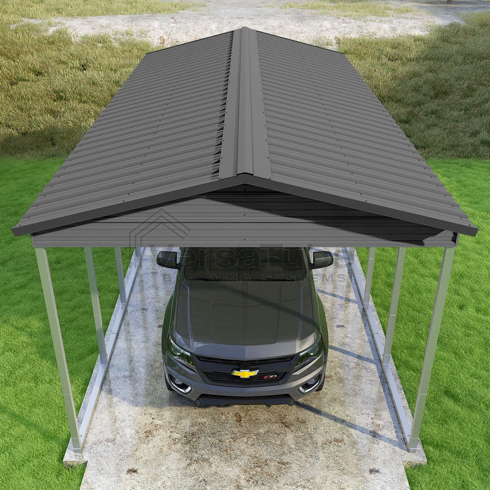 Pinnacle Series DIY carport kit features vertical sheet metal roof panels with ridge cap, gable and eave trim for an A-frame roof style and extended coverage on both ends.