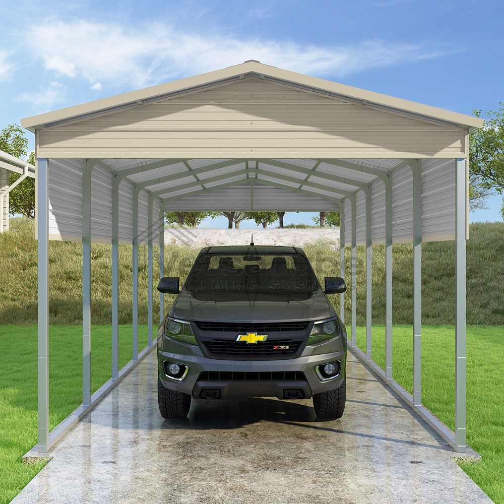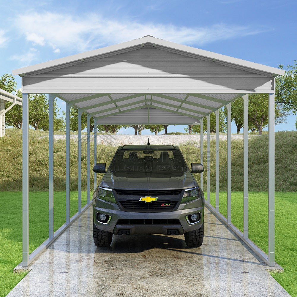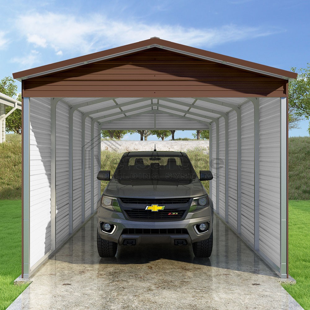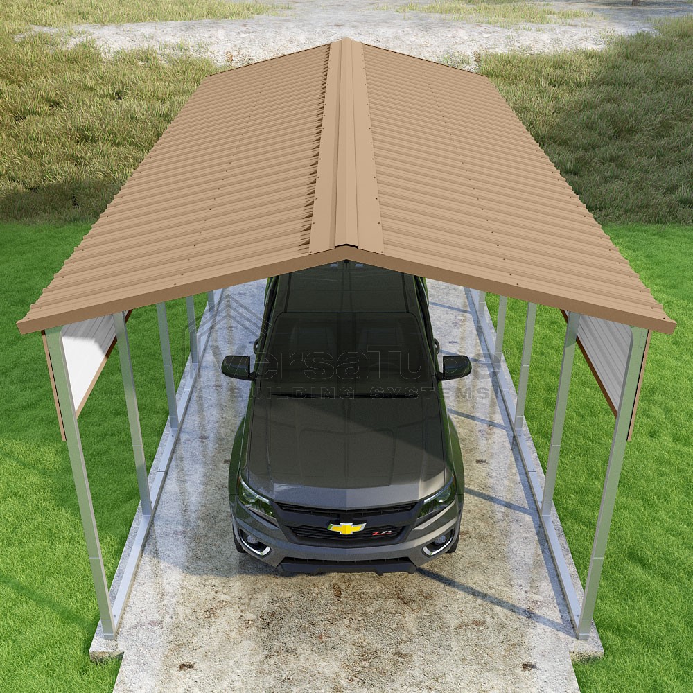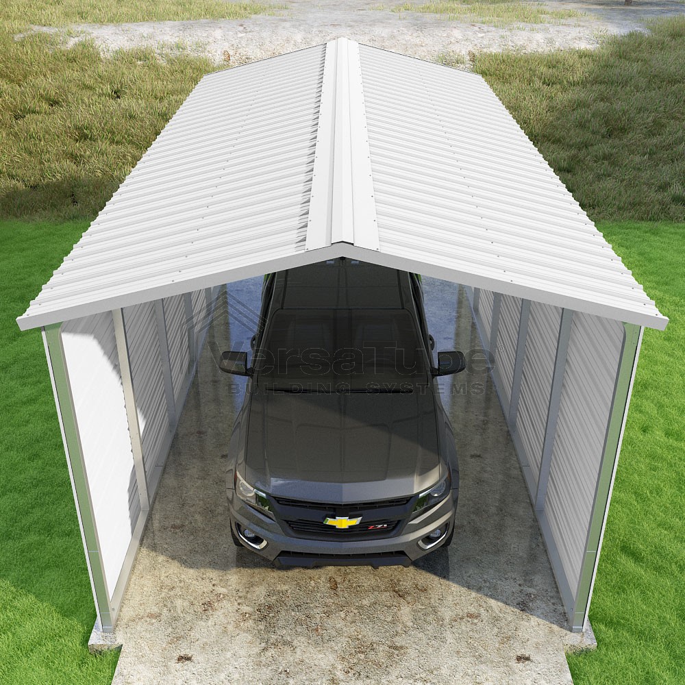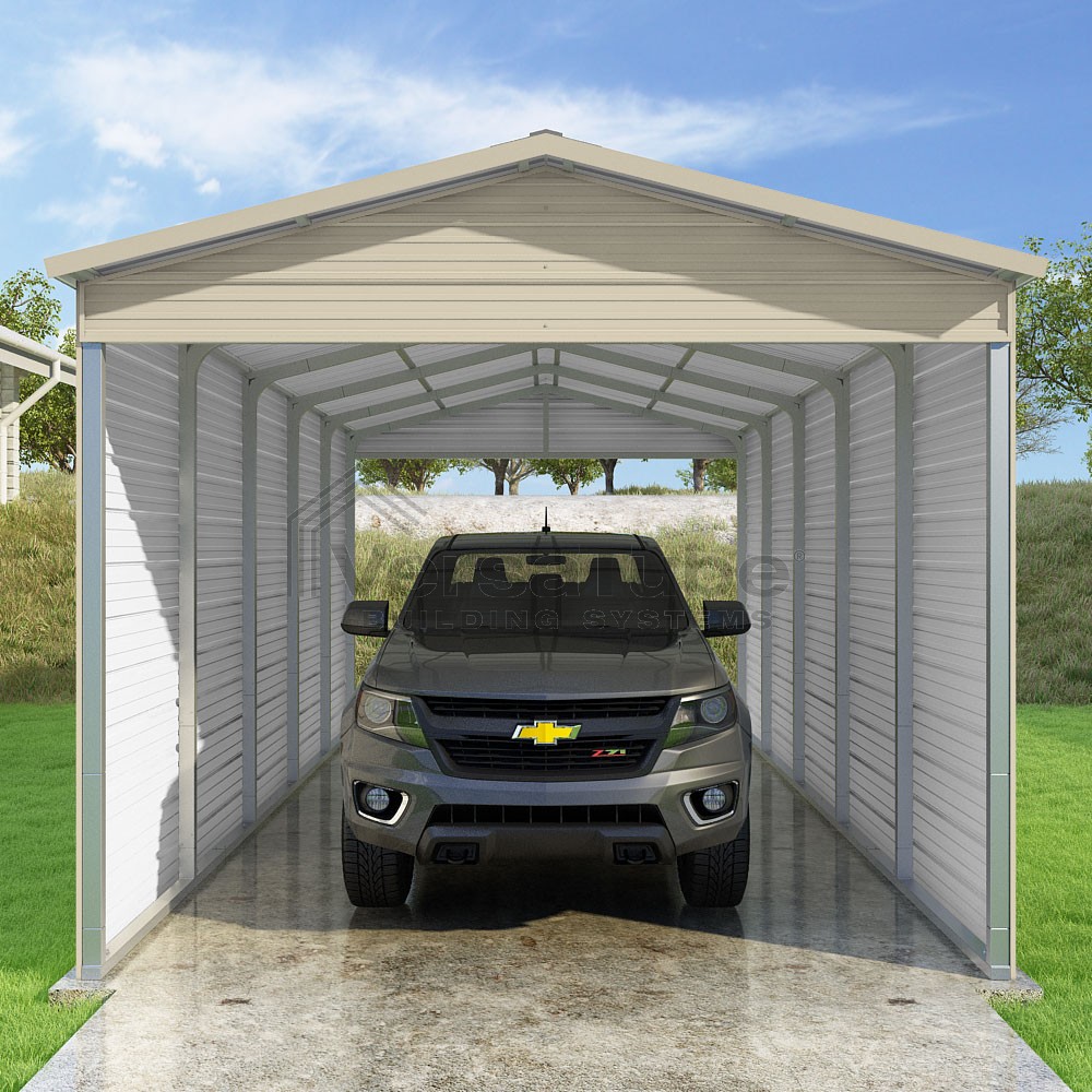 Pinnacle Series DIY carport kit features vertical sheet metal roof panels with ridge cap, gable and eave trim for an A-frame roof style and extended coverage on both ends.